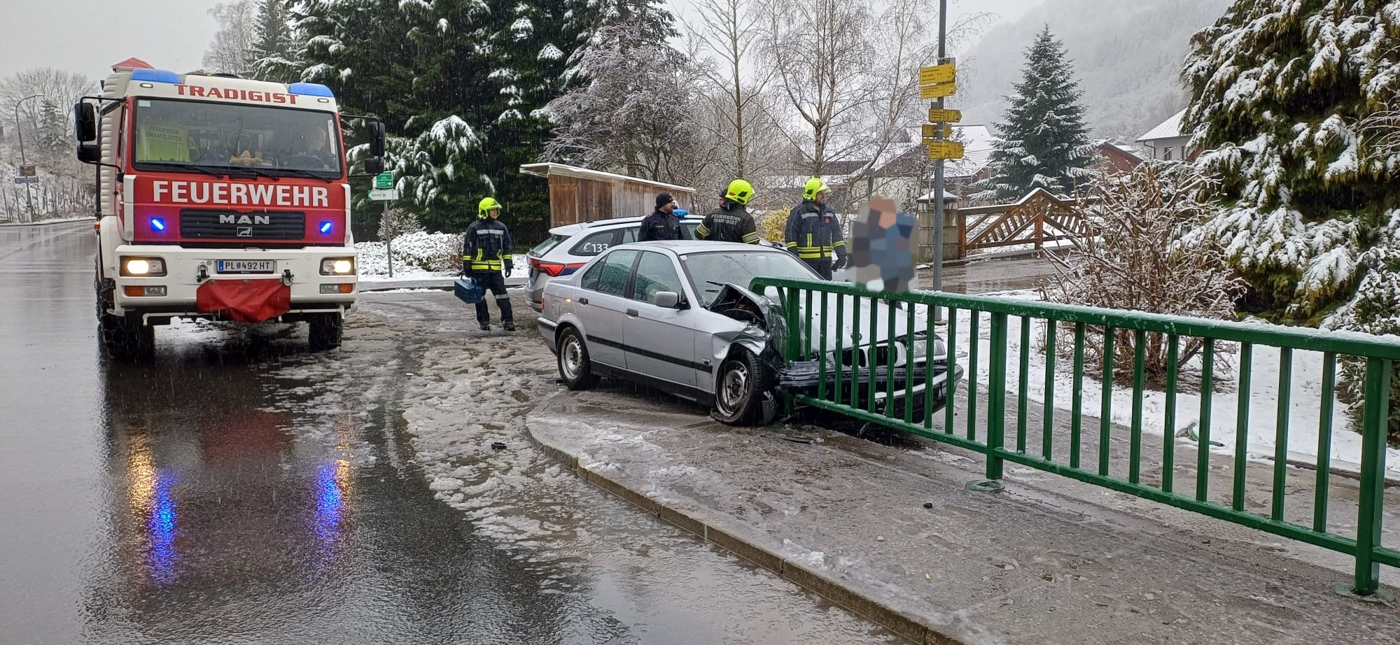 Bei unserer Ankunft stellten wir fest, dass es im Zuge eines Überholmanövers zu einer Kollision zweier PKW gekommen war. Ein Fahrzeug wollte abbiegen, während der nachfolgende PKW zum Überholen angesetzt hatte. Dabei kam es zur Kollision, woraufhin der überholende PKW gegen das Brückengeländer prallte.