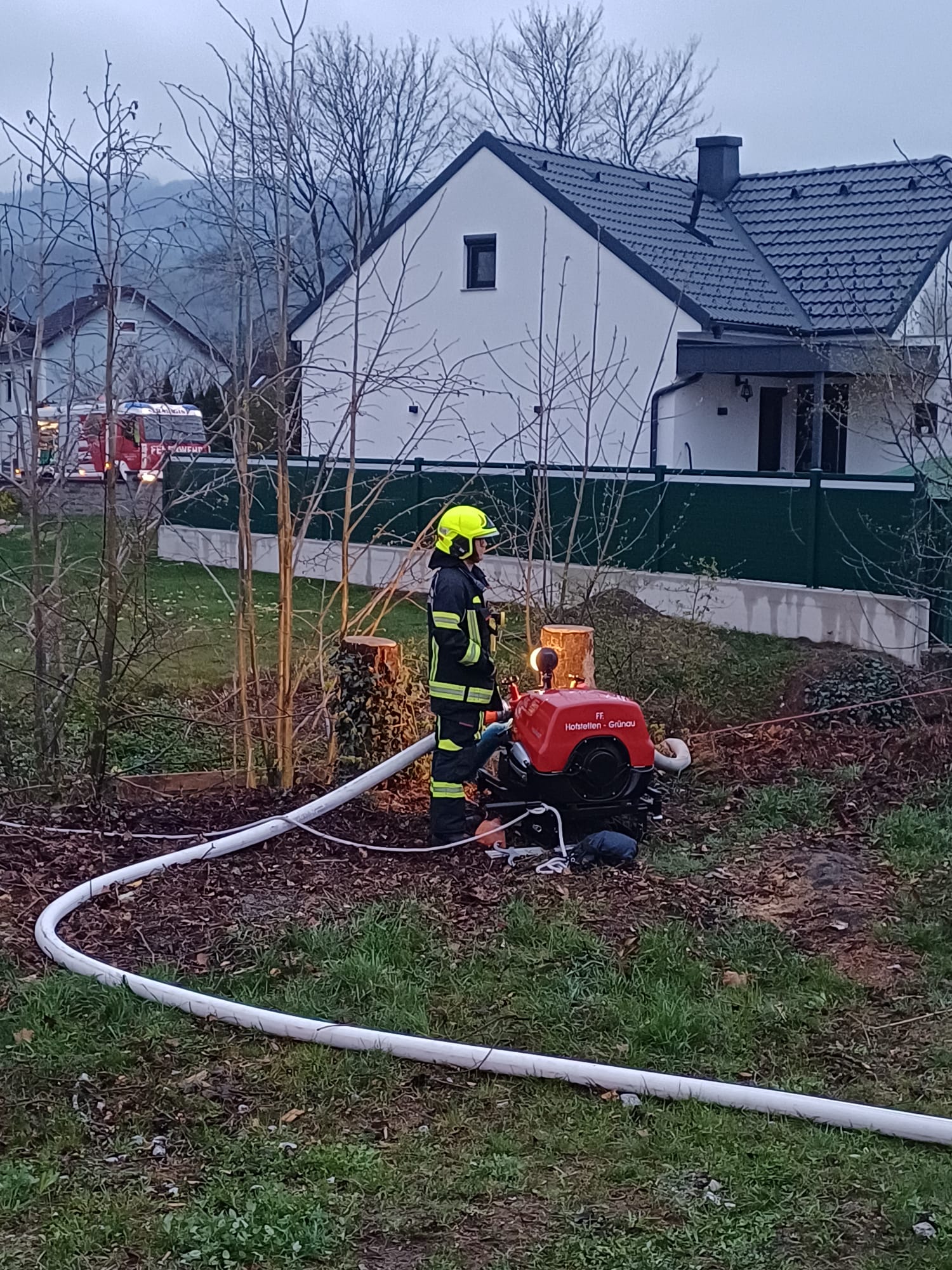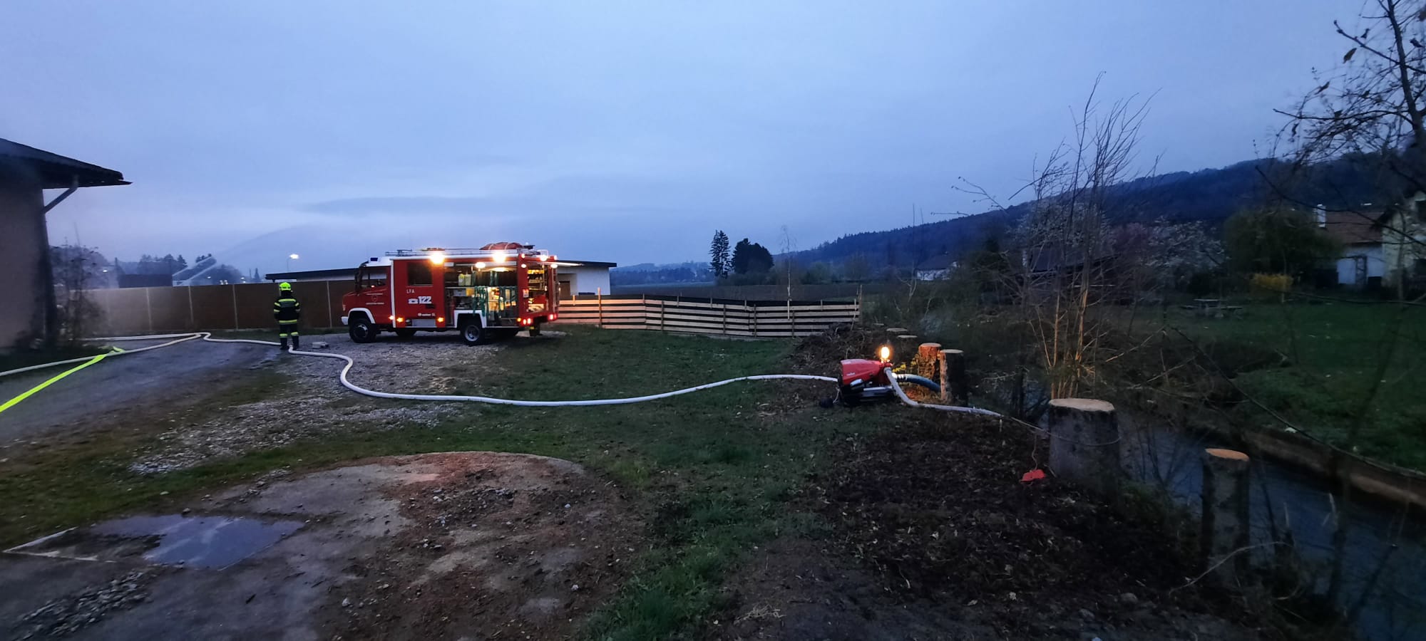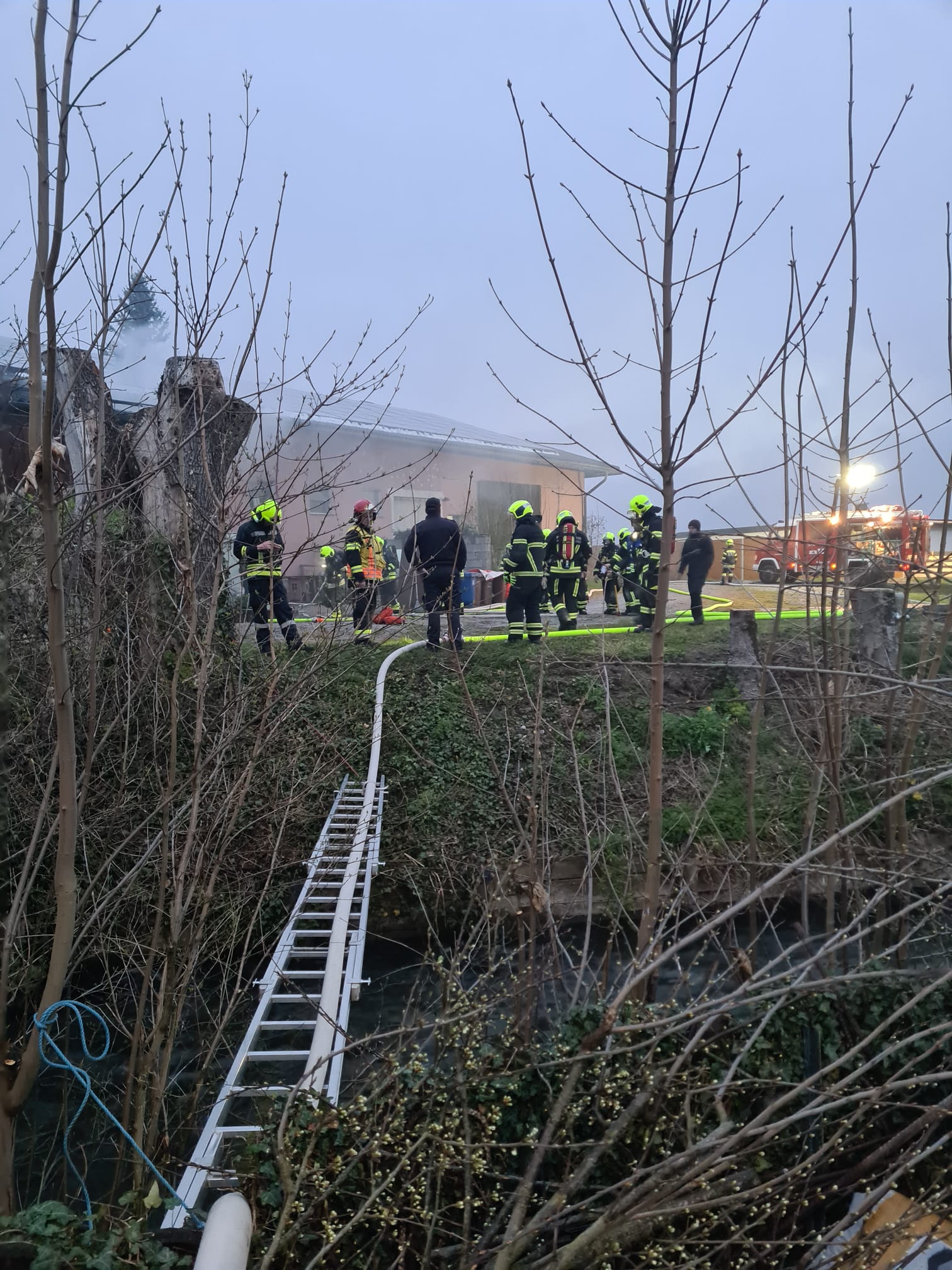 Unsere Aufgabe bestand darin, mit der Mannschaft des Tanklöschfahrzeugs einen Atemschutztrupp zu stellen und gleichzeitig bei der Sicherstellung der Wasserversorgung zu unterstützen. Diese wurde über einen Hydranten, welcher sich auf der anderen Seite eines Baches befand, mittels Steckleitern sichergestellt.
