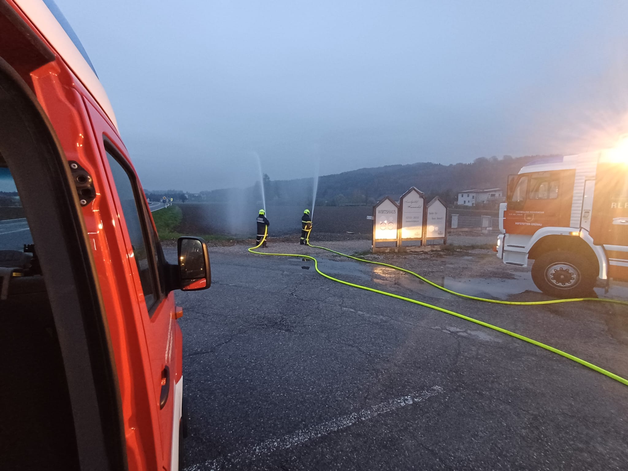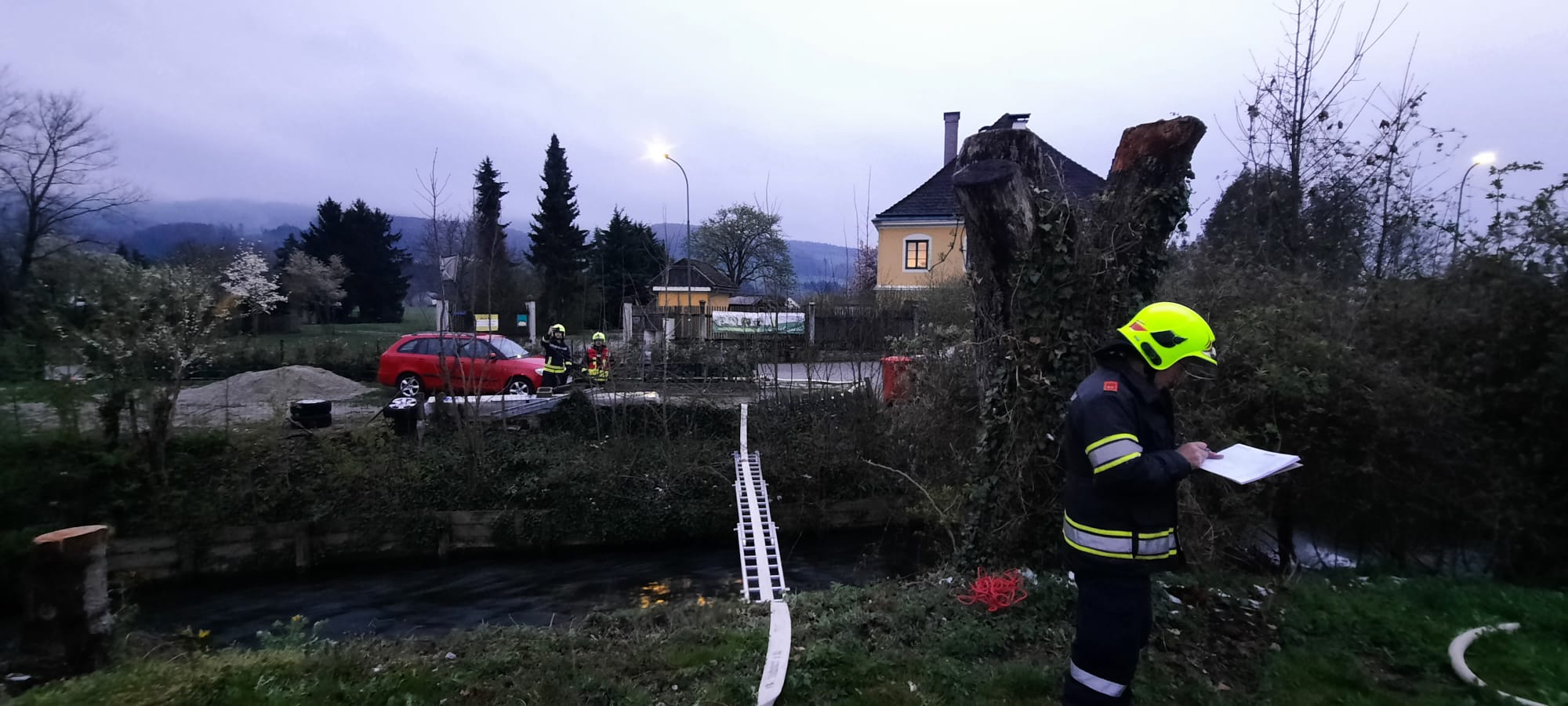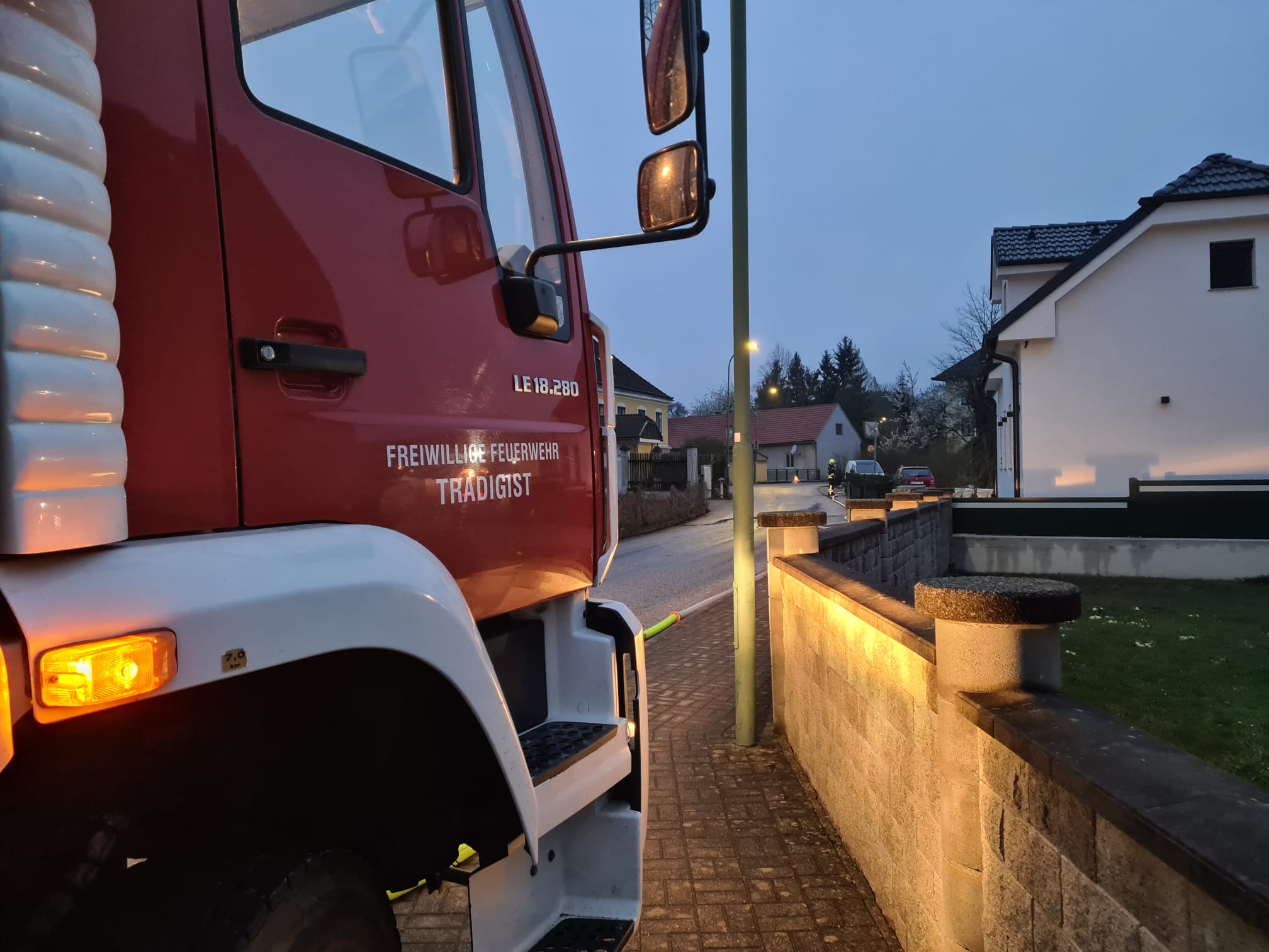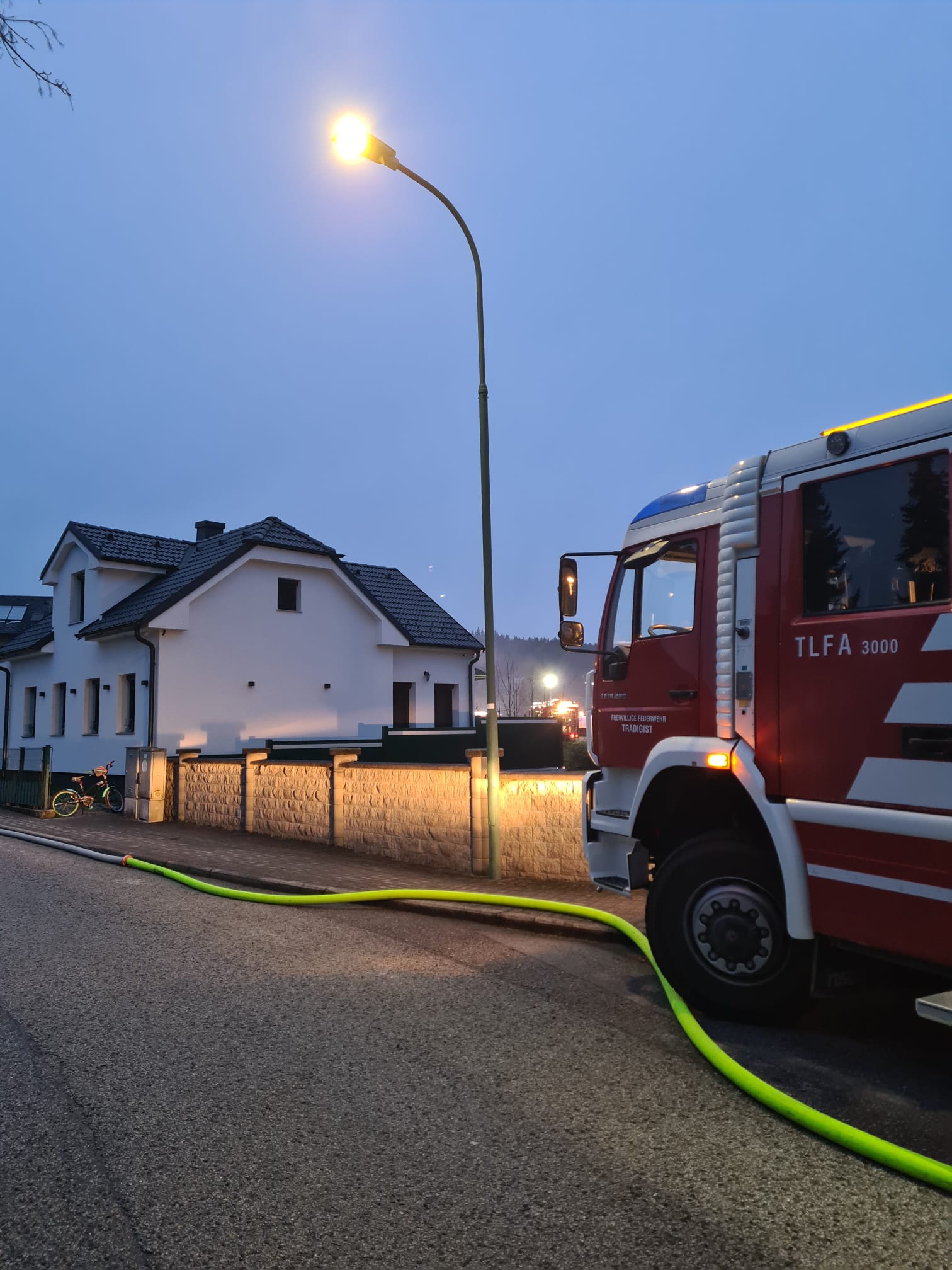 Unsere Aufgabe bestand darin, mit der Mannschaft des Tanklöschfahrzeugs einen Atemschutztrupp zu stellen und gleichzeitig bei der Sicherstellung der Wasserversorgung zu unterstützen. Diese wurde über einen Hydranten, welcher sich auf der anderen Seite eines Baches befand, mittels Steckleitern sichergestellt.