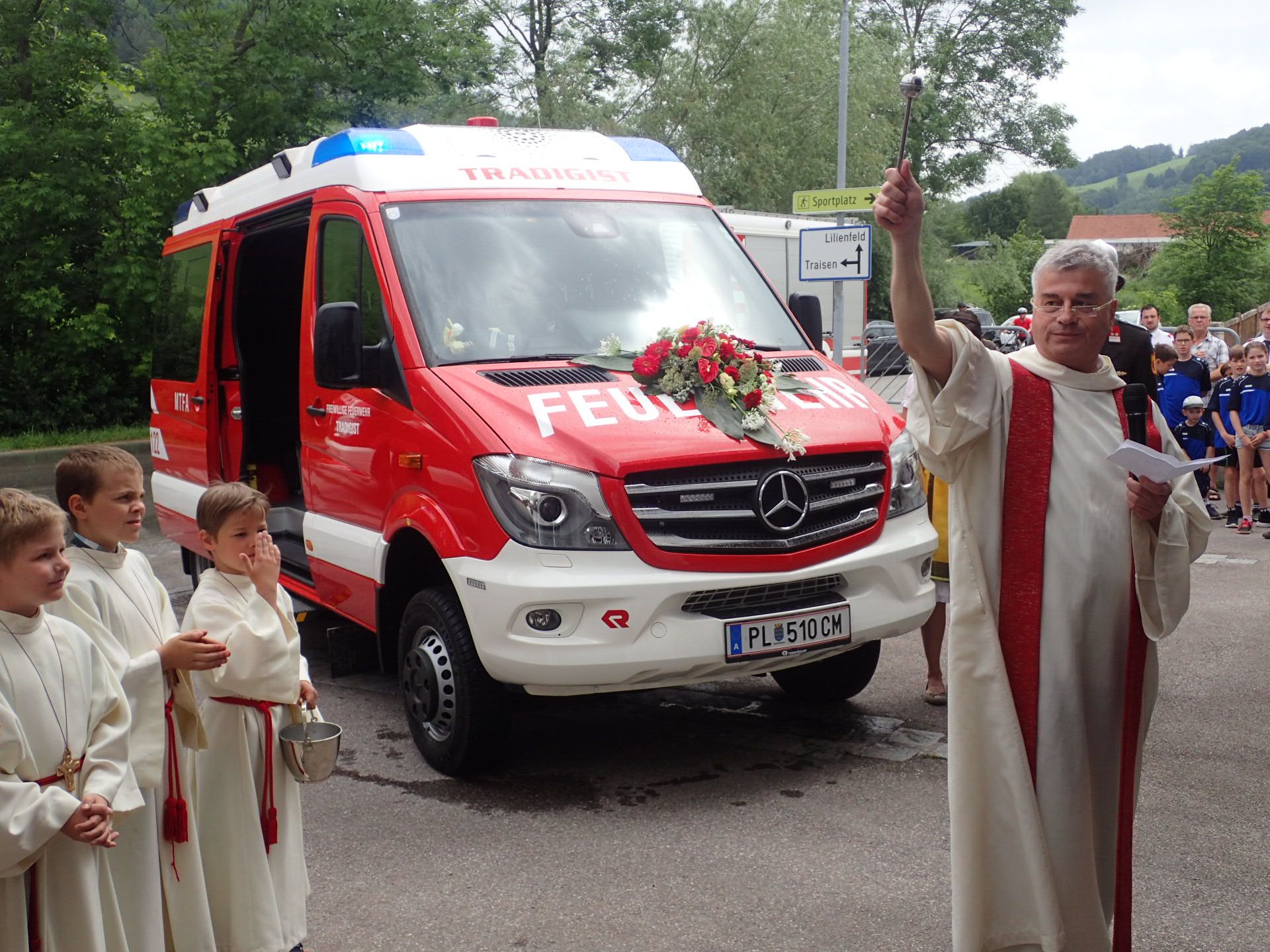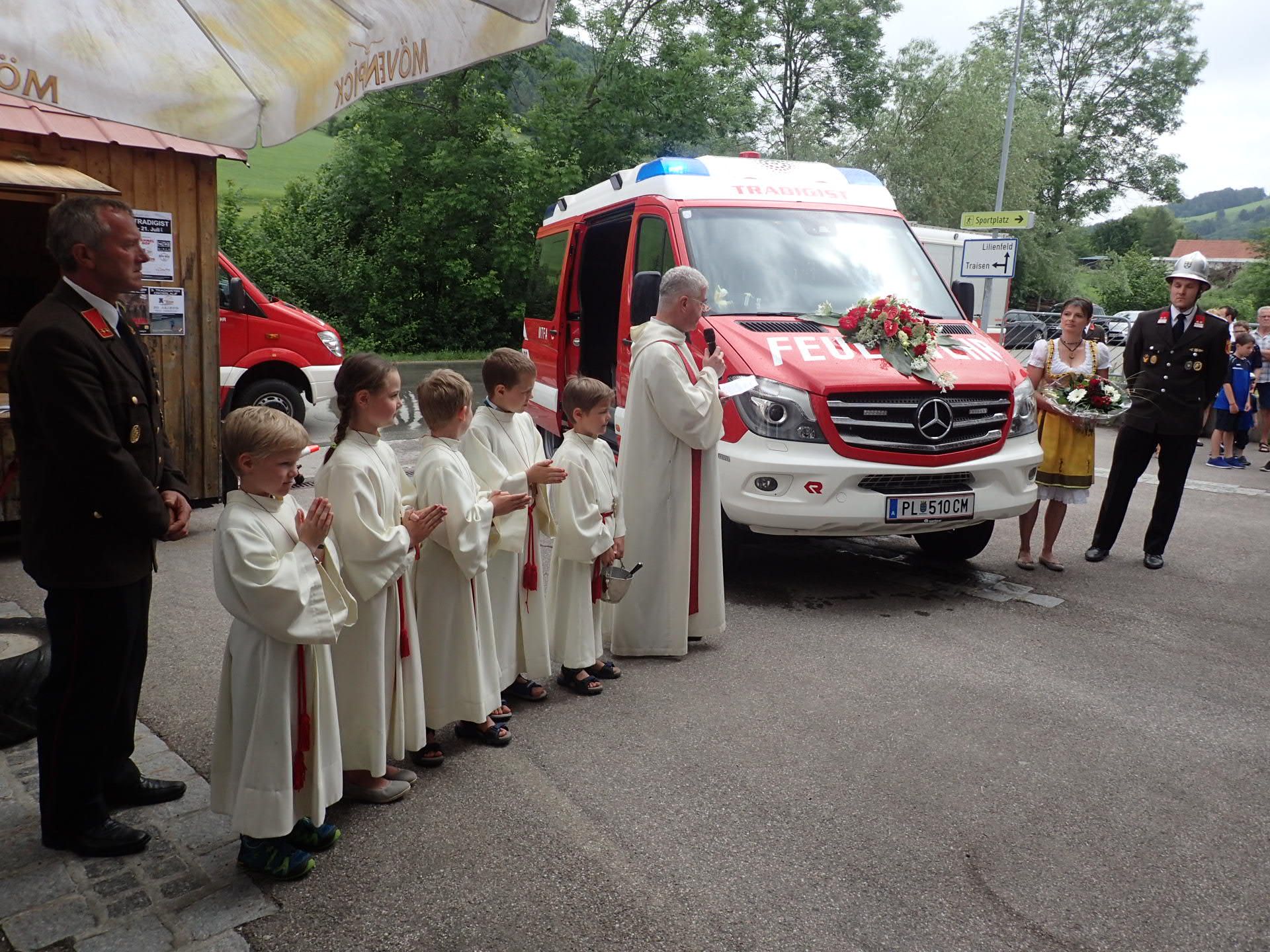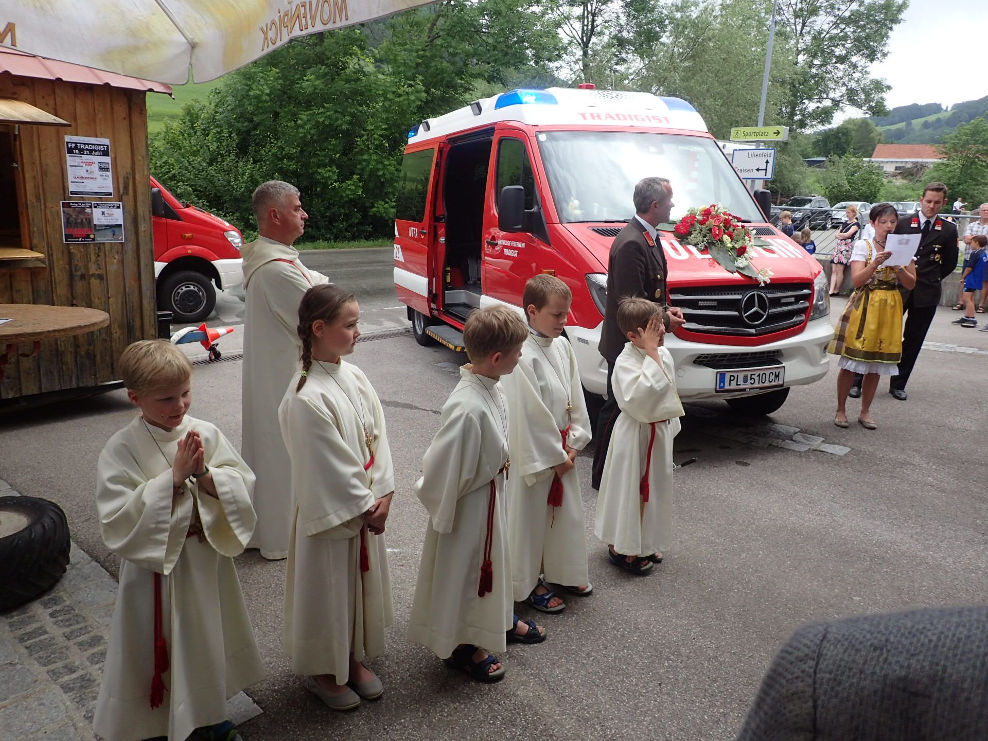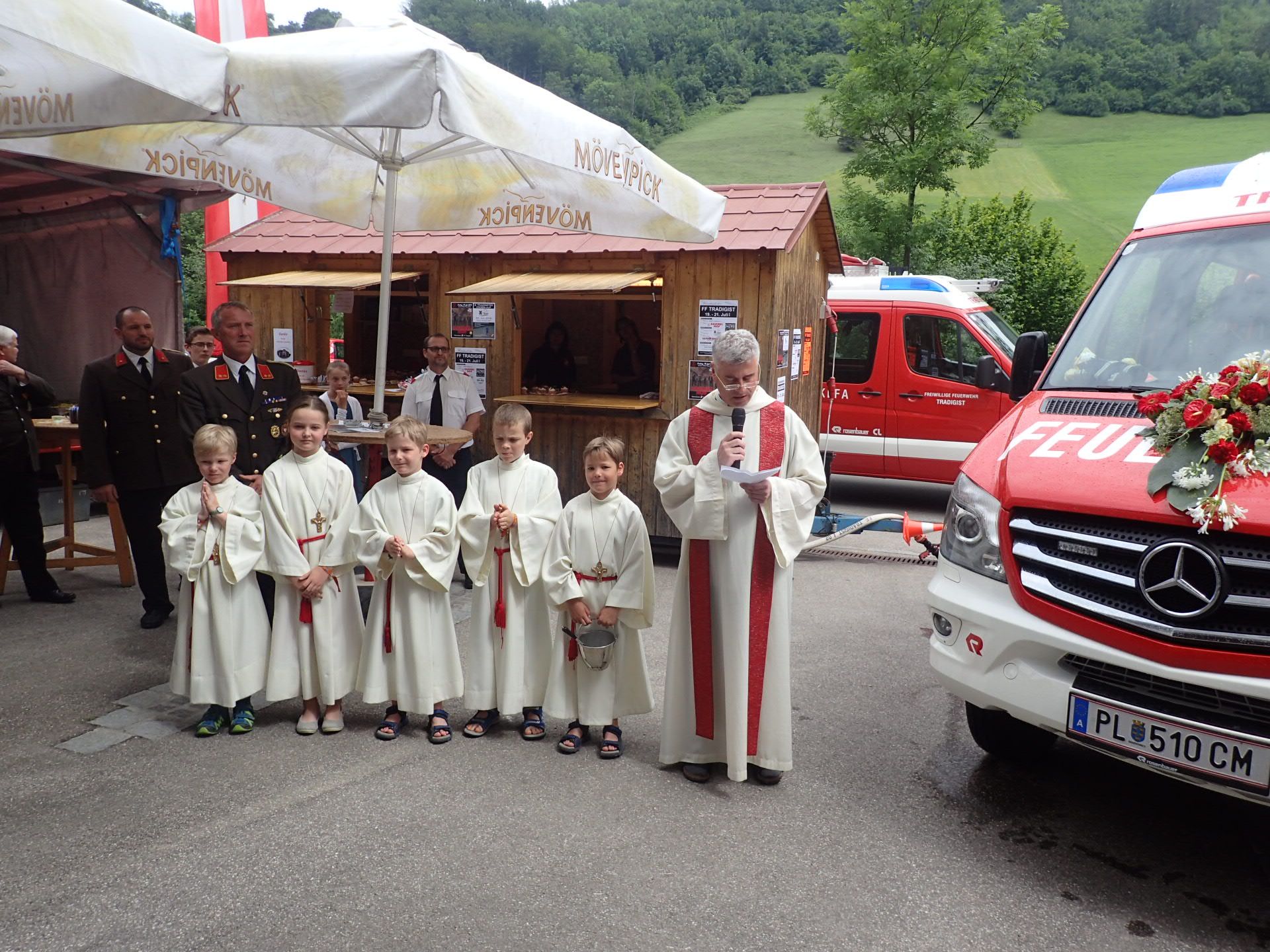 Am Pfingstmontag, 10.06.2019 folgten zahlreiche Gäste unserer Einladung zur Fahrzeugsegnung und zum Tag der offenen Tür. Die Heilige Messe wurde von Pater Johannes im FF-Haus zelebriert und vom Tradigister Fünfgsang musikalisch gestaltet. Im Anschluss erfolgte die feierlicher Segnung des neuen Einsatzfahrzeugs dessen Patin Melanie Fuxsteiner ist. Bei kühlen Getränken und Speisen vom Grill genossen wir den schönen Feiertag. Unsere kleinen Gäste freuten sich über die Hüpfburg sowie Zielspritzen mit Feuerwehrdrachen Grisu.