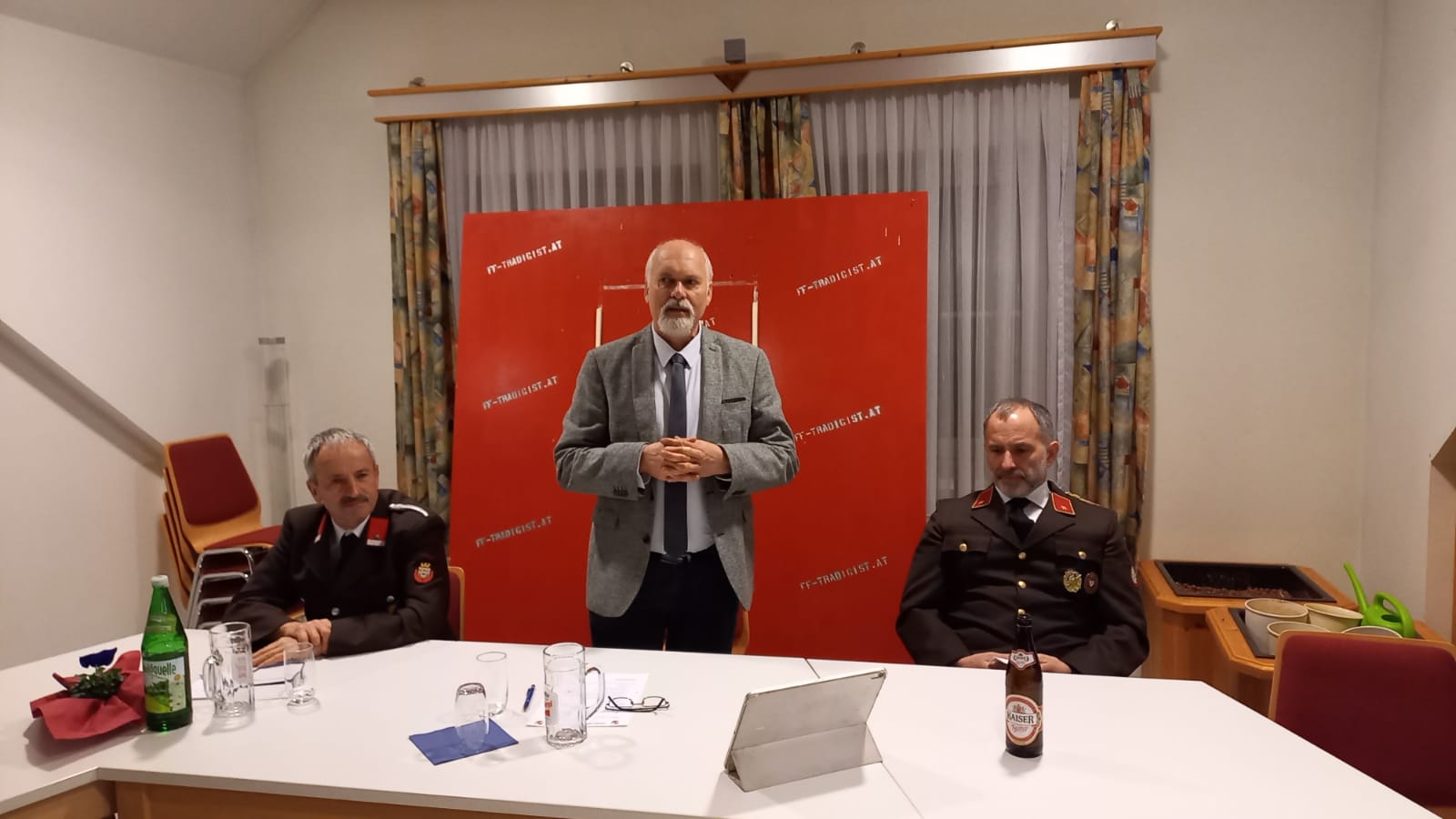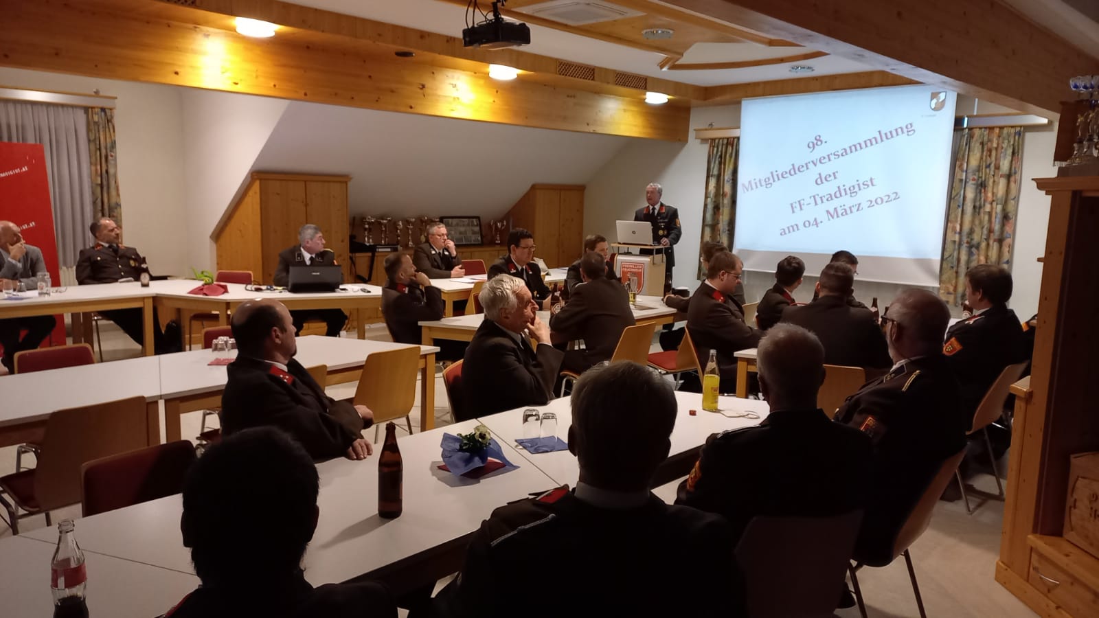 Kommandant Andreas Veitinger begrüßte bei der 98. Mitgliederversammlung in Tradigist seine Mannschaft sowie die Vertreter*innen des Abschnittsfeuerwehrkommandos und der Gemeinden Kirchberg an der Pielach und Rabenstein.