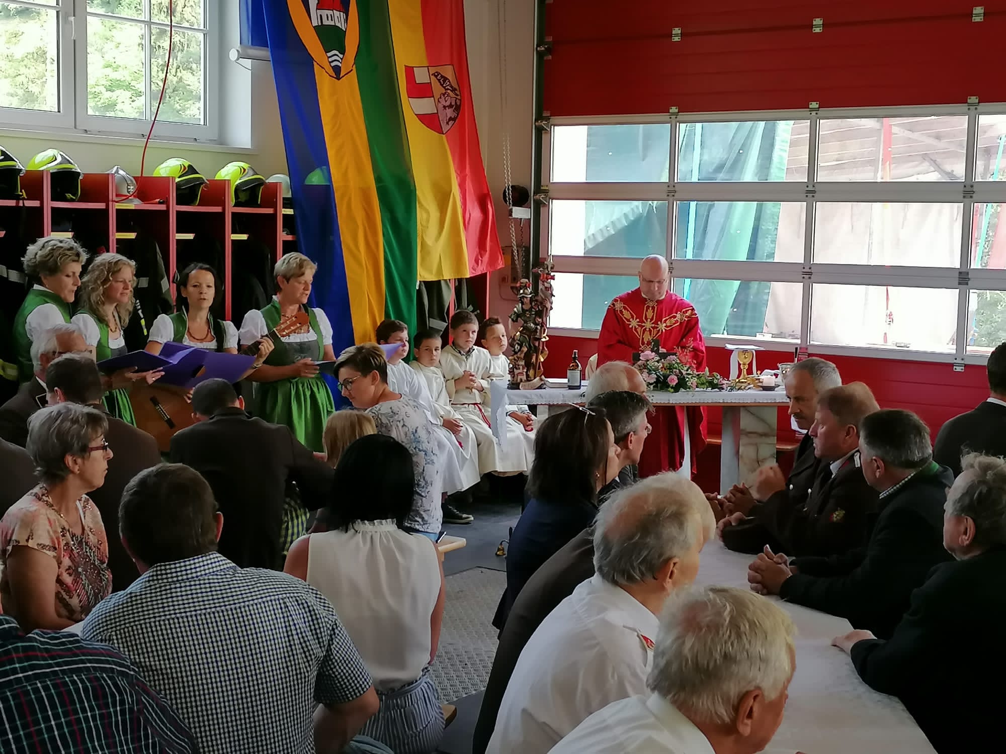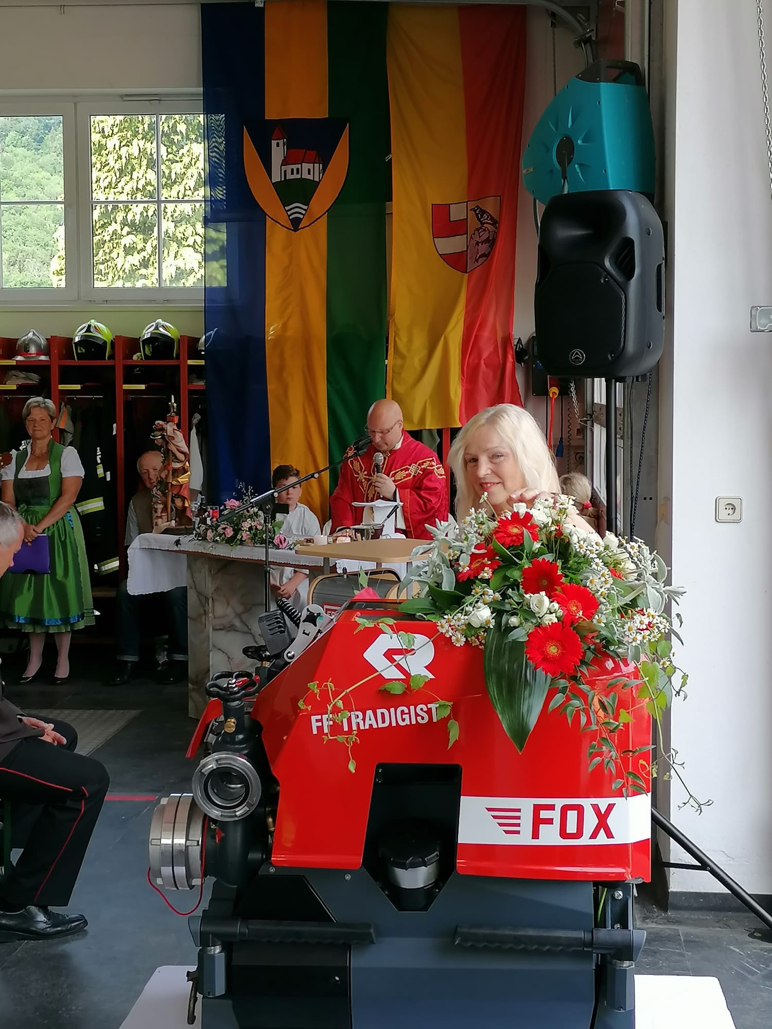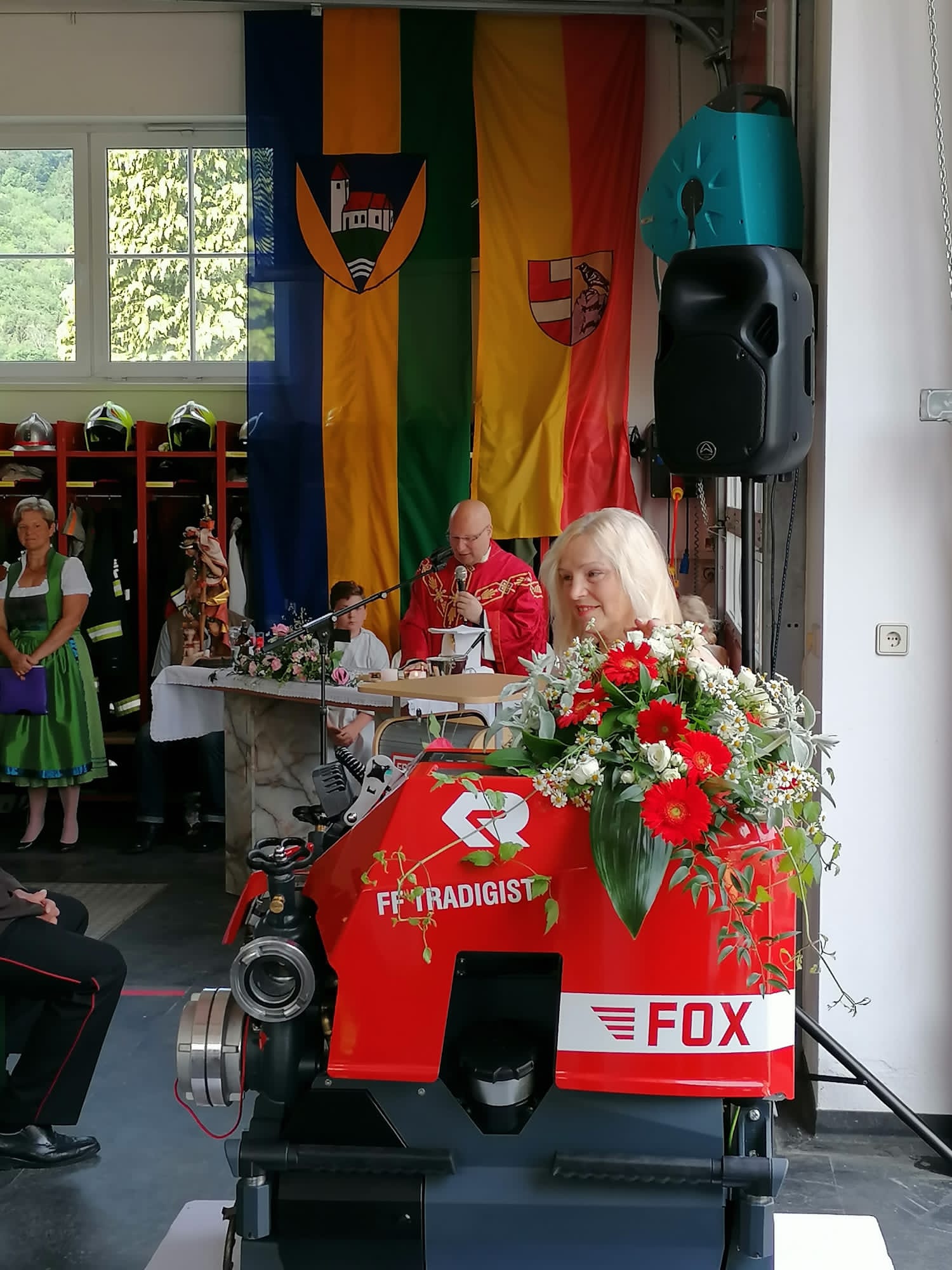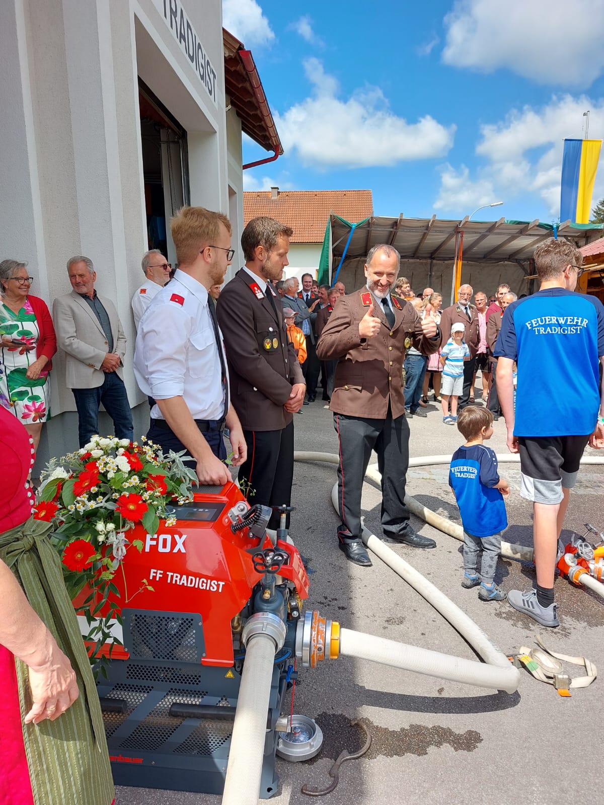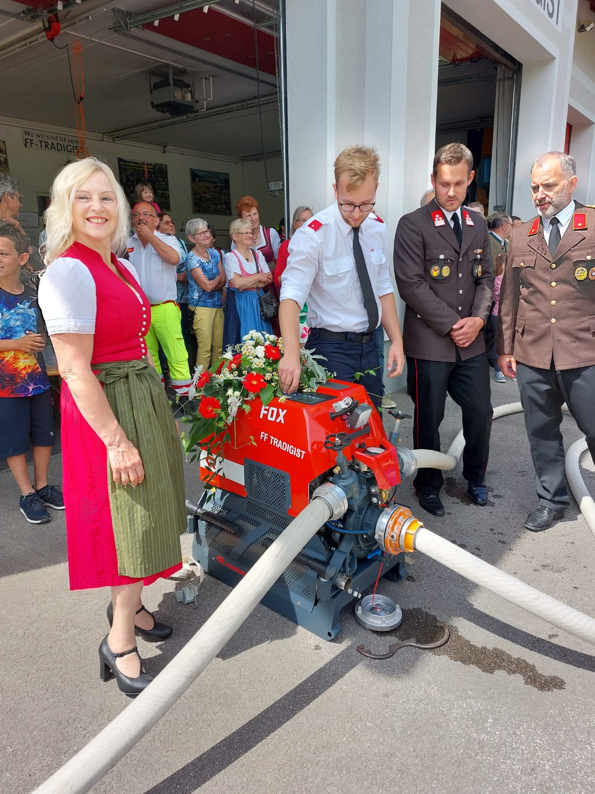 Die Heilige Messe wurde von Pater Leonhard im FF-Haus zelebriert und vom Tradigister Fünfg`sang musikalisch umrahmt. Während der Messe erfolgte die feierliche Segnung der neuen Tragkraftspritze deren Patin Brigitte Schmid ist. Nach den Ansprachen des Kommandanten und der beiden Bürgermeister wurde von den Tradigister Kindern ein bereits zuvor geübter Löschangriff mit 6 Strahlrohren und der neuen Tragkraftspritze gezeigt.