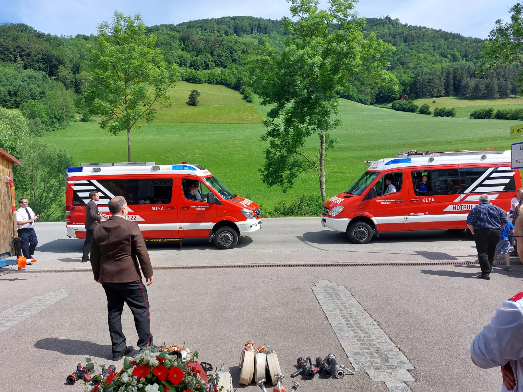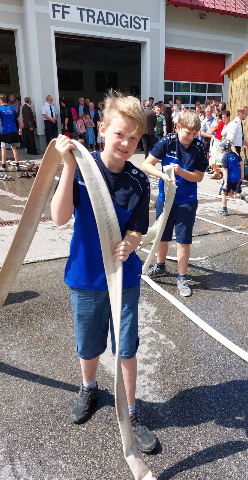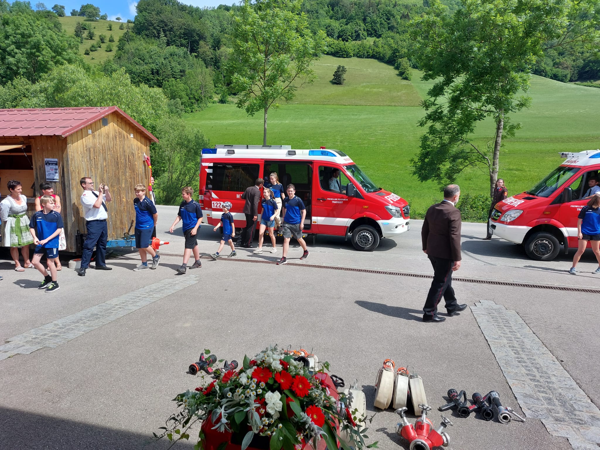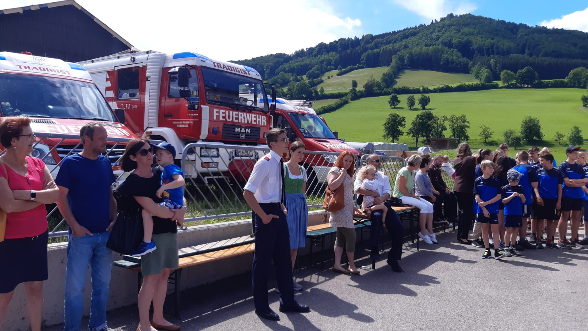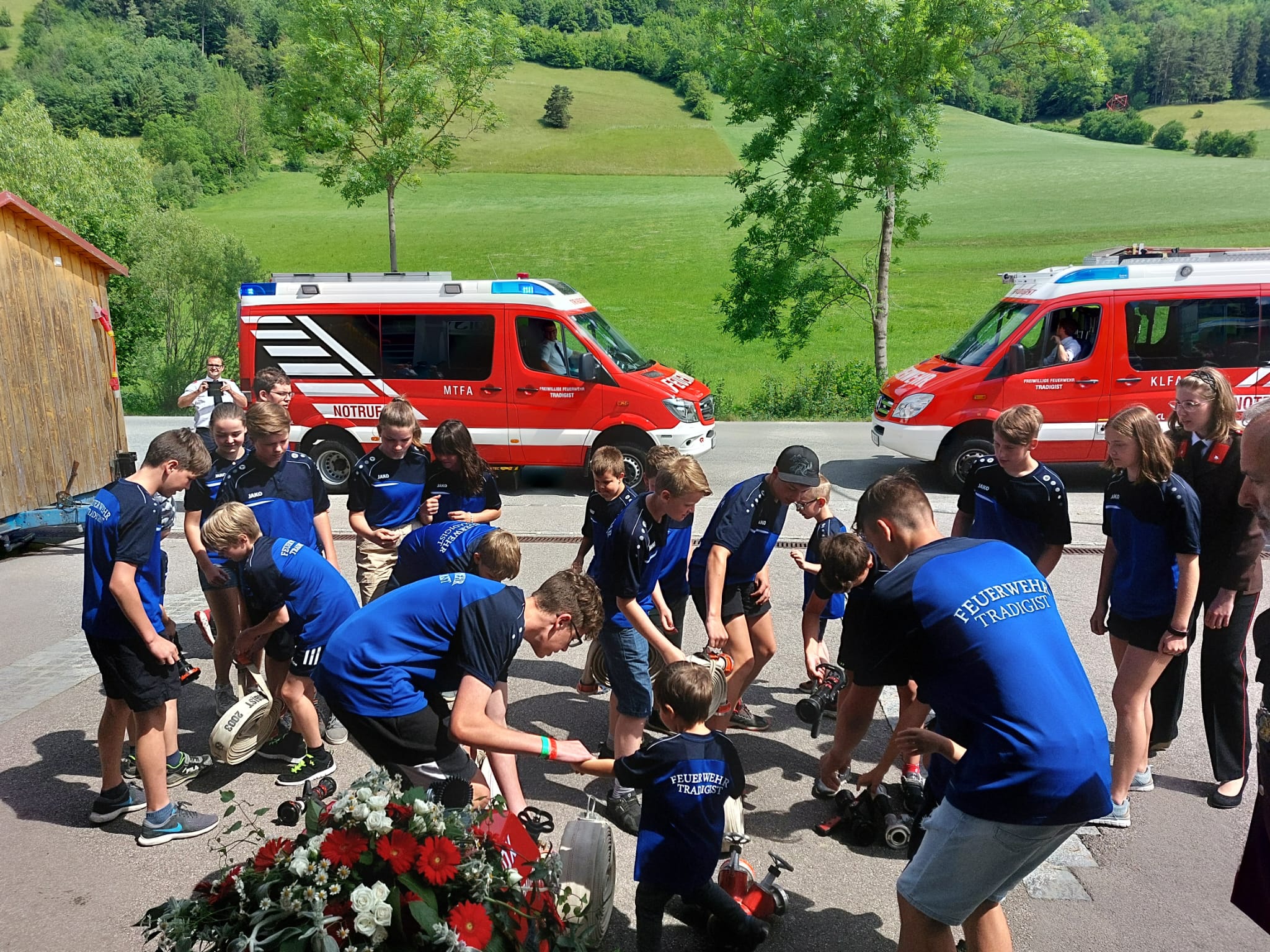 Die Heilige Messe wurde von Pater Leonhard im FF-Haus zelebriert und vom Tradigister Fünfg`sang musikalisch umrahmt. Während der Messe erfolgte die feierliche Segnung der neuen Tragkraftspritze deren Patin Brigitte Schmid ist. Nach den Ansprachen des Kommandanten und der beiden Bürgermeister wurde von den Tradigister Kindern ein bereits zuvor geübter Löschangriff mit 6 Strahlrohren und der neuen Tragkraftspritze gezeigt.