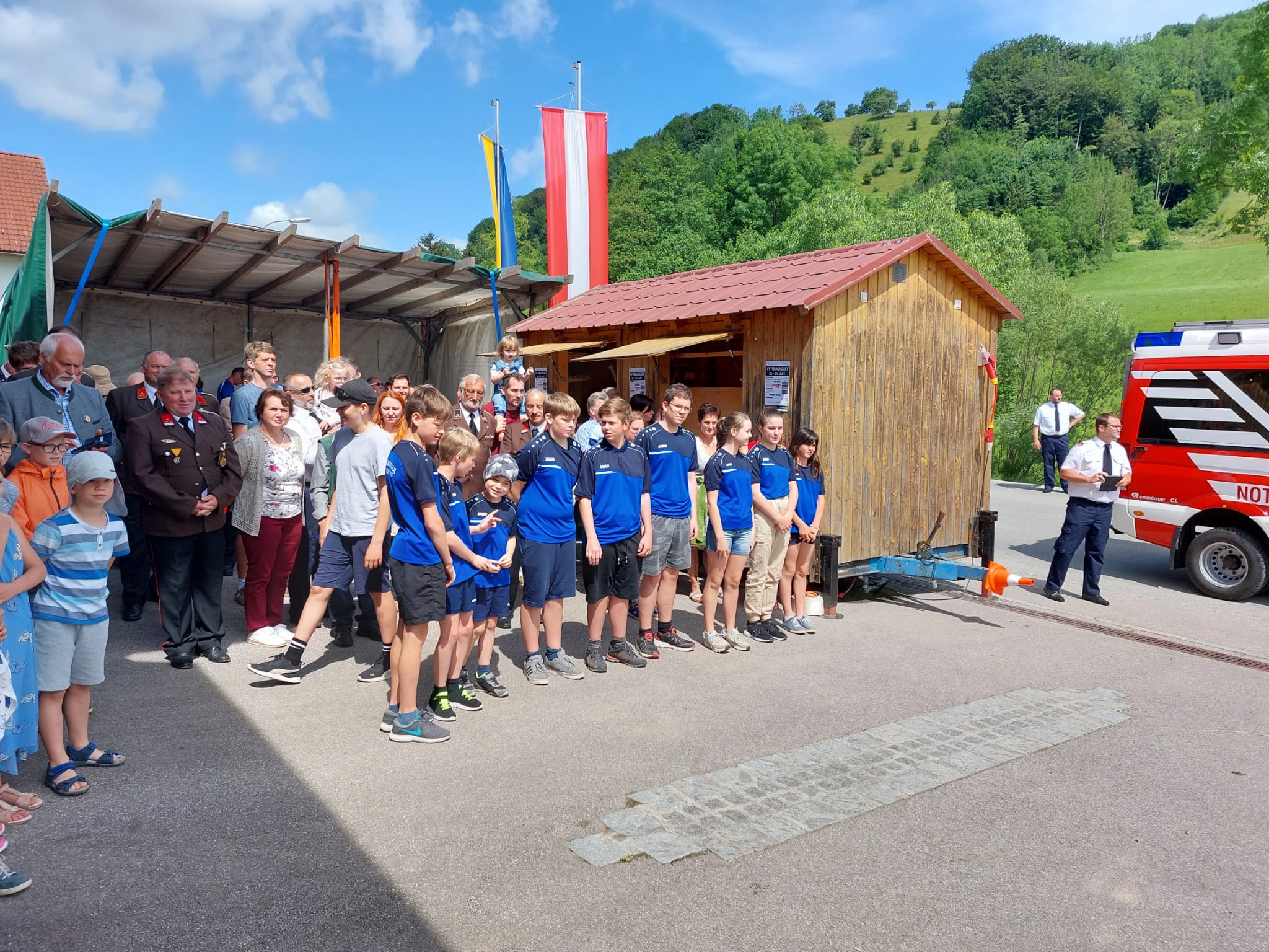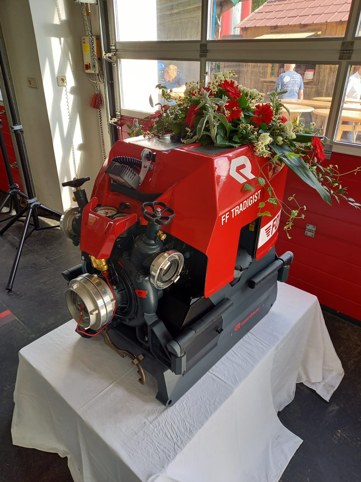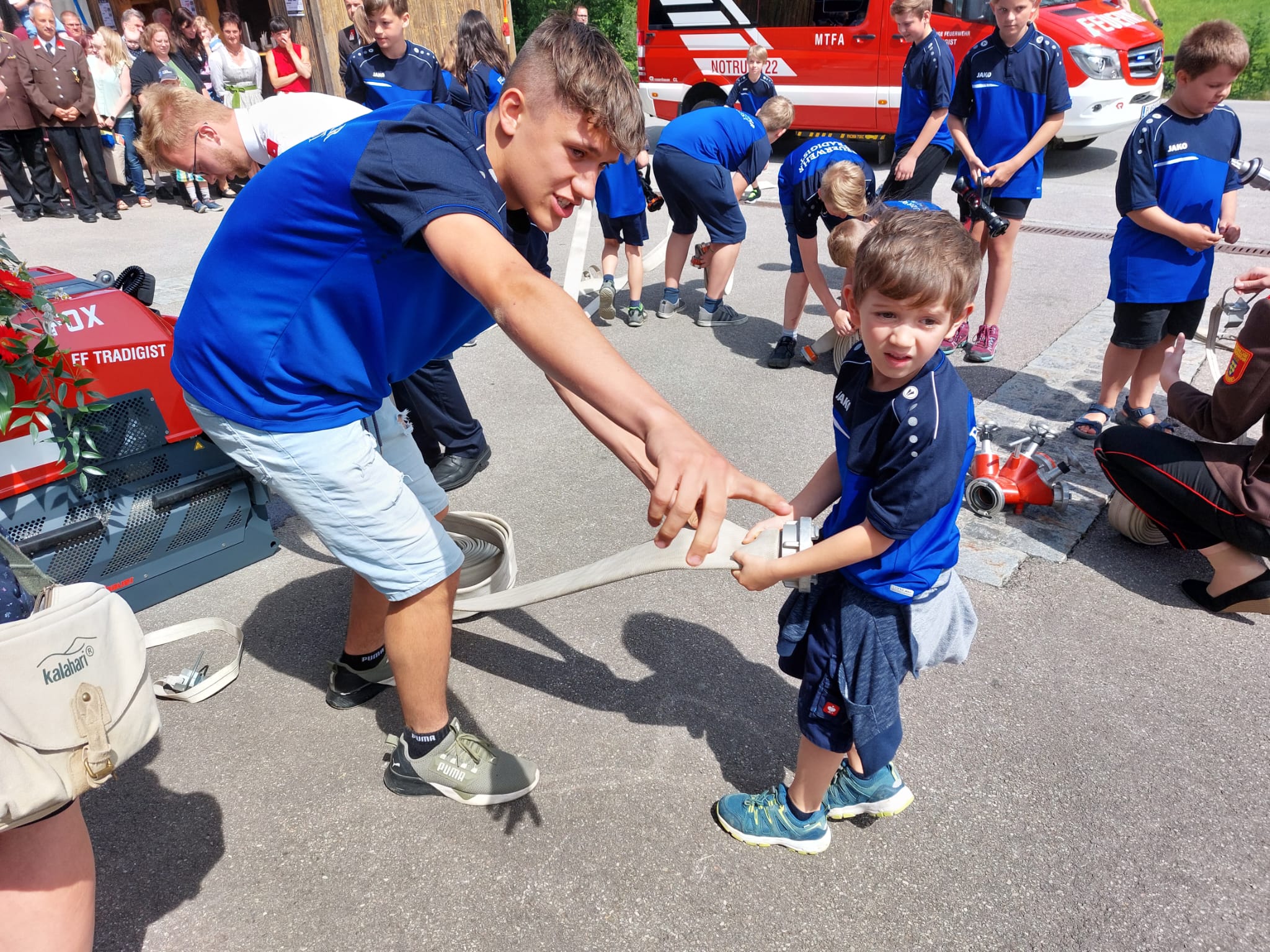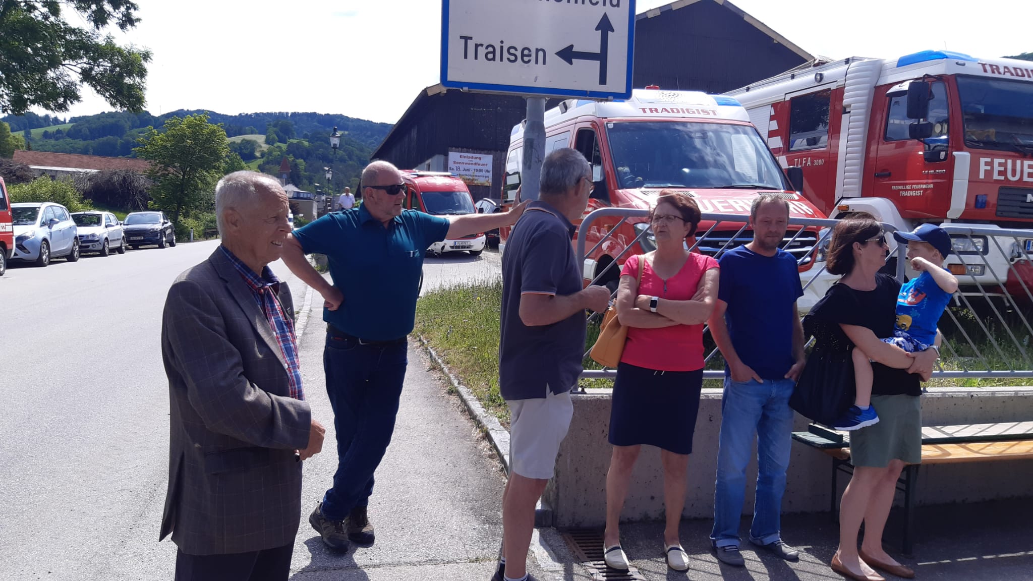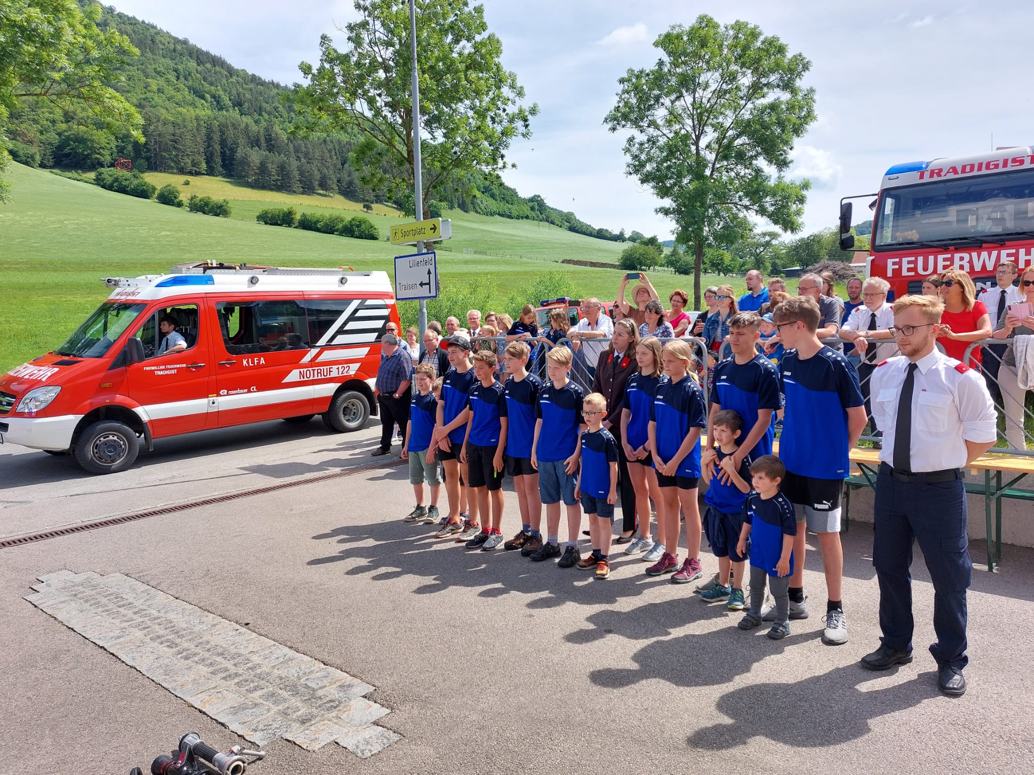 Die Heilige Messe wurde von Pater Leonhard im FF-Haus zelebriert und vom Tradigister Fünfg`sang musikalisch umrahmt. Während der Messe erfolgte die feierliche Segnung der neuen Tragkraftspritze deren Patin Brigitte Schmid ist. Nach den Ansprachen des Kommandanten und der beiden Bürgermeister wurde von den Tradigister Kindern ein bereits zuvor geübter Löschangriff mit 6 Strahlrohren und der neuen Tragkraftspritze gezeigt.