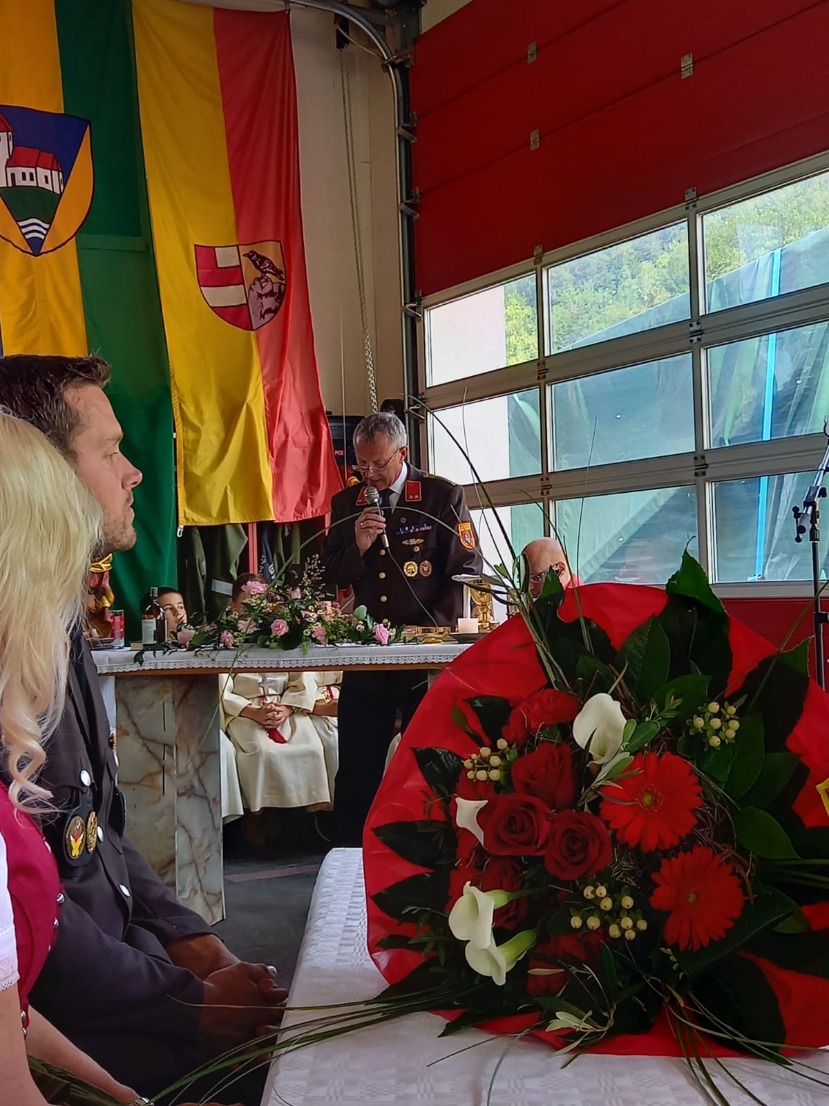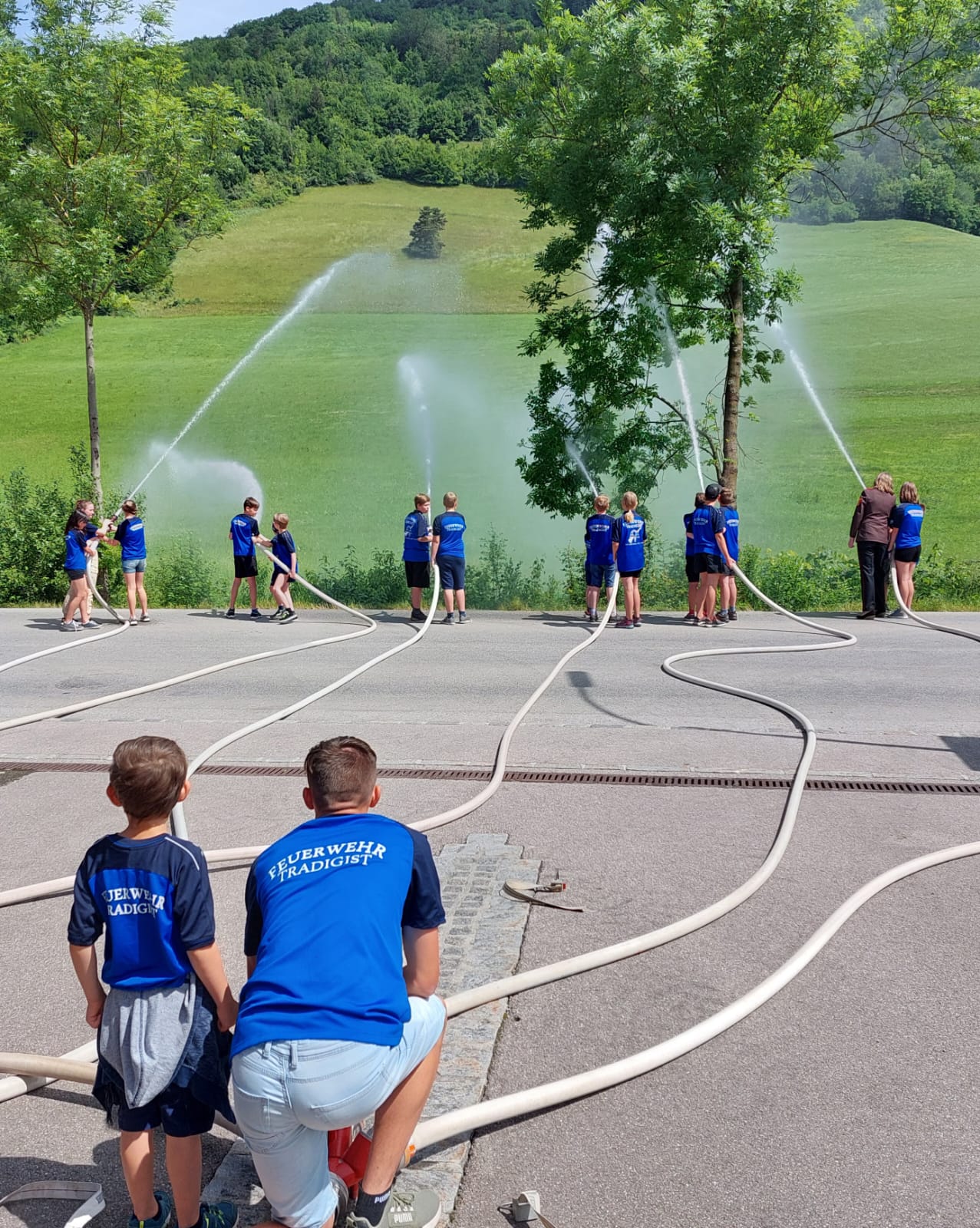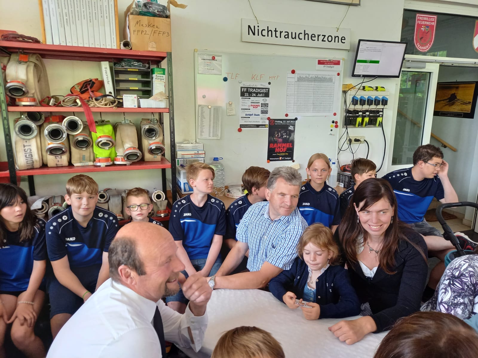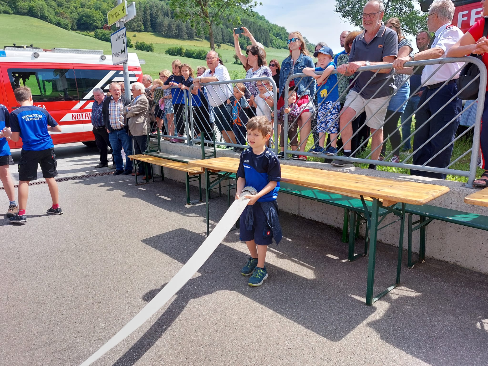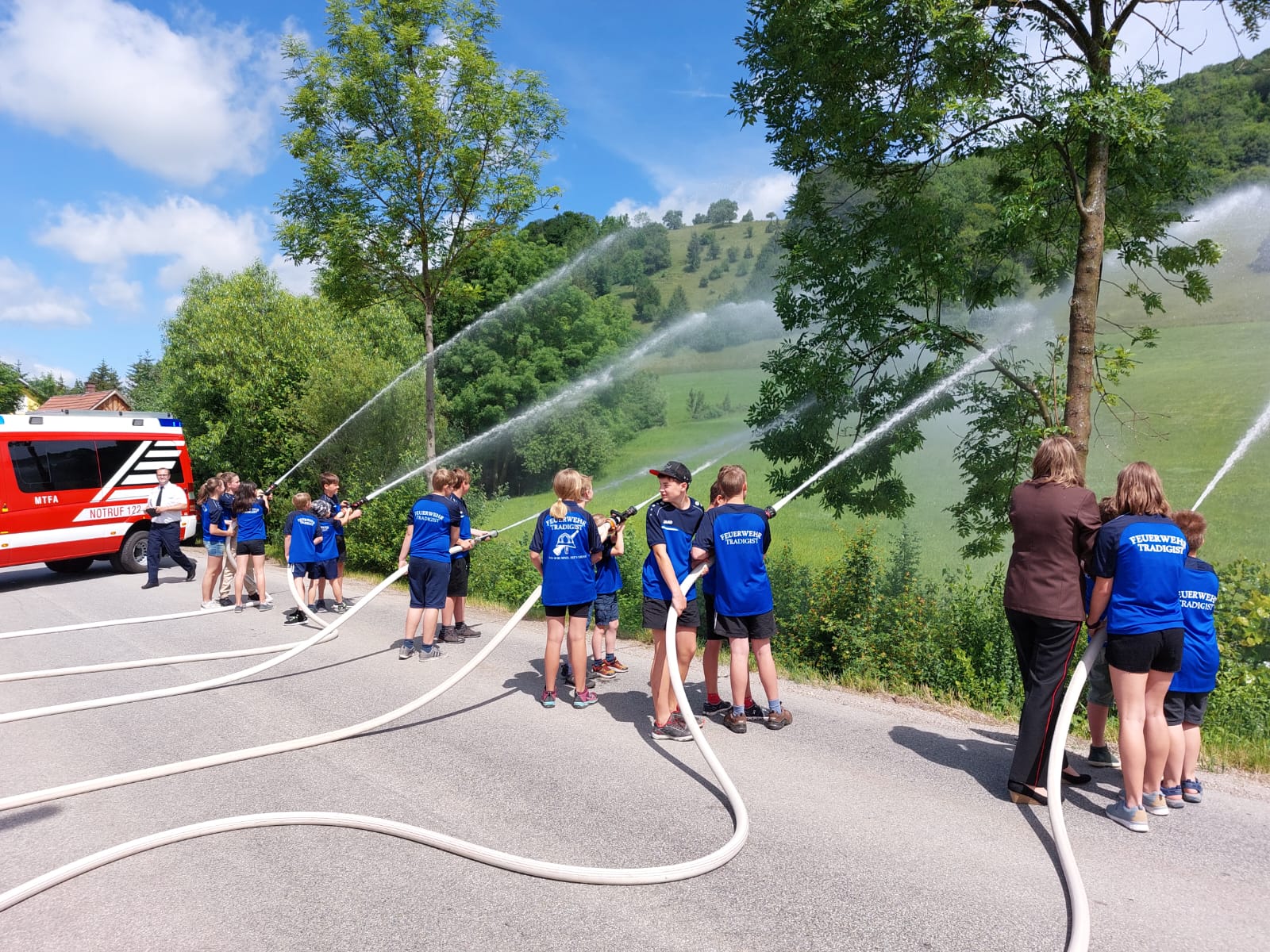 Die Heilige Messe wurde von Pater Leonhard im FF-Haus zelebriert und vom Tradigister Fünfg`sang musikalisch umrahmt. Während der Messe erfolgte die feierliche Segnung der neuen Tragkraftspritze deren Patin Brigitte Schmid ist. Nach den Ansprachen des Kommandanten und der beiden Bürgermeister wurde von den Tradigister Kindern ein bereits zuvor geübter Löschangriff mit 6 Strahlrohren und der neuen Tragkraftspritze gezeigt.
