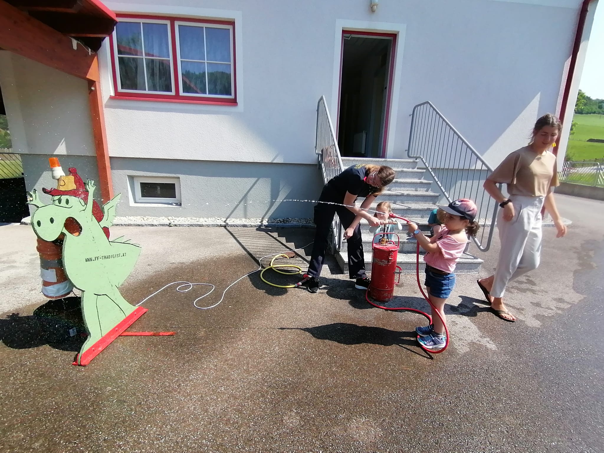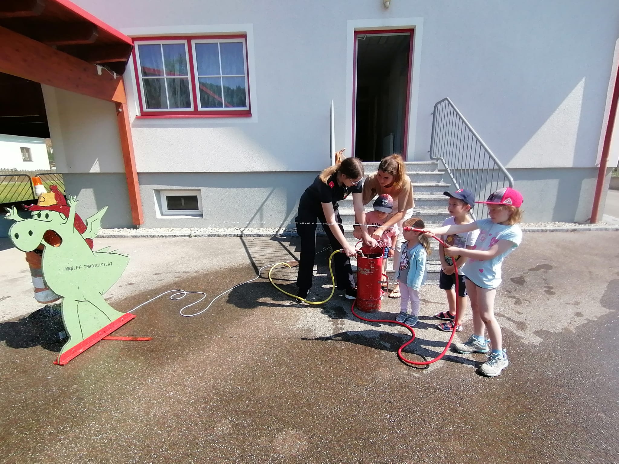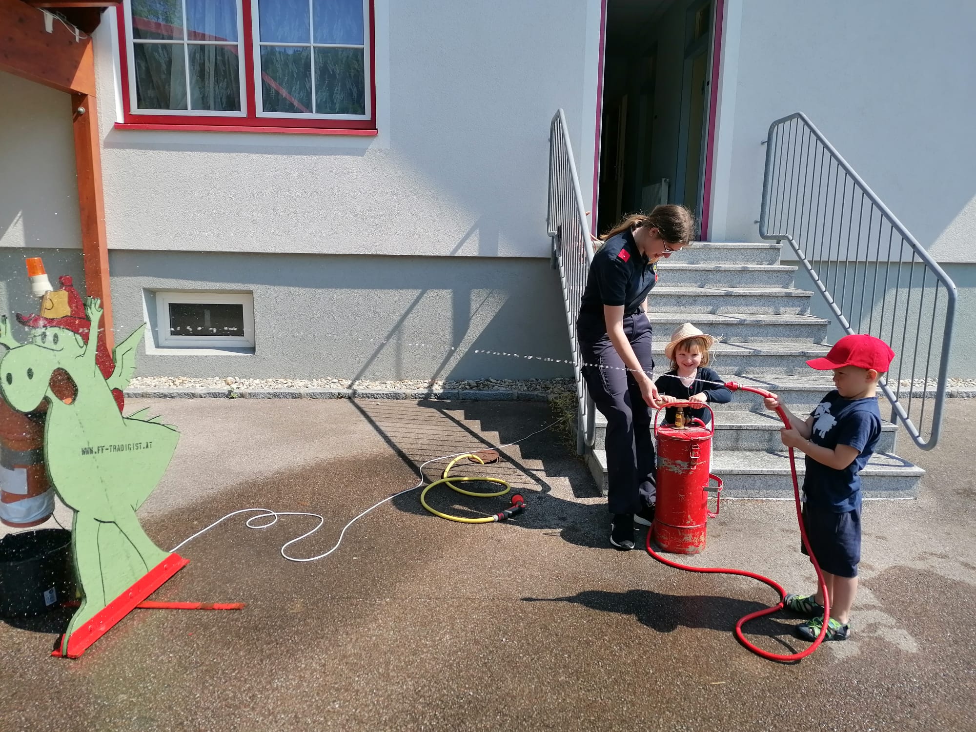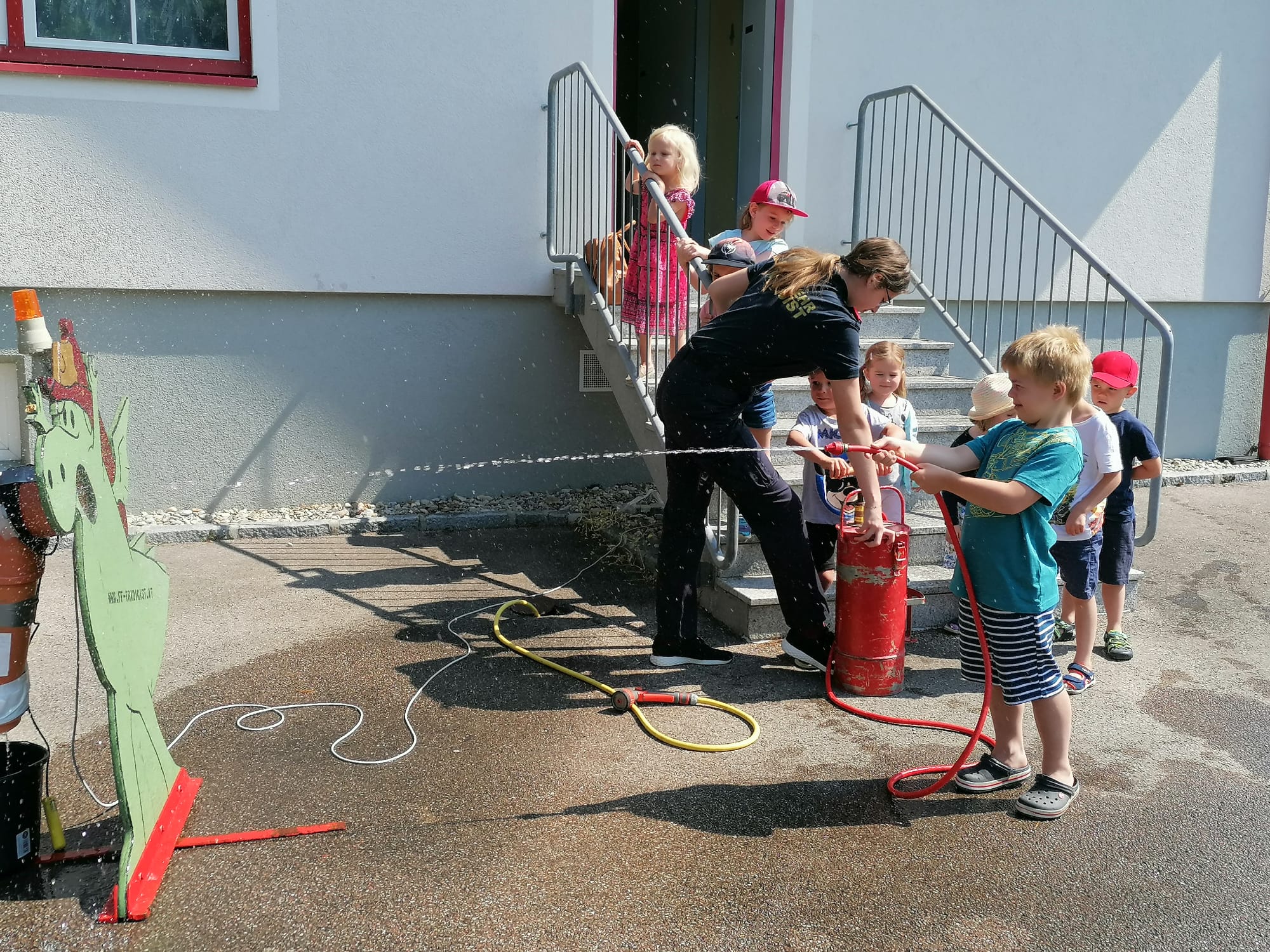 Neben der Besichtigung von Fahrzeugen und Gerätschaften stand Zielspritzen mit dem Feuerwehrdrachen Grisu und eine Fahrt im Feuerwehrauto auf dem Programm.