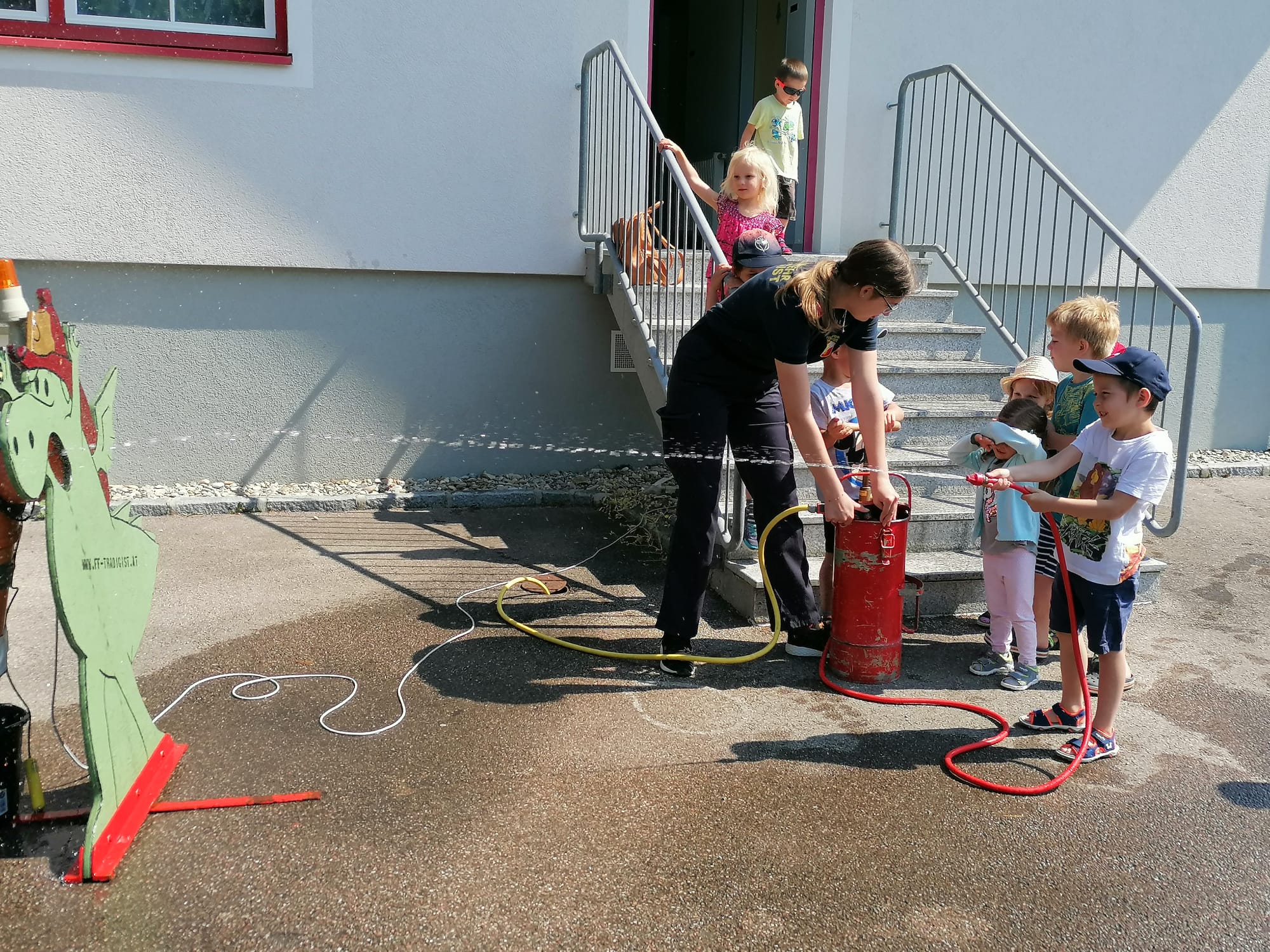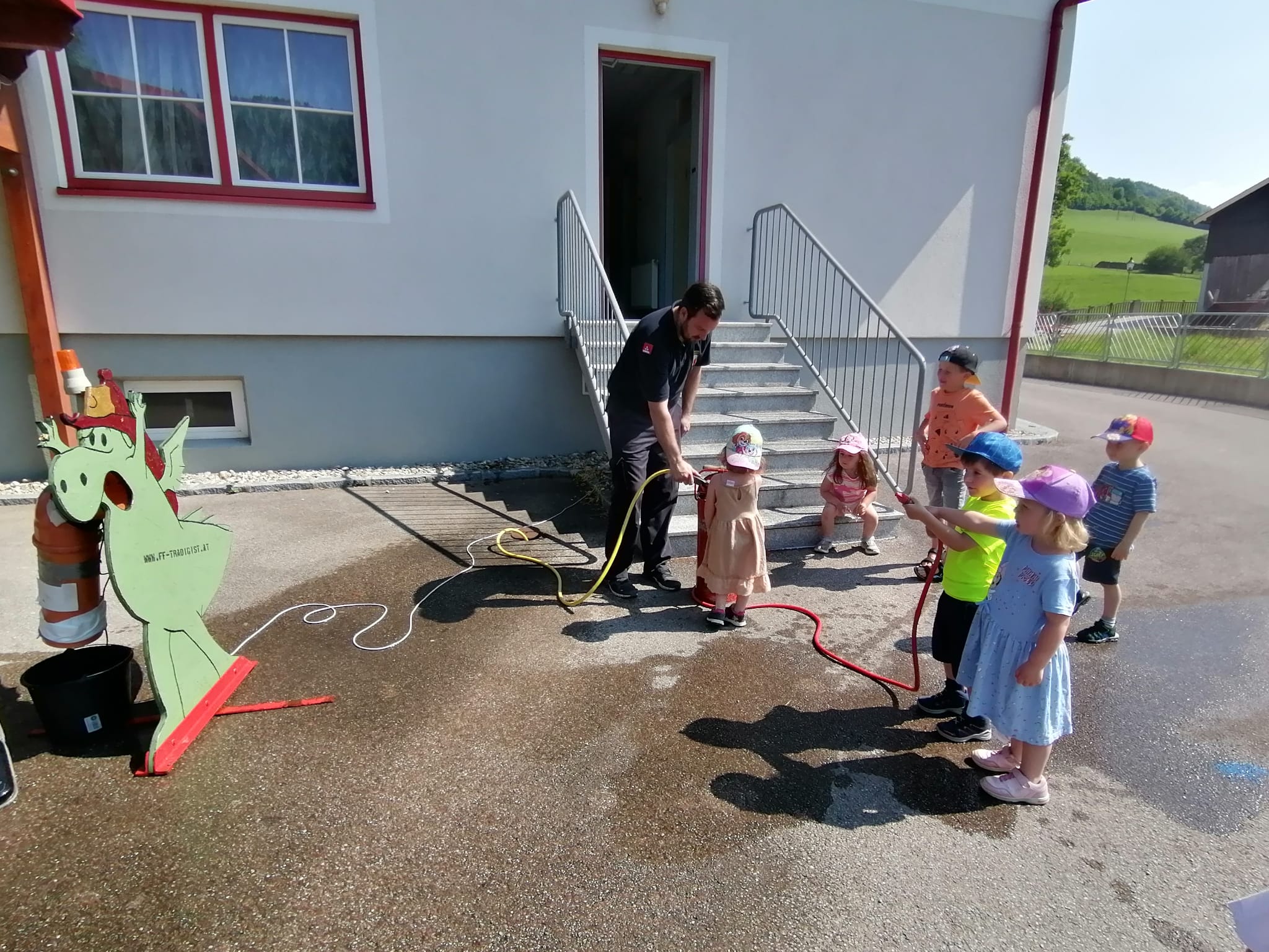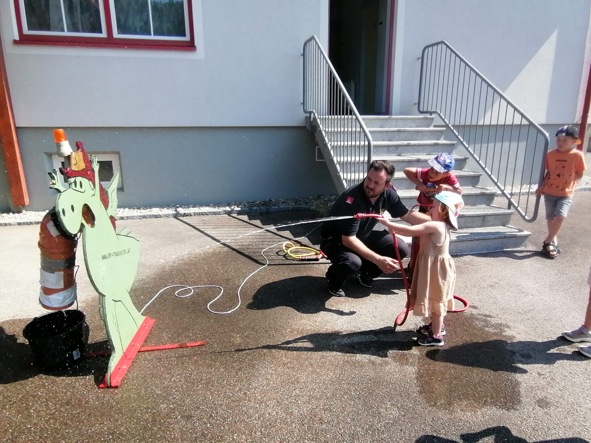 Neben der Besichtigung von Fahrzeugen und Gerätschaften stand Zielspritzen mit dem Feuerwehrdrachen Grisu und eine Fahrt im Feuerwehrauto auf dem Programm.