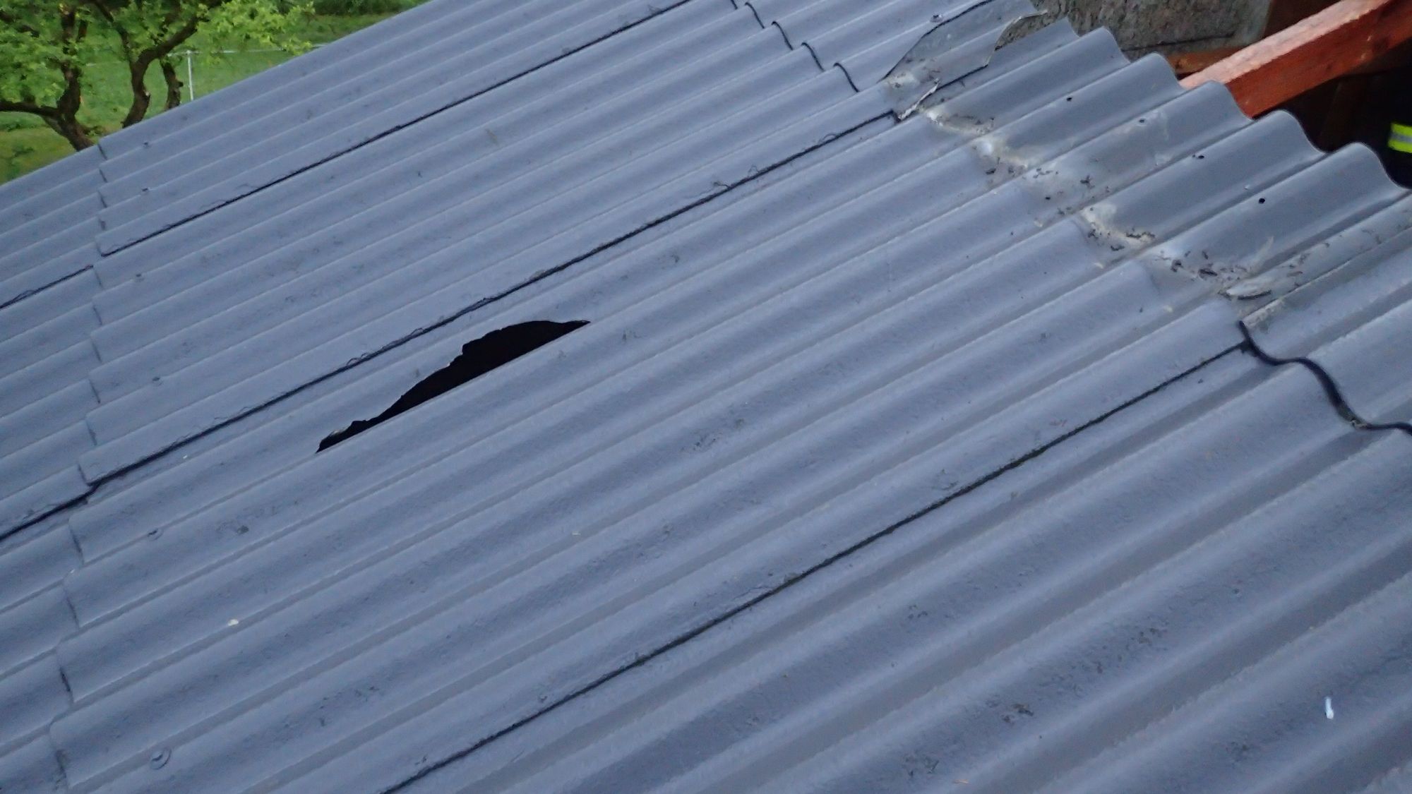 Heute Abend wurden wir telefonisch zu einem Sturmschadeneinsatz gerufen. Eine Sturmböe riss von einem Mehrfamilienhaus teilweise das Eternitdach herunter.