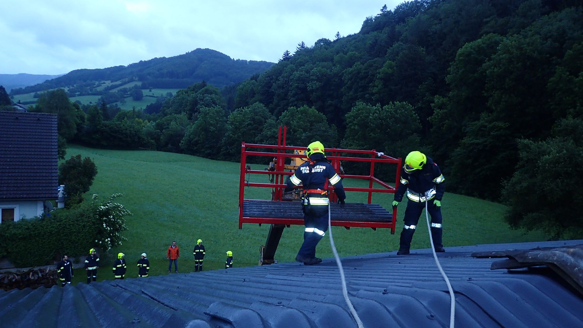 Nach Erkundung und Besichtigung der Lage wurde ein Teleskoplader angefordert. Zwei Feuerwehrmänner rüstetet sich einstweilen mit Absturzsicherungen aus. Sie wurden vom Dachboden aus gesichert.