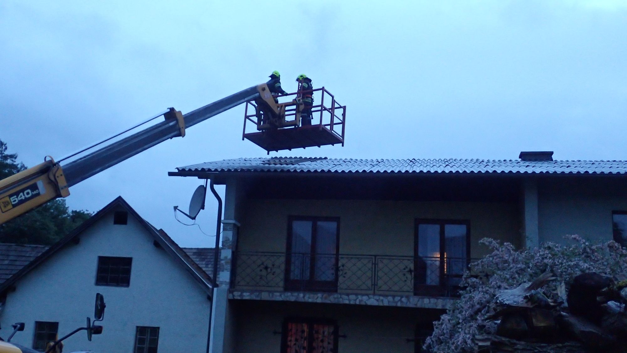 Mittels Teleskoplader wurden Eternitplatten auf das Dach gehoben, welches von den beiden Feuerwehrmännern provisorisch gedeckt wurde.