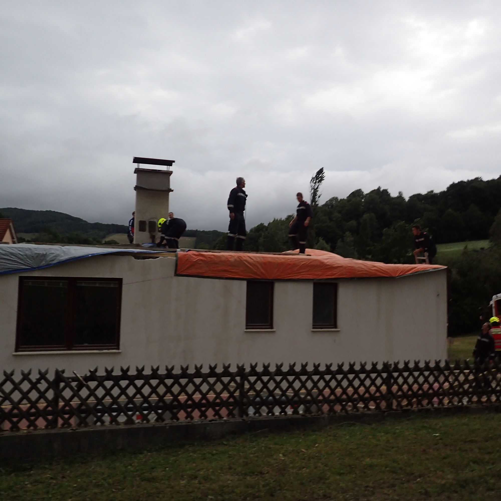 Wir unterstützten die Hauseigentümer beim Sichern der Planen mittels Pfosten und Kanthölzer, welche auf die Planen gelegt wurden. Weiters wurden die Planen an der Fassade mittels Draht niedergehängt.