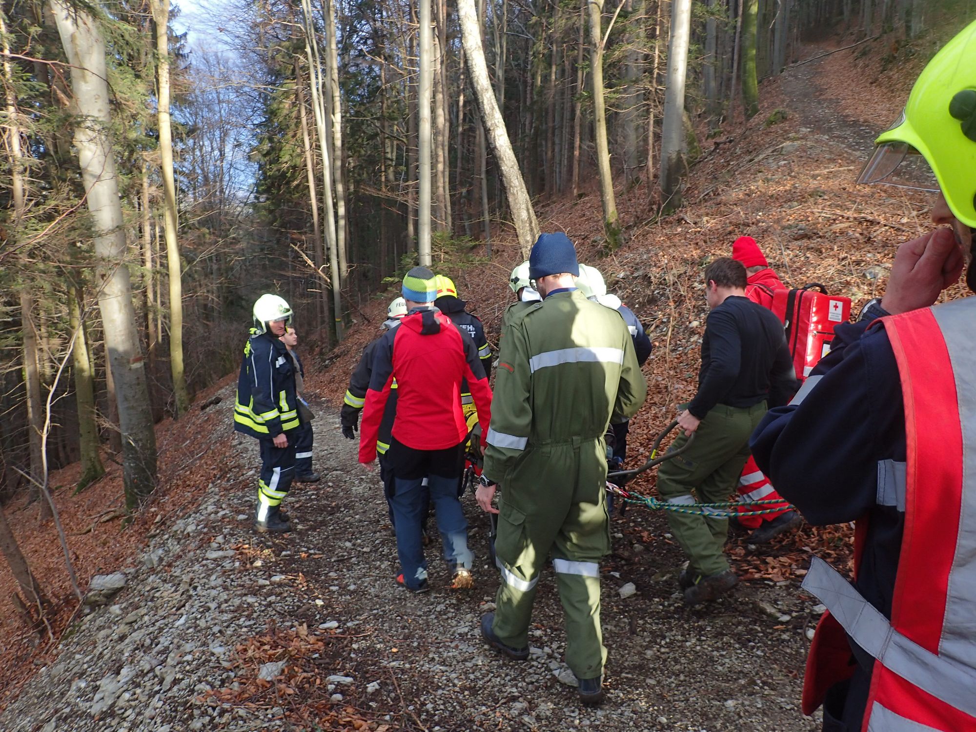In der Nähe der Poidlwarte war ein Mann im unwegsamen Gelände zusammengebrochen. Mit vereinten Kräften wurde die verletzte Person aus dem Waldstück gerettet und Richtung Schwerbach transportiert.