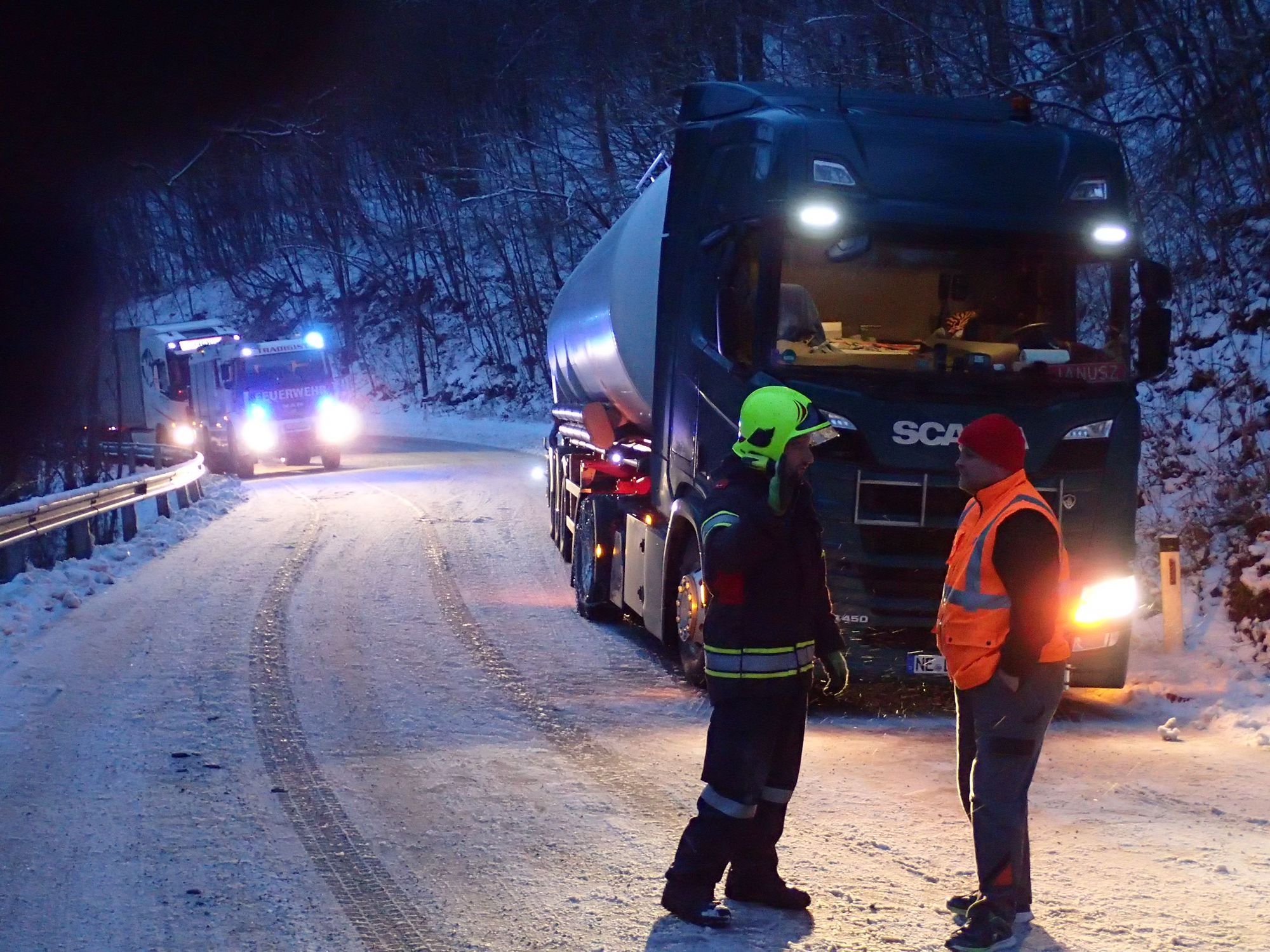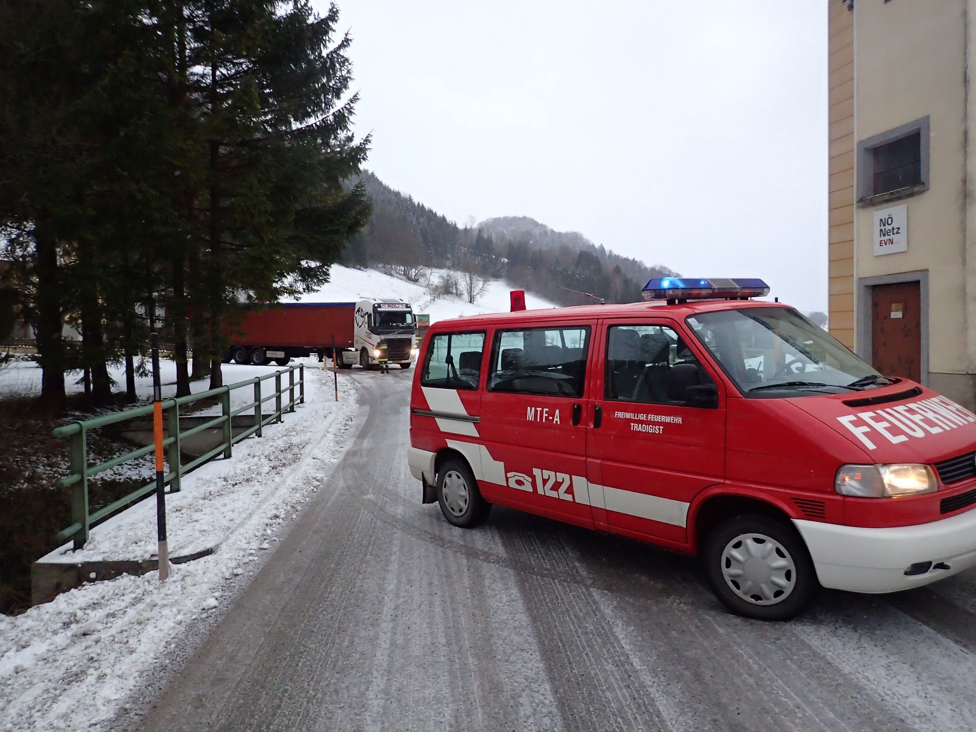 Als wir schon wieder Richtung Feuerwehrhaus unterwegs waren kam ein 3. LKW welcher über den Morigraben fahren wollte. Nach Rücksprache mit der Fahrerin wurde ihr eine Umdrehmöglichkeit gezeigt. Bei dem Wendemanöver blieb der LKW neben der Fahrbahn im Schnee stecken. Somit musste auch dieser LKW mittels Schleppstange geborgen werden.