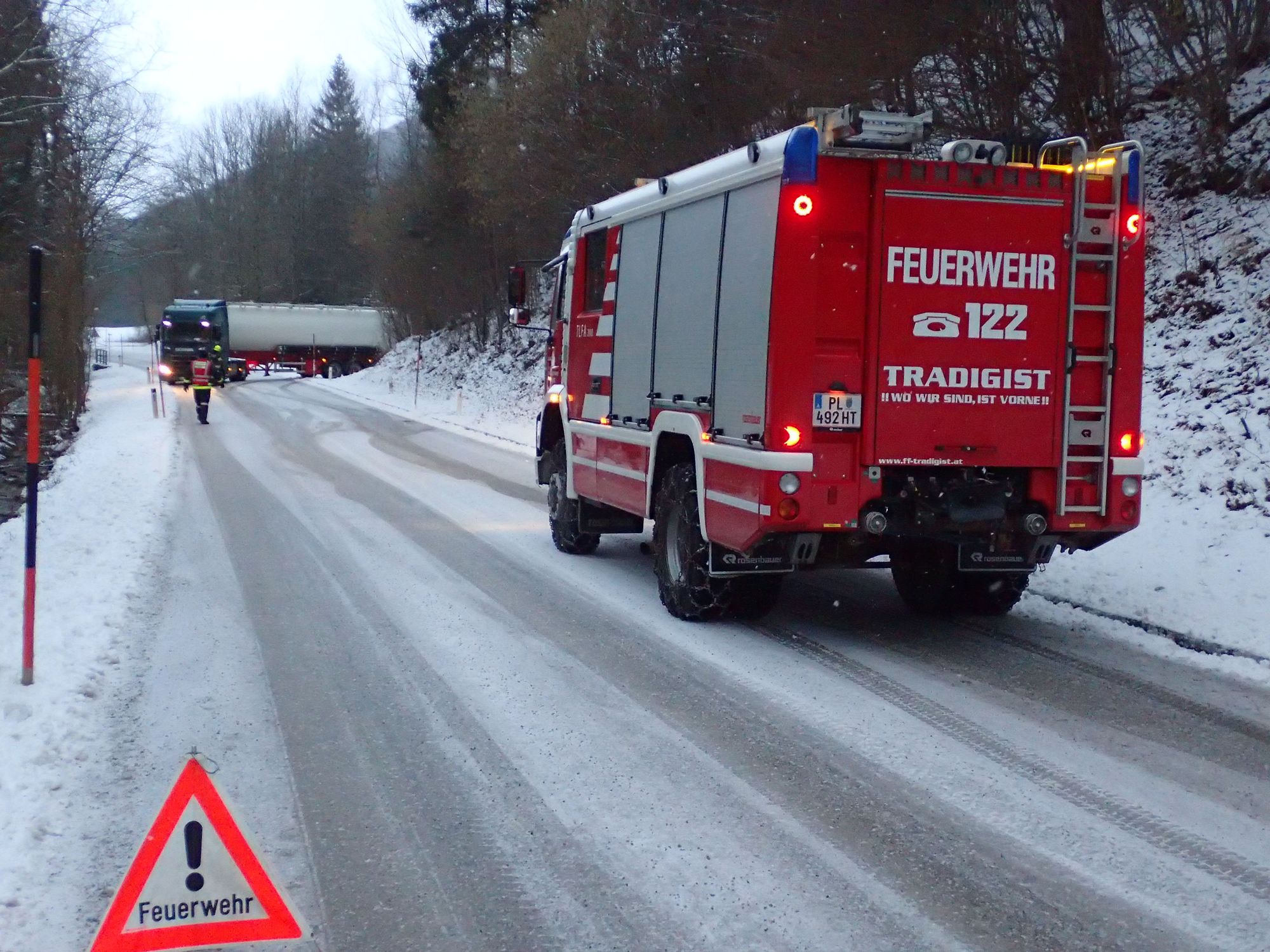 Um 07:05 Uhr wurden wir heute Früh von der Bezirksalarmzentrale zu einem technischen Einsatz (T1) alarmiert. Die Information zur Alarmierung lautete: 2 hängende LKW am Morigraben...