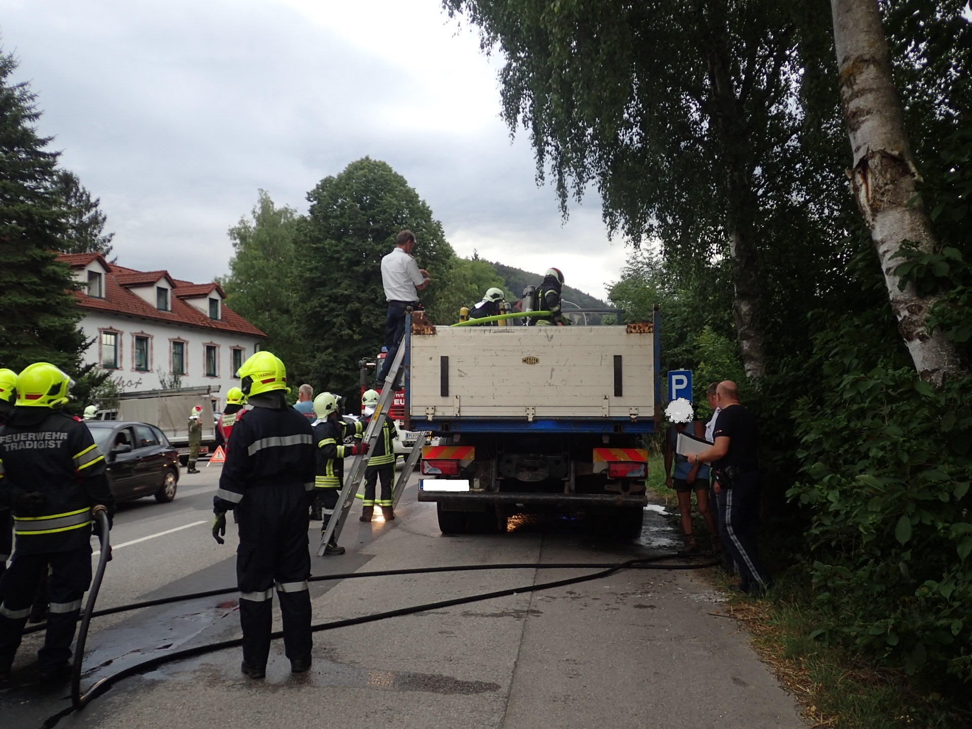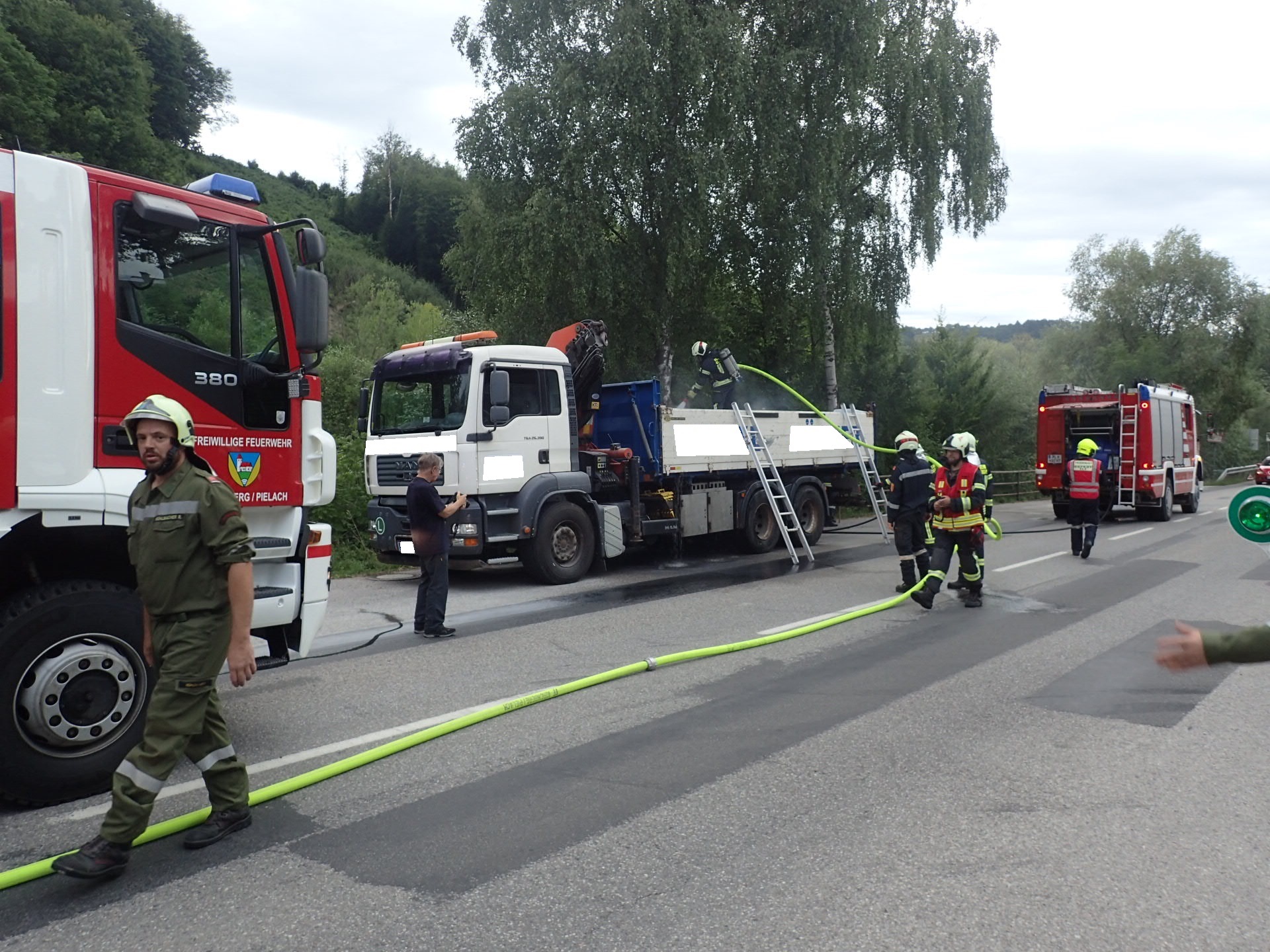 Bei der Ankunft am Einsatzort stellten wir eine starke Rauchentwicklung auf der Ladefläche des LKWs, jedoch keine Flammen fest. Es wurde sofort mit dem HD-Rohr die Brand- bzw. Rauchbekämpfung begonnen. Zeitgleich musste die B39 kurz für den vorbeifahrenden Verkehr gesperrt werden.