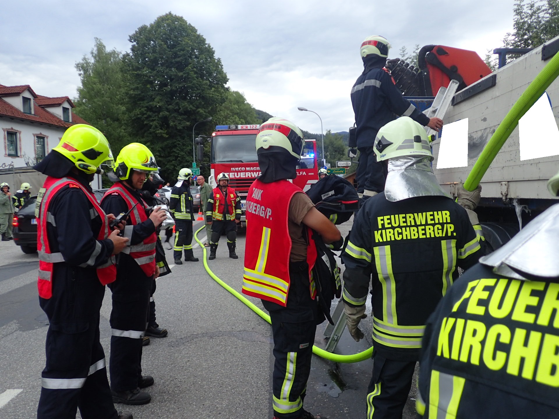 Die Feuerwehr Kirchberg ging parallel mit Atemschutz und Löschschaum zum Einsatz vor. Mit unserer Wärmebildkamera wurde nach möglichen Glutnestern gesucht. Die Cellolose Pakete auf der Ladefläche wurden auseinander geräumt, um den Brandherd zu lokalisieren.