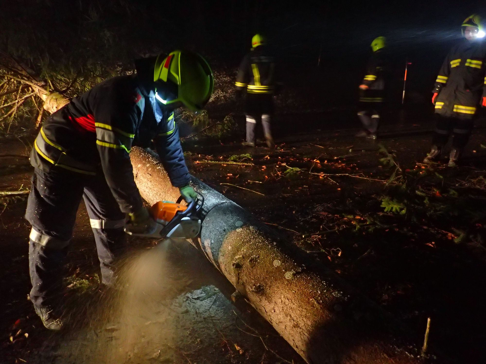 Der ausgewurzelte Baum wurde mittel Motorsäge entastet auf Blochlänge abgeschnitten und neben der Fahrbahn abgelegt. Anschließend wurde die Straße noch gereinigt.