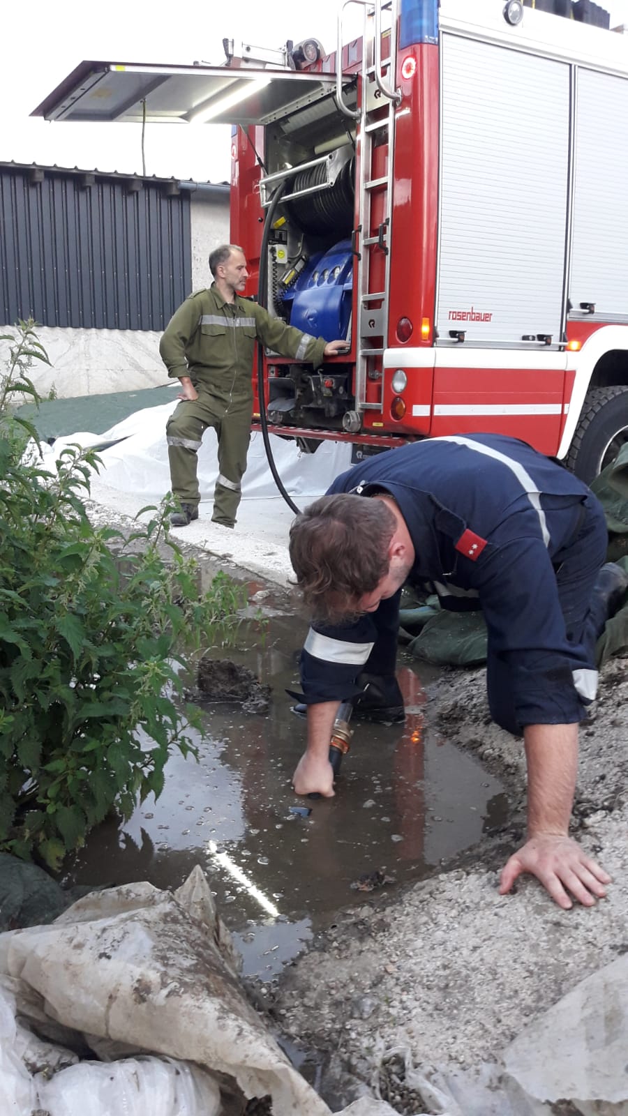 Nach dem Hochwasser am vergangenen Wochenende wurden heute noch verstopfte Kanalrohre und Drainagen durchgespült, sowie Verklausungen und Verunreinigungen beseitigt.