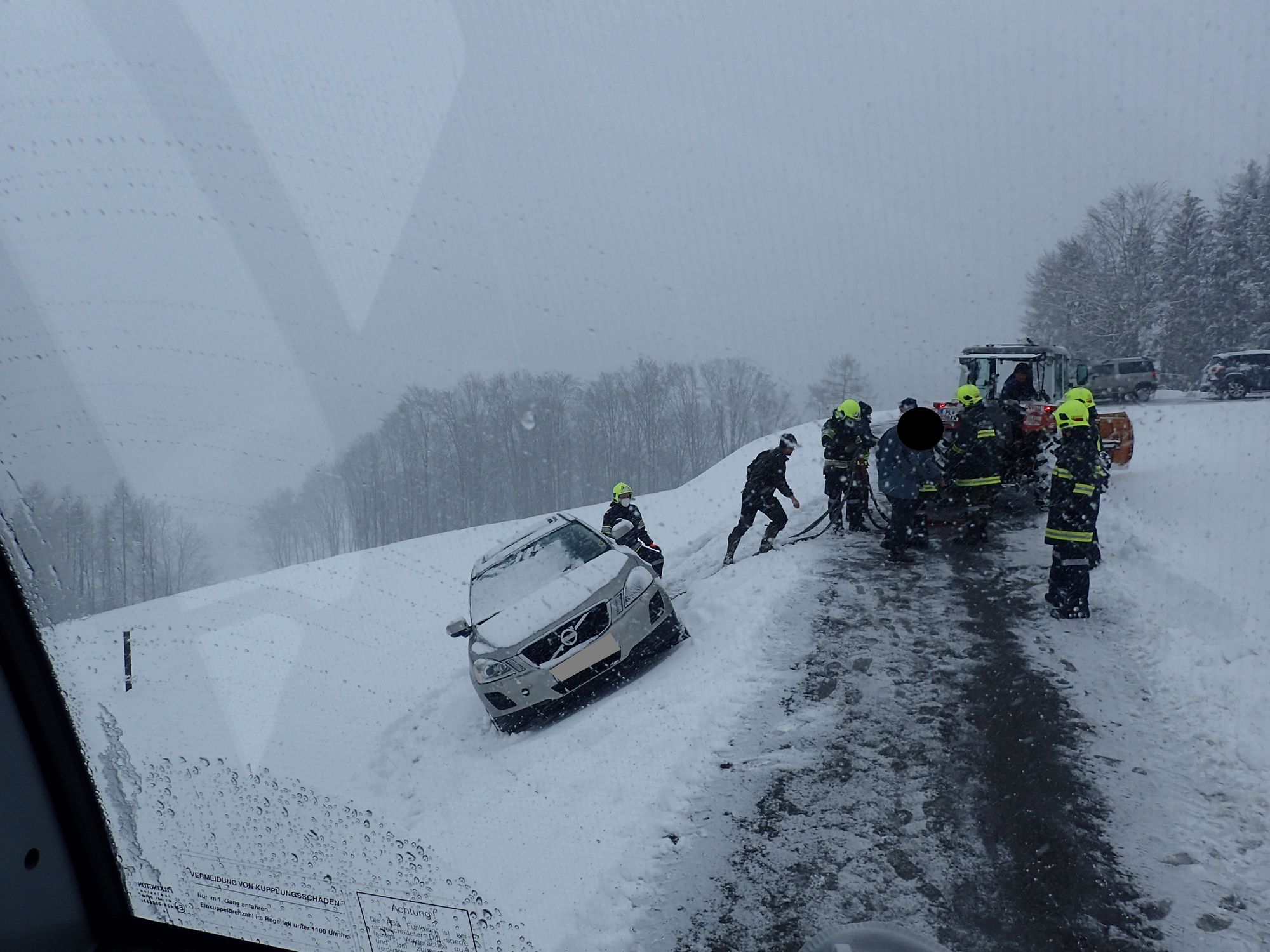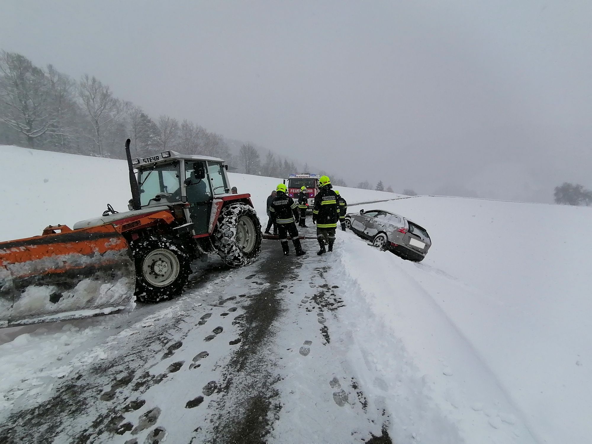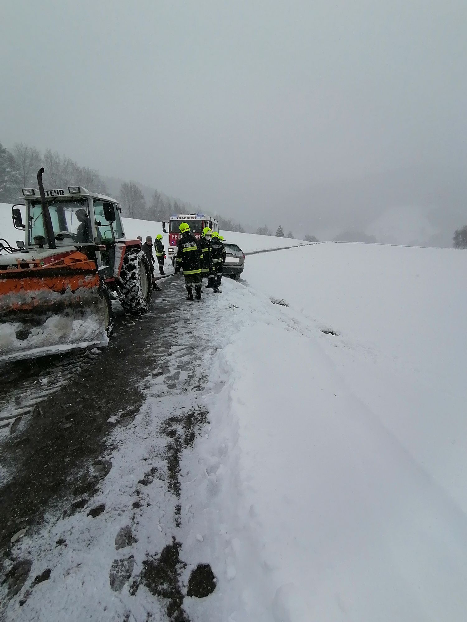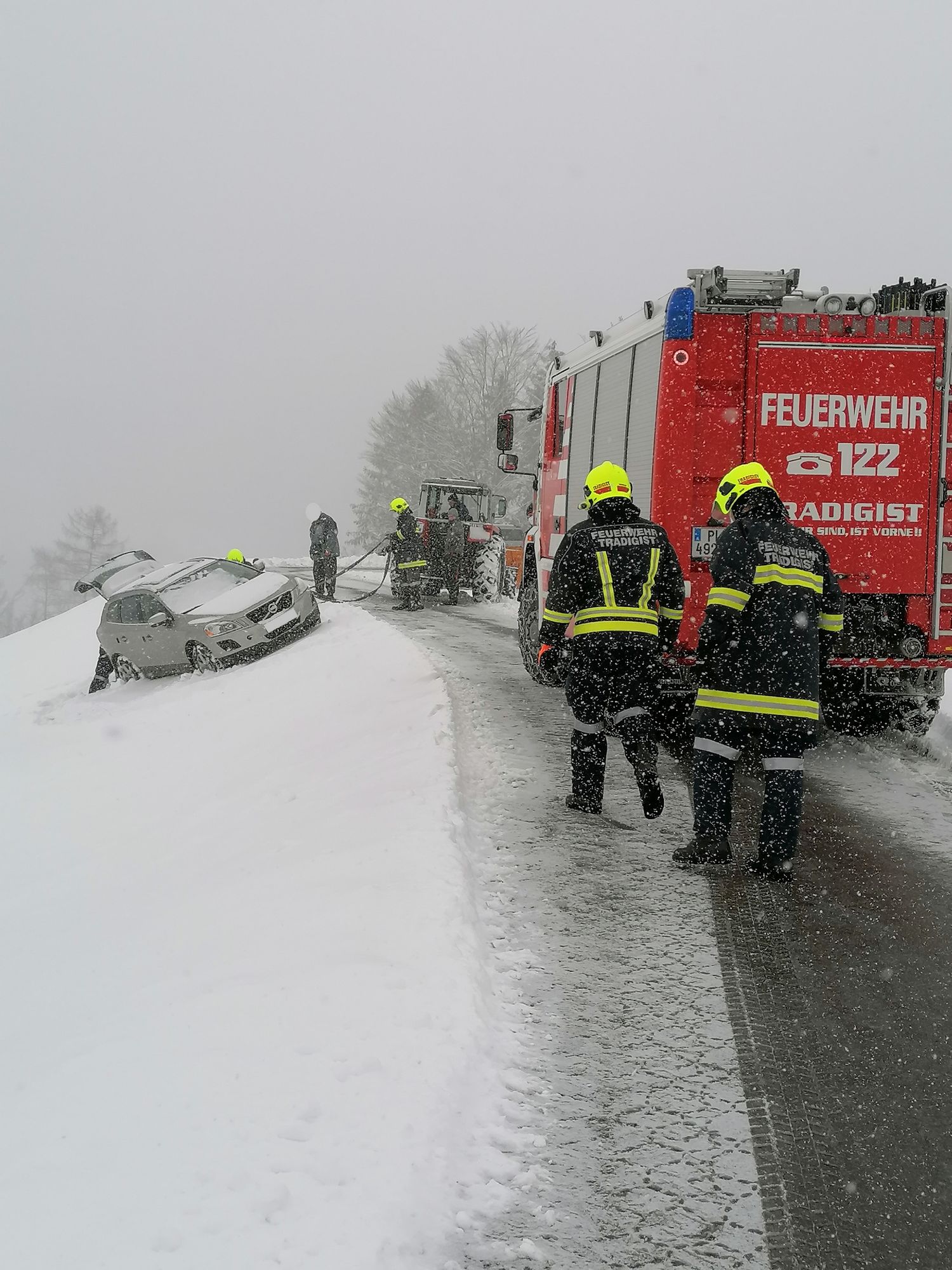 Heute um 08.45 Uhr wurden wir zu einer PKW Bergung (T1) in Tradigist gerufen. Ein Fahrzeug war in einer Kurve von der schneeglatten Straße abgekommen, über die Böschung gerutscht und in Schräglage zum Stehen gekommen.
