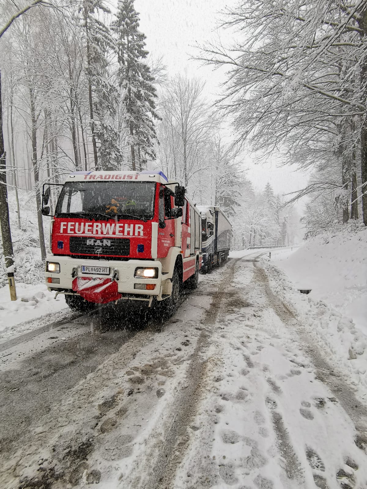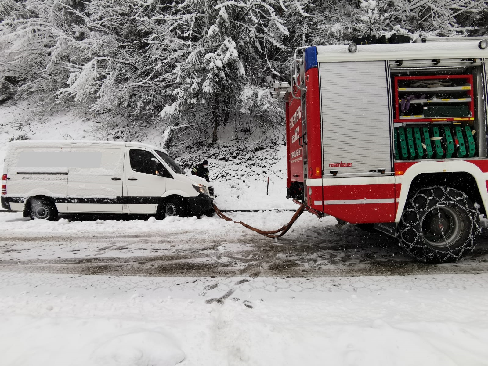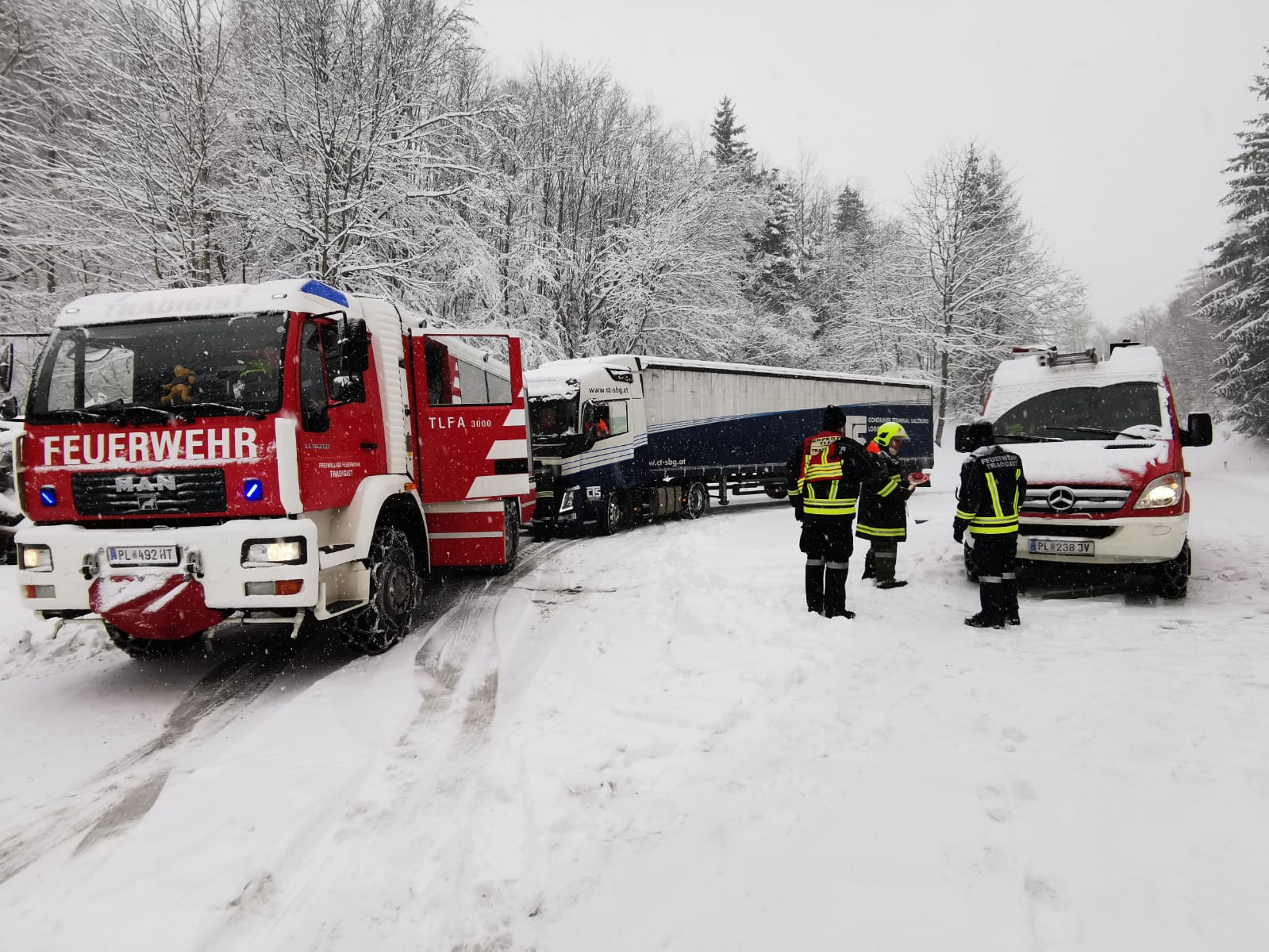 Ein LKW, ein Kleinbus, sowie ein PKW waren auf der Schneefahrbahn hängengeblieben.