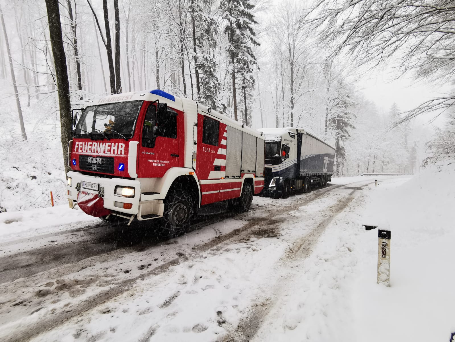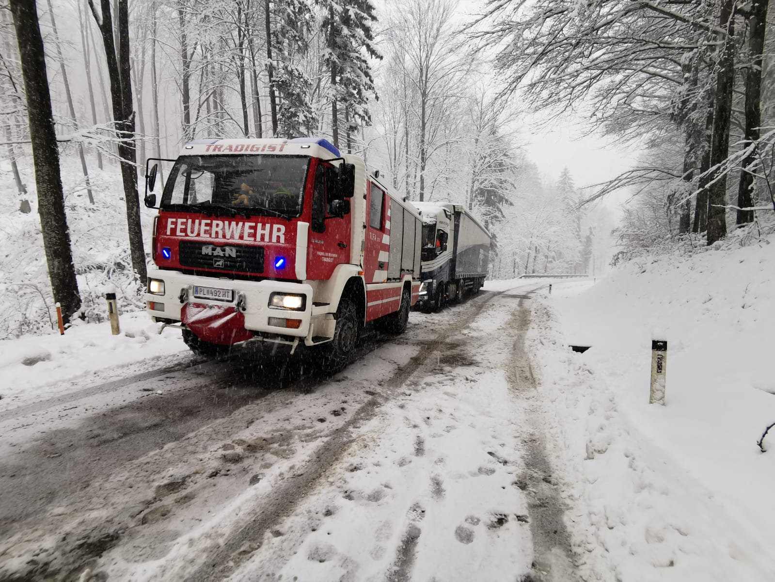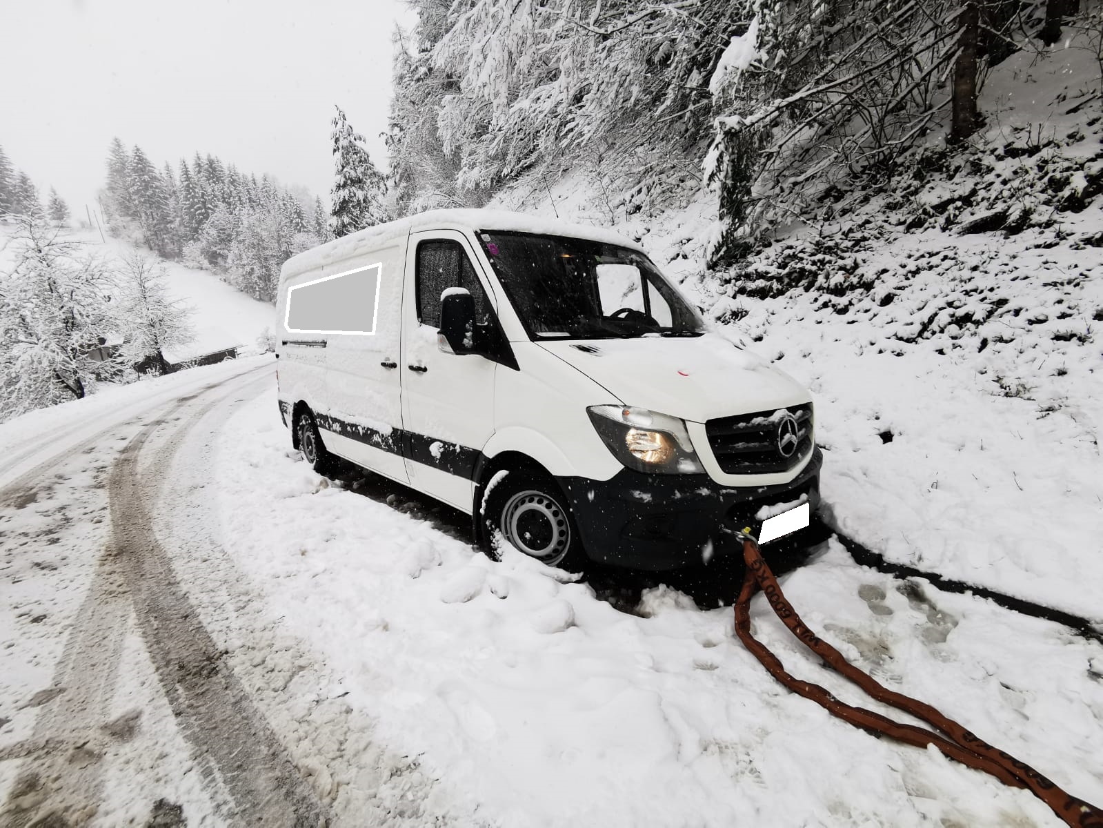 Ein LKW, ein Kleinbus, sowie ein PKW waren auf der Schneefahrbahn hängengeblieben.