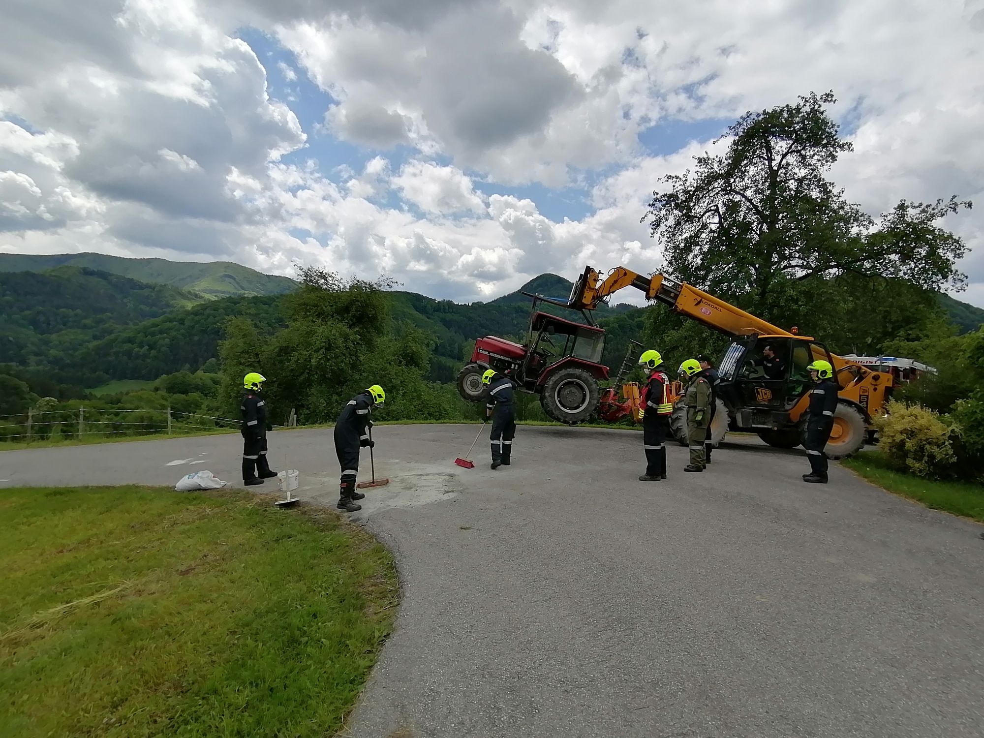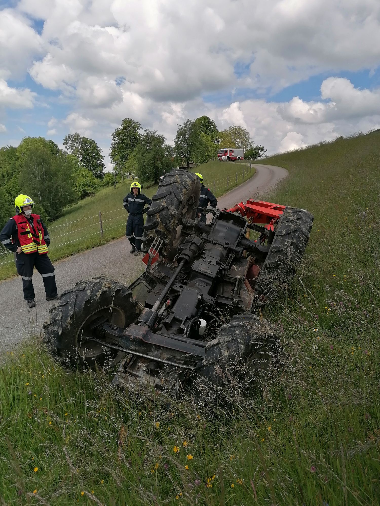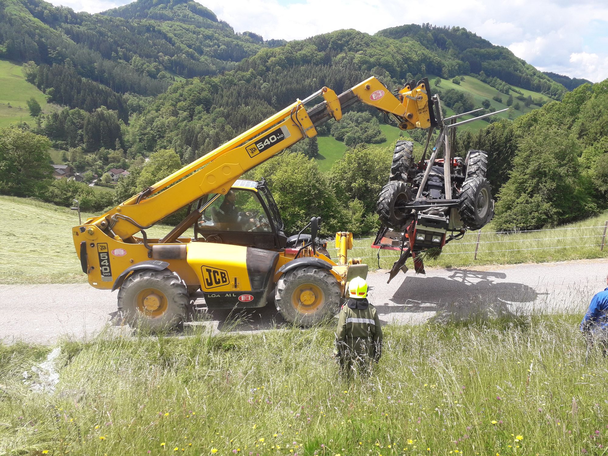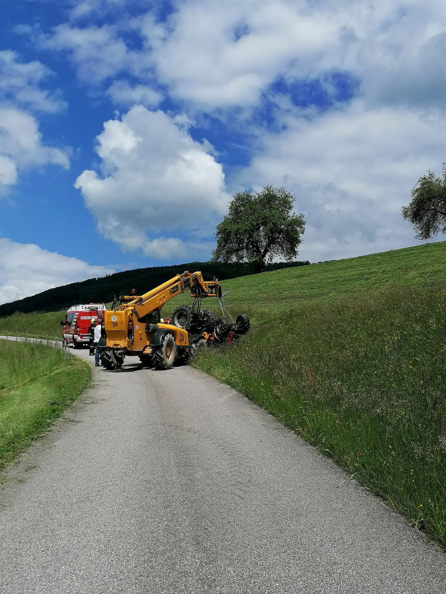 Heute um 11:27 Uhr wurden wir von der Bezirksalarmzentrale zu einer Traktorbergung (T1) alarmiert. Ein Landwirt war mit seinem Traktor auf einer Wiese abgerutscht und anschließend umgestürzt. Mit Hilfe eines Teleskopladers wurde der Traktor aus dem Graben gehoben, umgedreht und zu dem Gehöft gebracht. Das ausgelaufene Öl wurde gebunden. Nach ca. 2h konnten wir wieder einrücken und unsere Einsatzbereitschaft wieder herstellen.