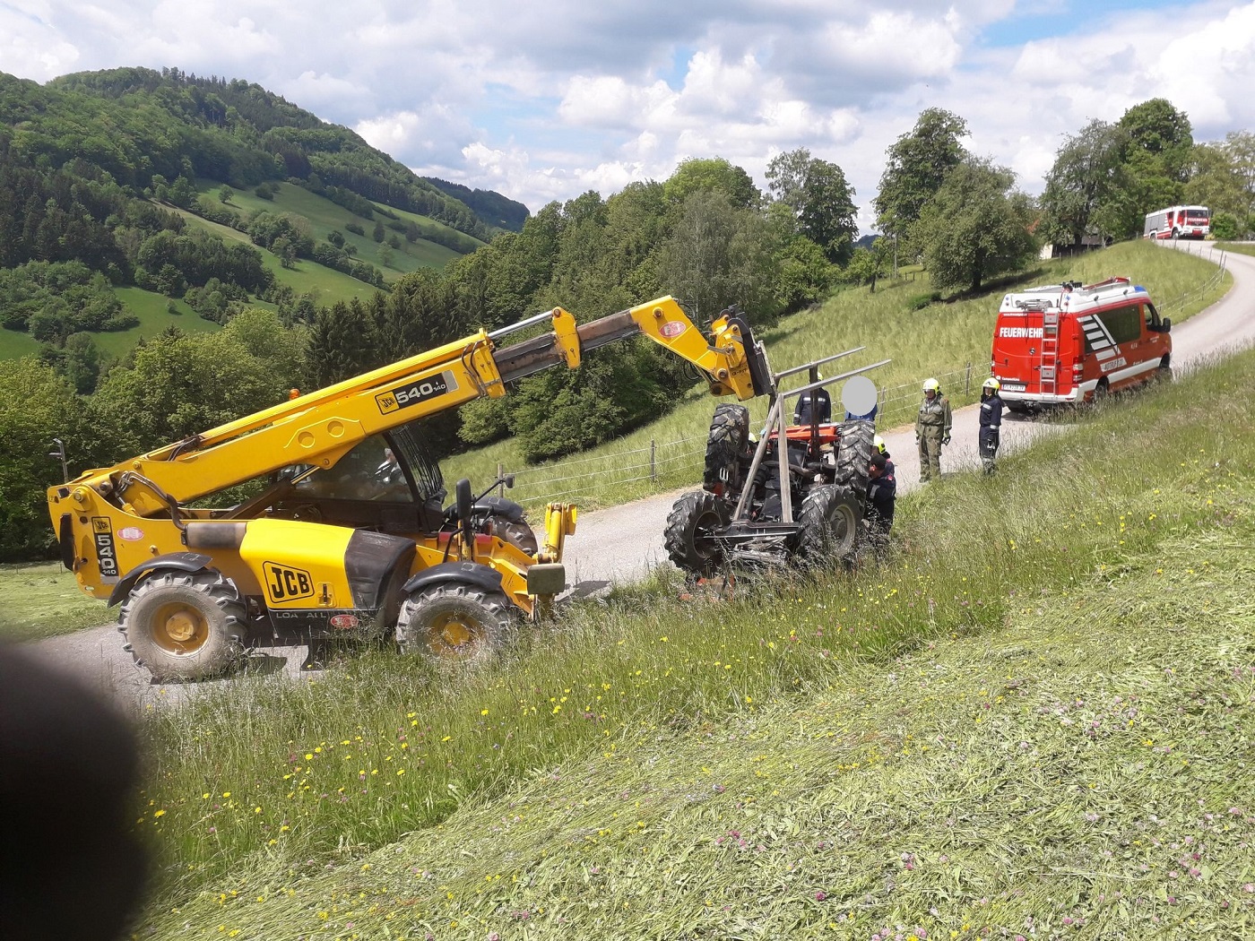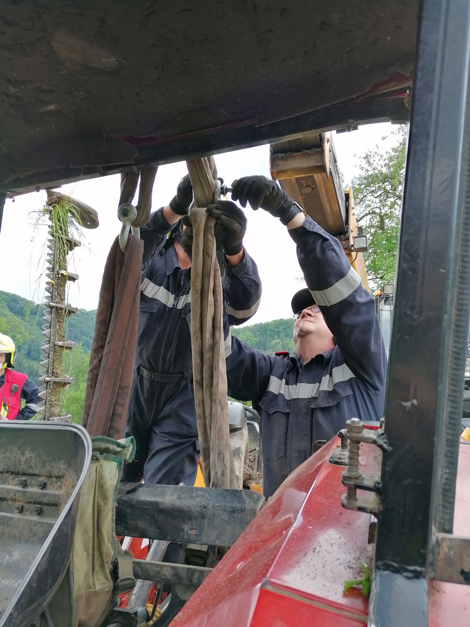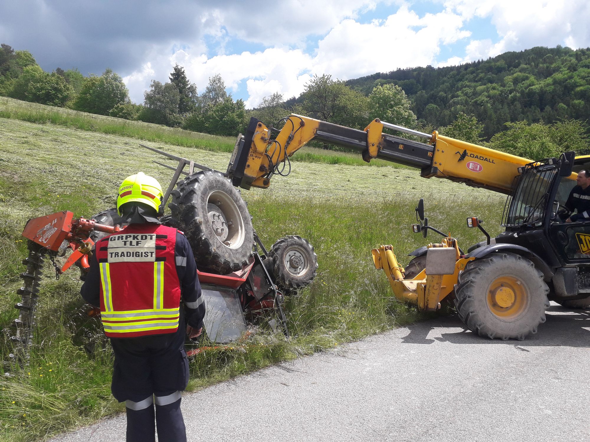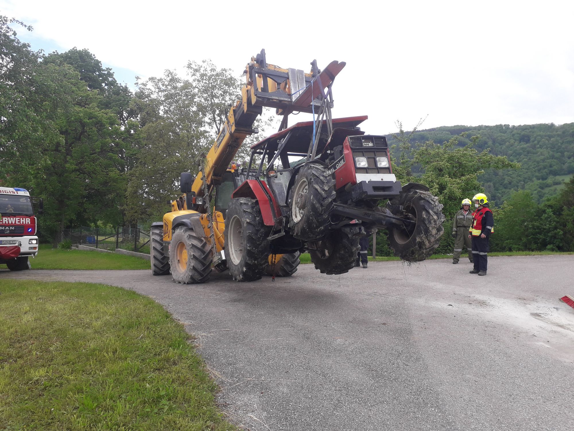 Heute um 11:27 Uhr wurden wir von der Bezirksalarmzentrale zu einer Traktorbergung (T1) alarmiert. Ein Landwirt war mit seinem Traktor auf einer Wiese abgerutscht und anschließend umgestürzt. Mit Hilfe eines Teleskopladers wurde der Traktor aus dem Graben gehoben, umgedreht und zu dem Gehöft gebracht. Das ausgelaufene Öl wurde gebunden. Nach ca. 2h konnten wir wieder einrücken und unsere Einsatzbereitschaft wieder herstellen.