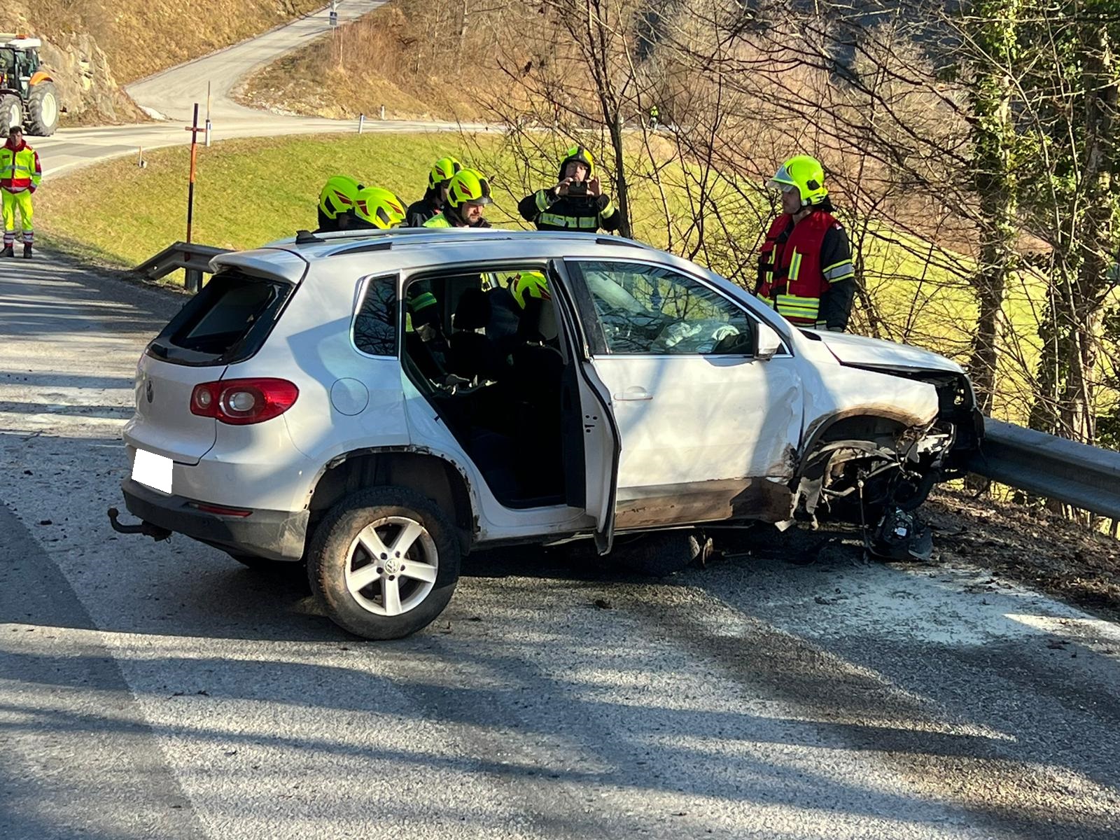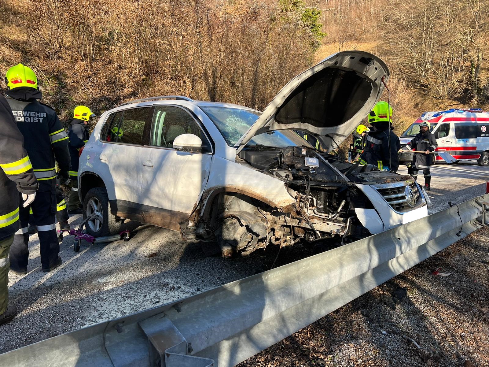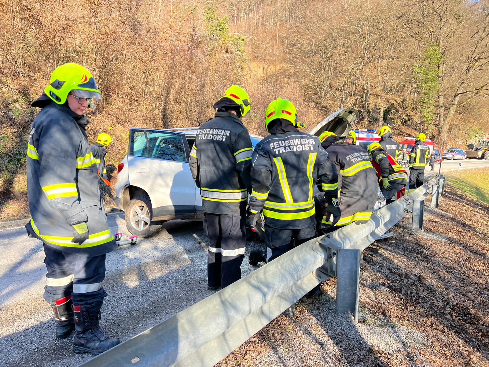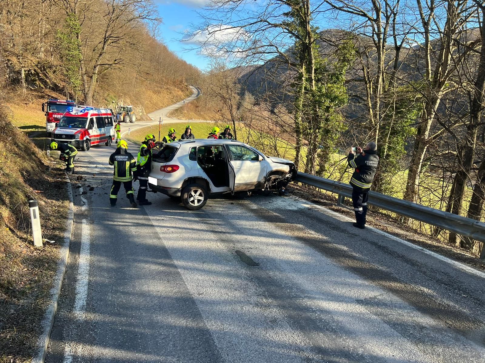 Ein Fahrzeuglenker fuhr mit seinem PKW von Eschenau Richtung Tradigist und kam in einer Kurve auf den Splitt, der sich auf der Fahrbahn befand. Er verlor die Kontrolle über sein Fahrzeug, rammte die Böschung, überschlug sich einmal in der Luft und kam danach quer zur Fahrbahn mit den Rädern am Asphalt wieder zum Stehen.