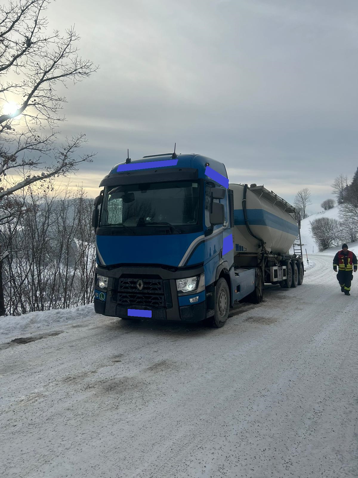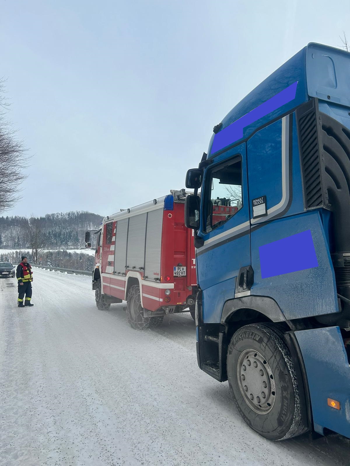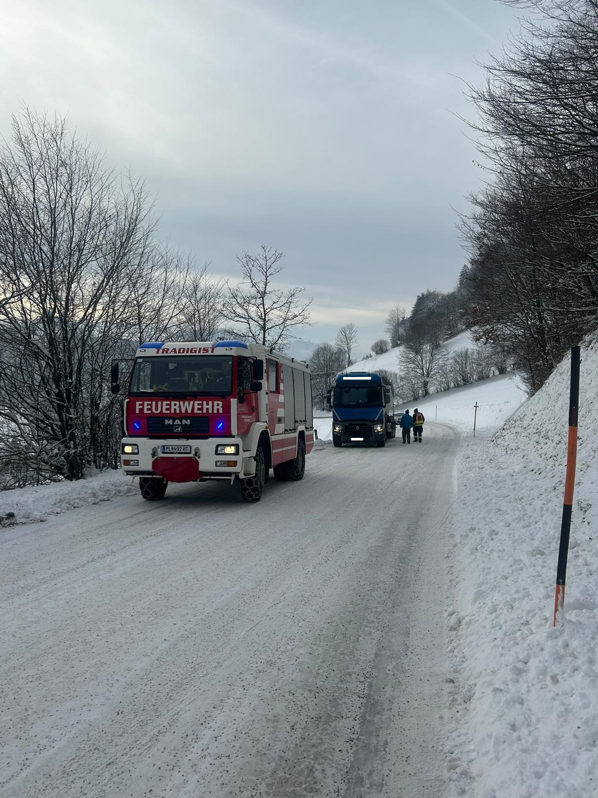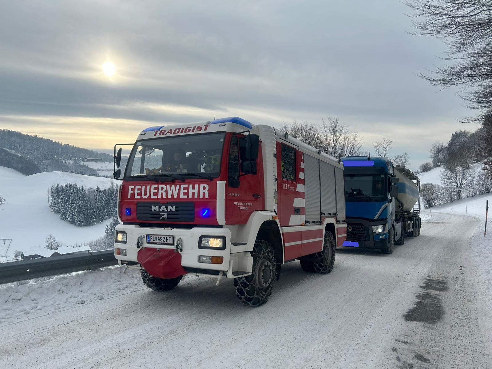 Mit unserem TLFA 3000 und der Schleppstange wurde der Sattelschlepper bis zu einem nahegelegenen Firmenareal geschleppt wo wir dem Fahrer noch halfen die Schneeketten anzulegen.