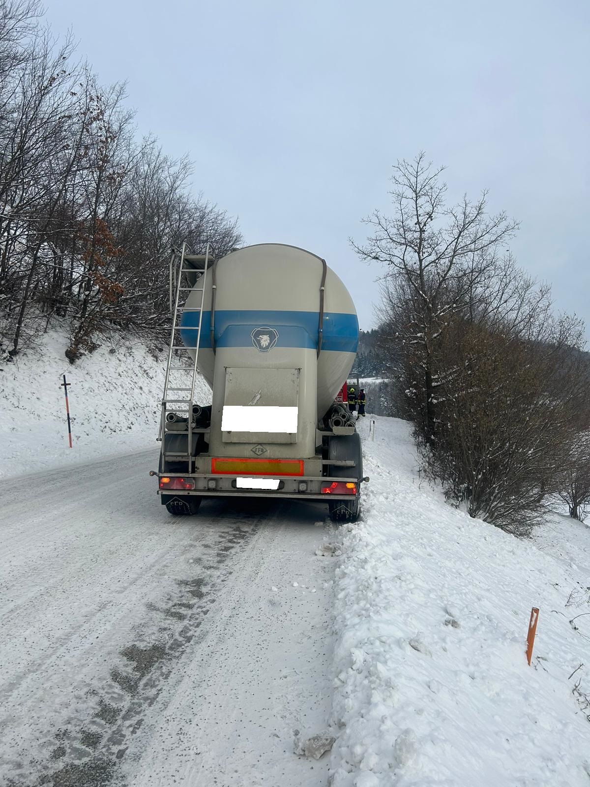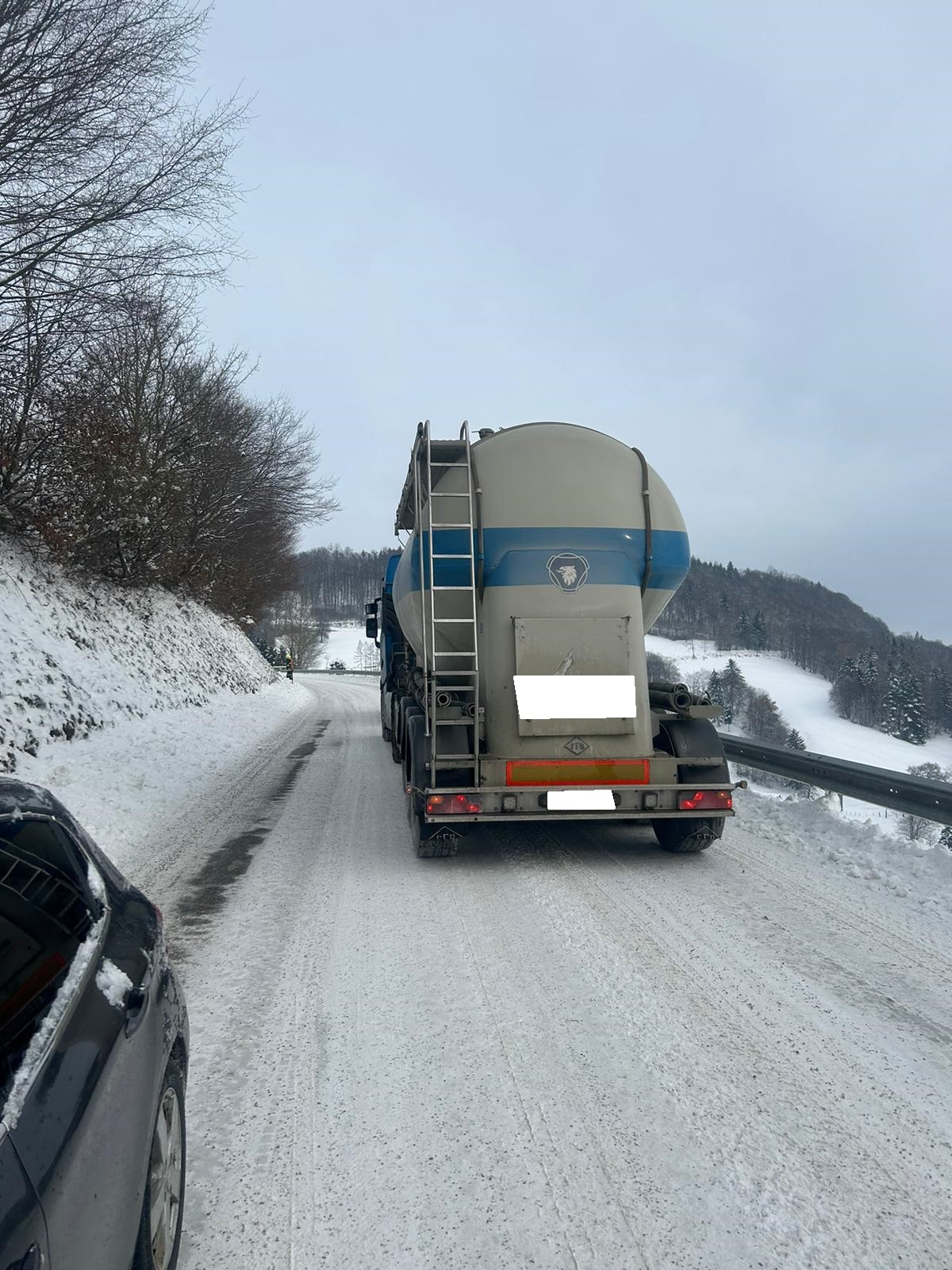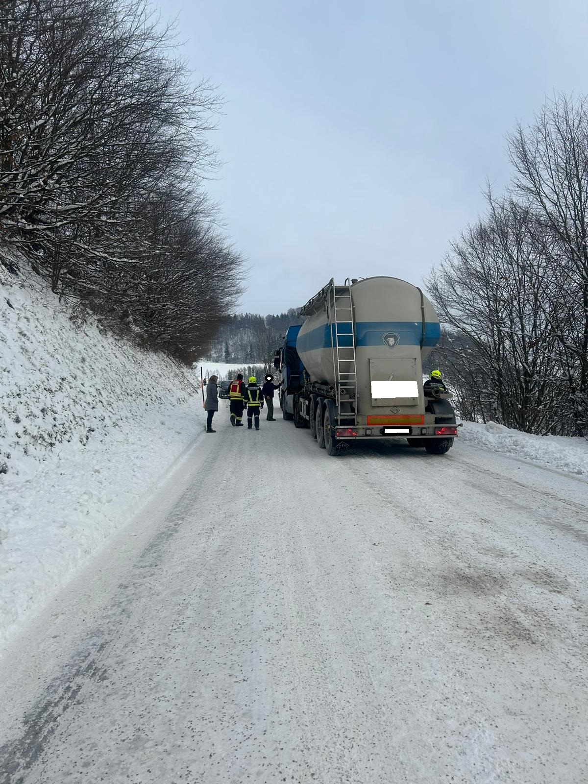 Am Einsatzort angekommen, hing ein Sattelschlepper in einem etwas steileren Stück. Da für die Strecke keine Kettenpflicht vorhanden ist, versuchte es der LKW-Lenker auf der schneebedeckten Fahrbahn ohne Ketten bis er hängenblieb und nicht mehr weiter konnte. Beim Versuch zurückzuschieben geriet das Sattelfahrzeug schon ins Bankett.