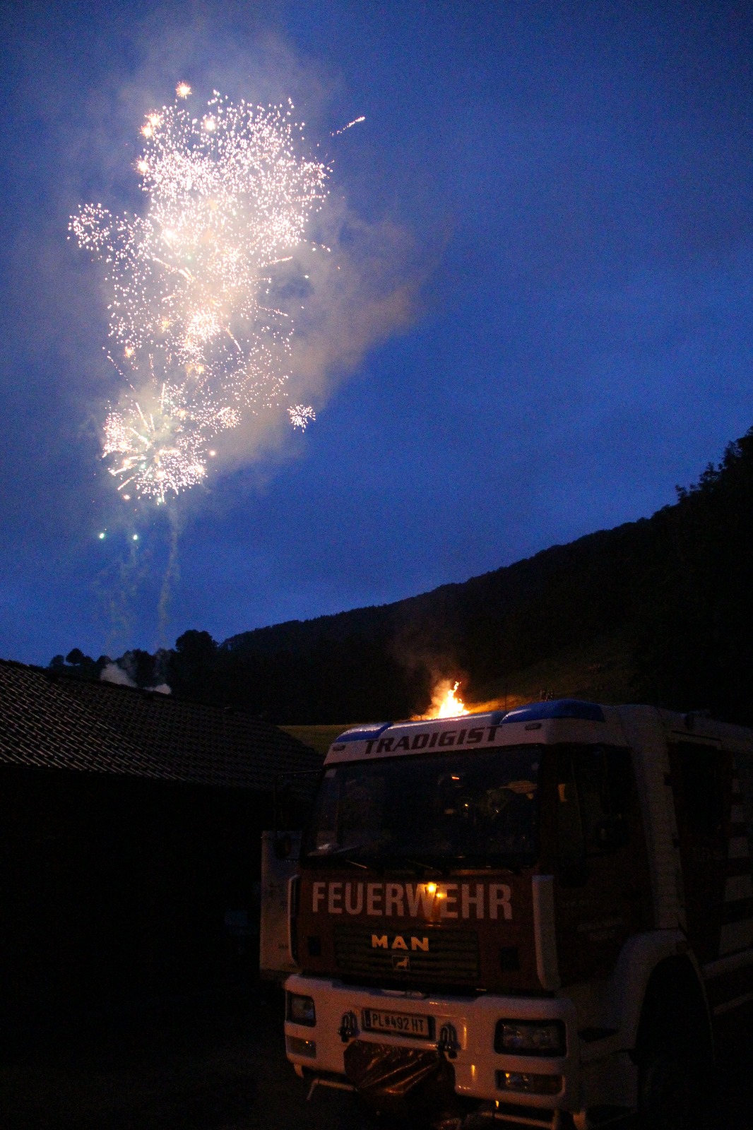Trotz des Regens wurde das Sonnwendfeuer gegen 21:00 Uhr angezündet. Wir sorgten für die notwendigen Sicherheitsmaßnahmen und so konnten alle diese schöne Tradition in sicherem Rahmen genießen.