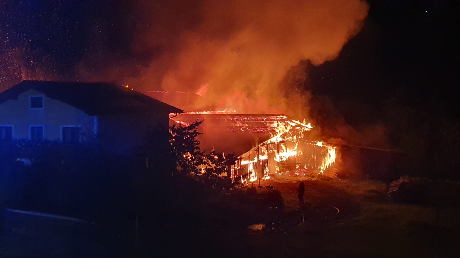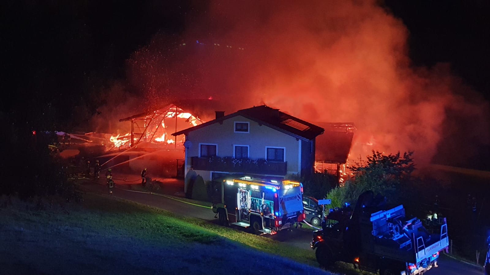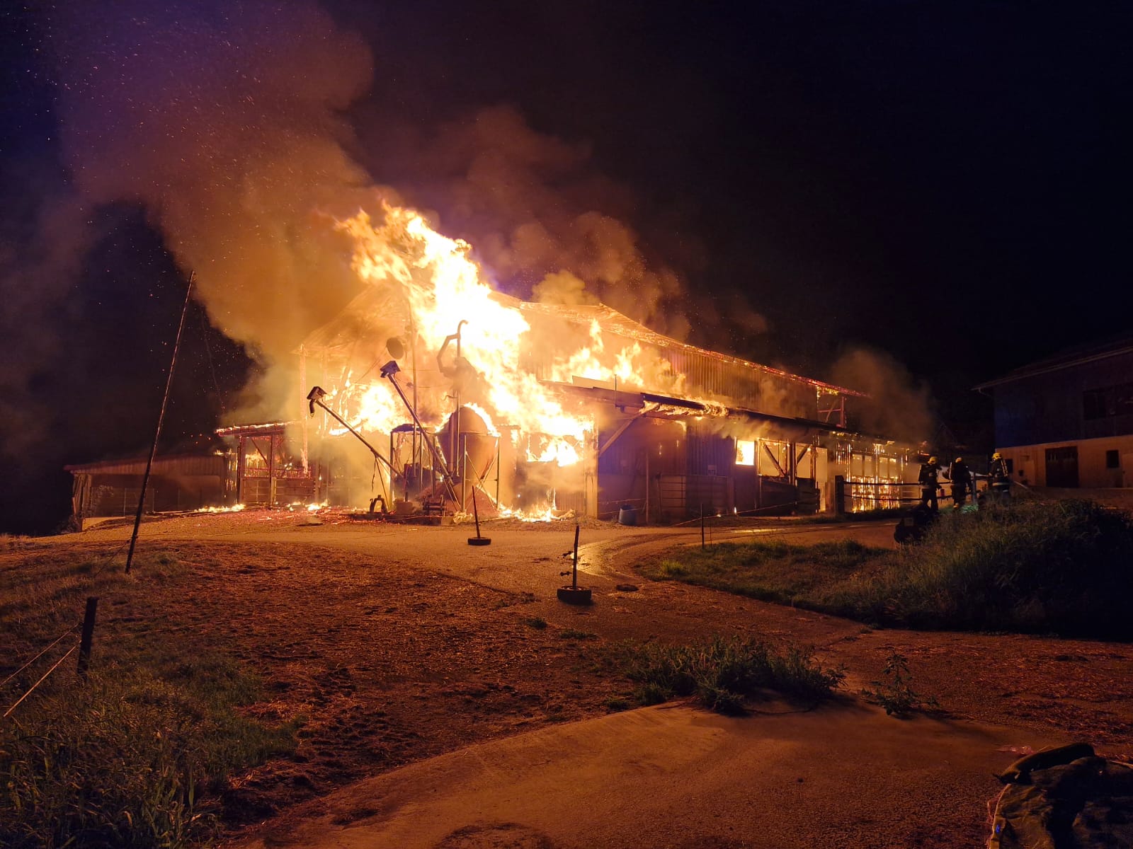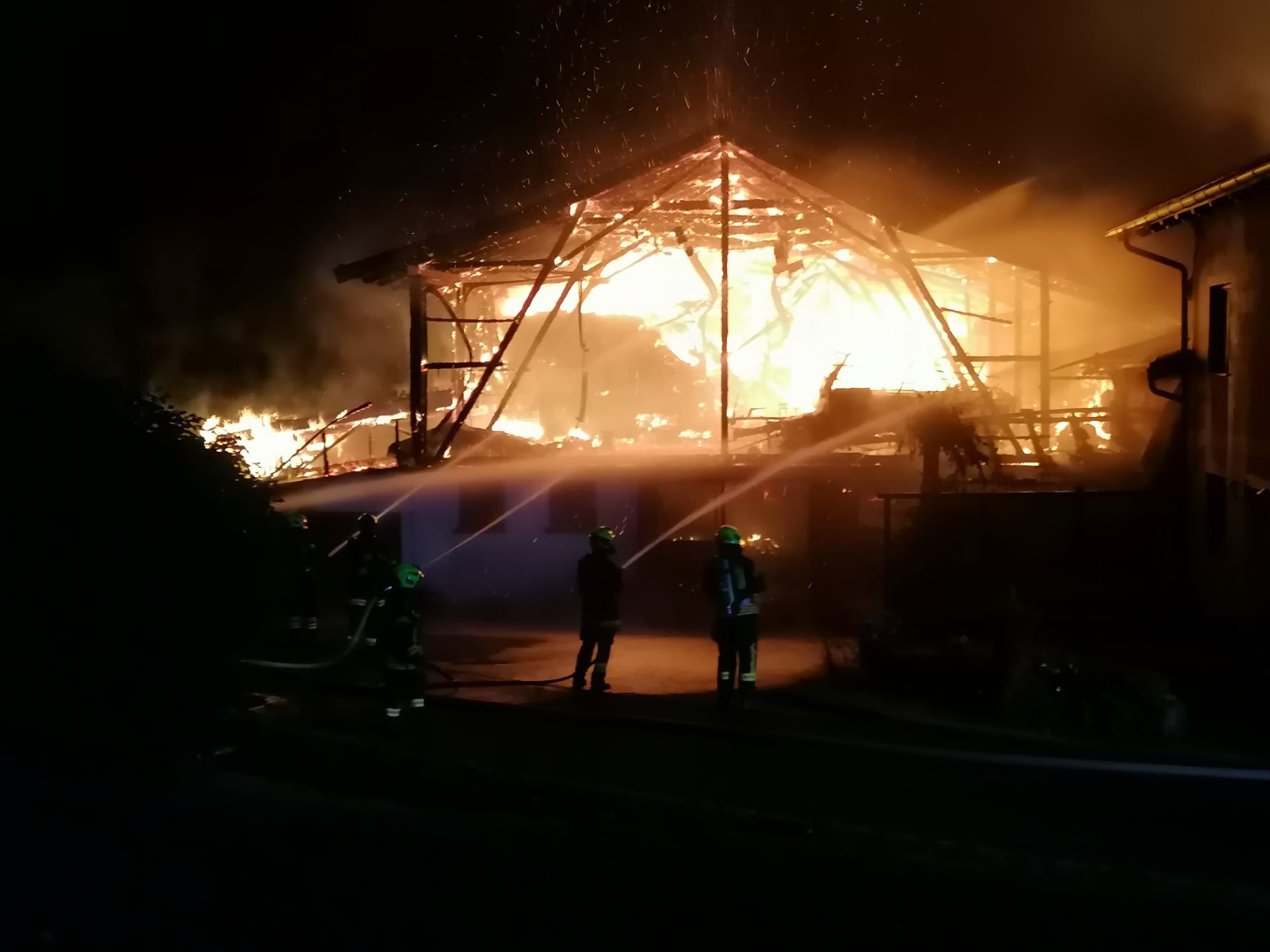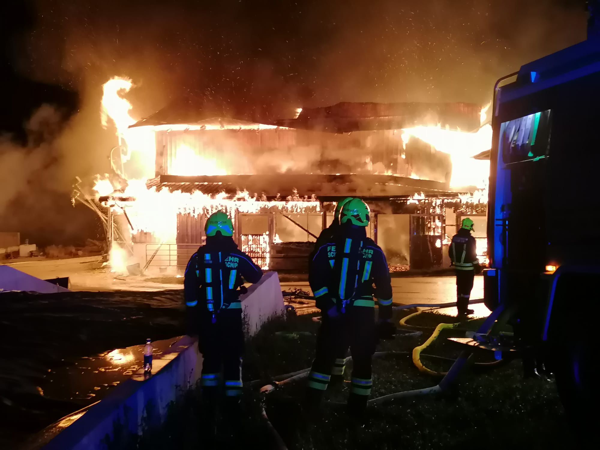 Beim Eintreffen der Einsatzkräfte stand das Stallgebäude eines landwirtschaftlichen Betriebs bereits im Vollbrand. Es galt mit vereinten Kräften das direkt angrenzende Wohnhaus zu schützen.