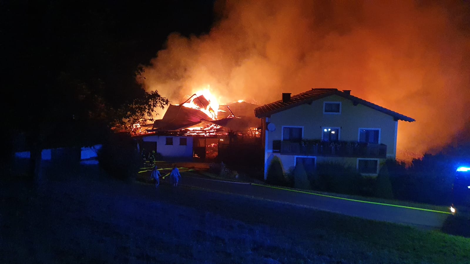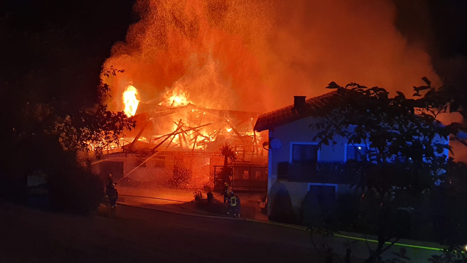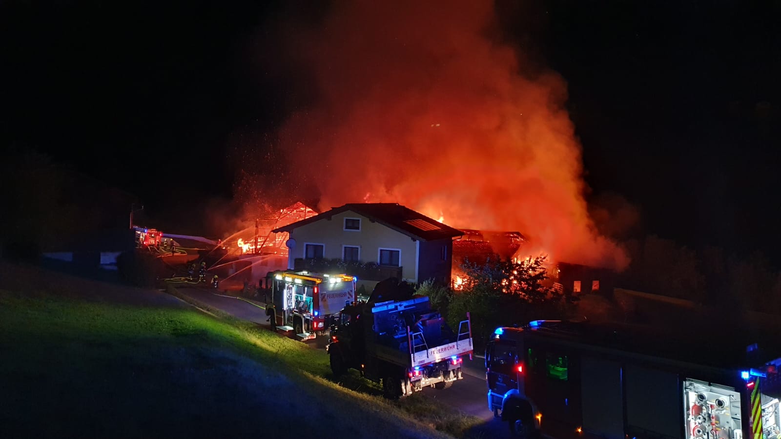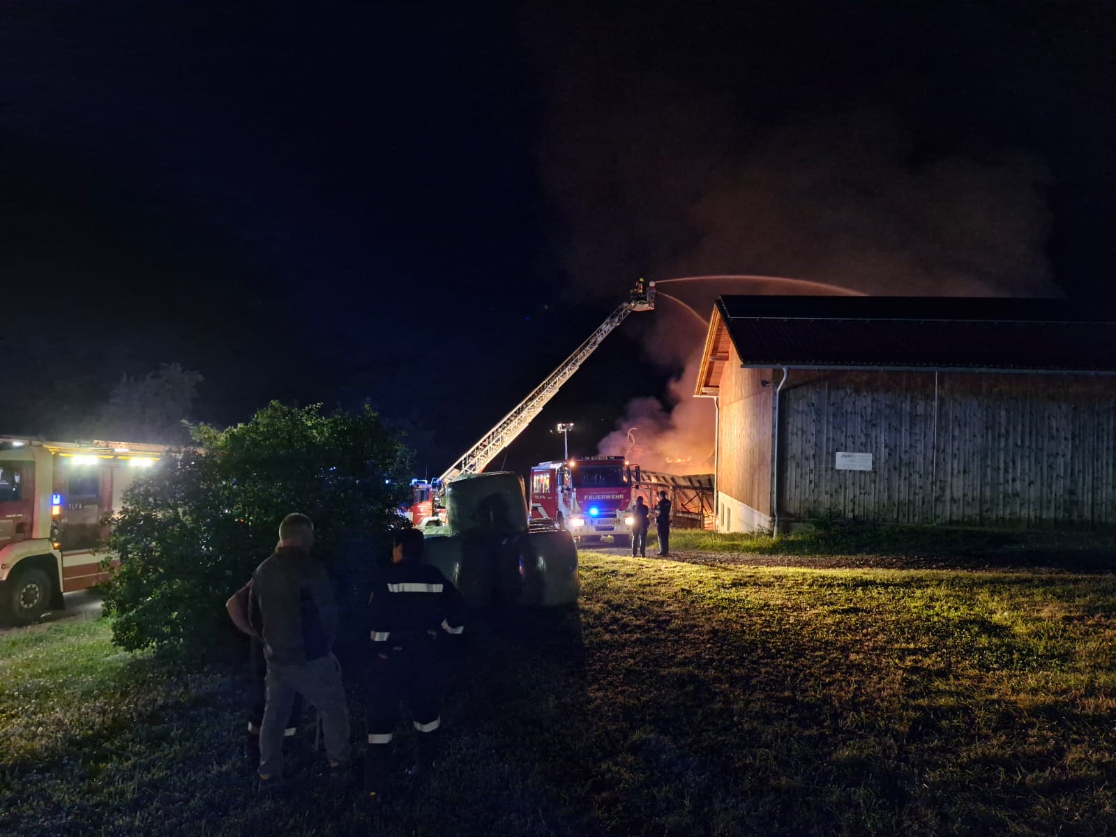 Beim Eintreffen der Einsatzkräfte stand das Stallgebäude eines landwirtschaftlichen Betriebs bereits im Vollbrand. Es galt mit vereinten Kräften das direkt angrenzende Wohnhaus zu schützen.