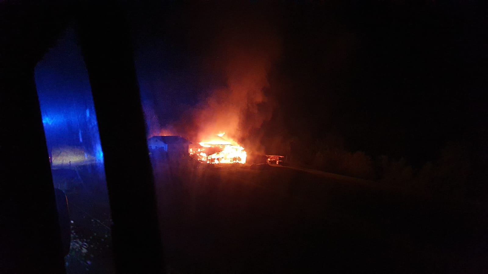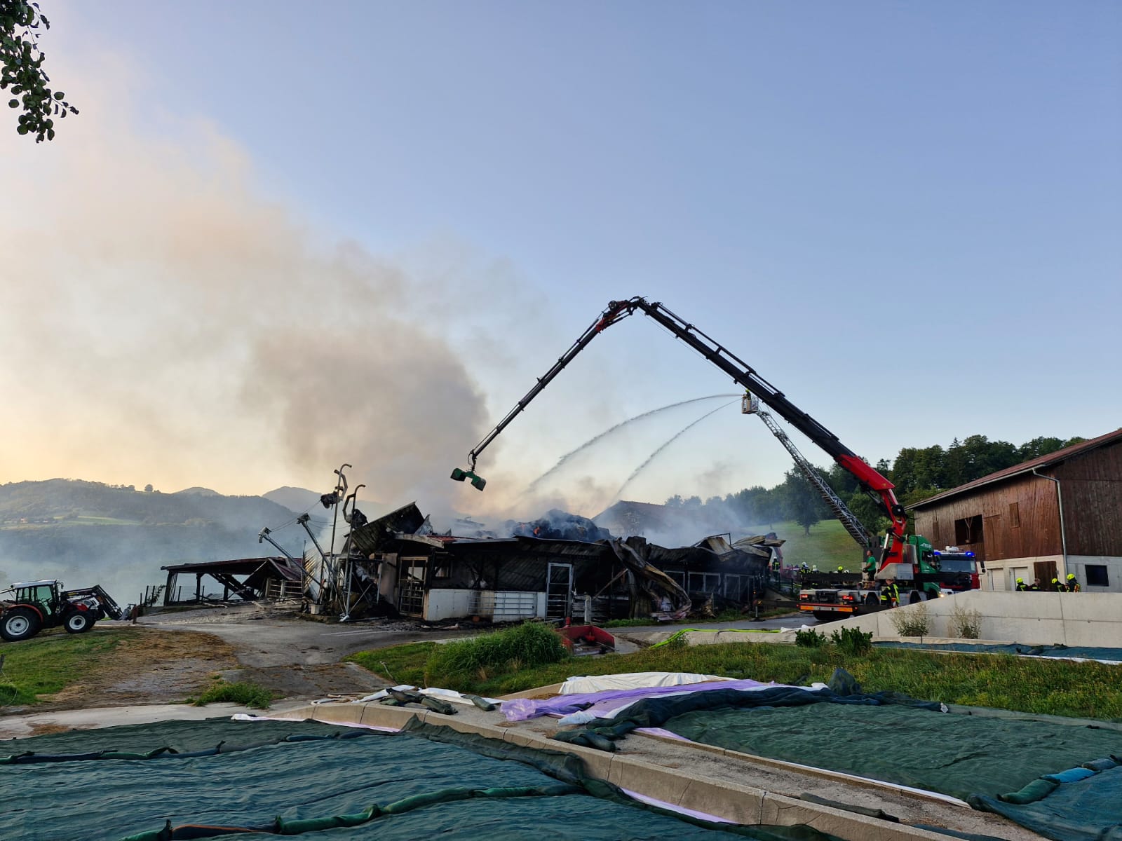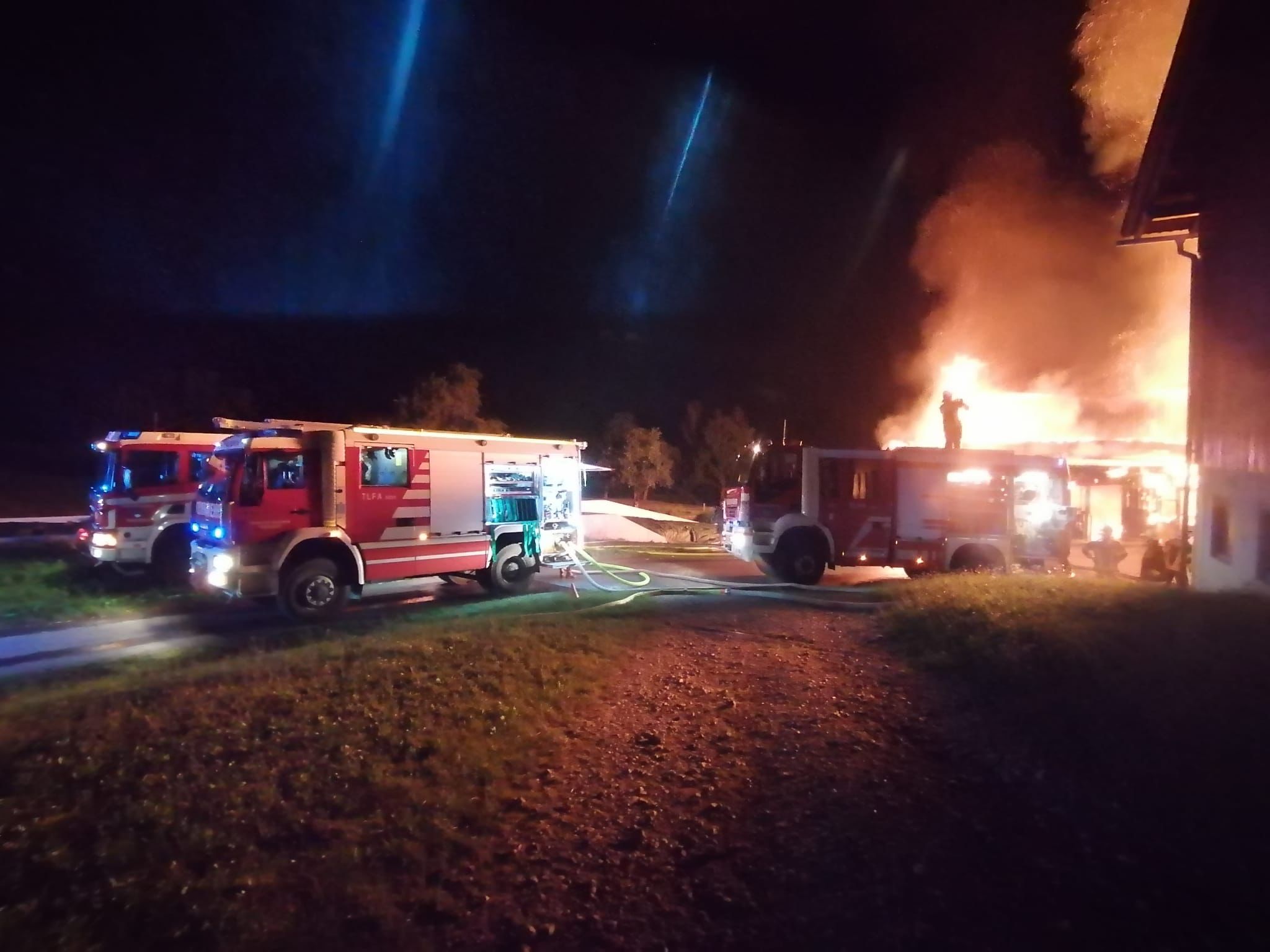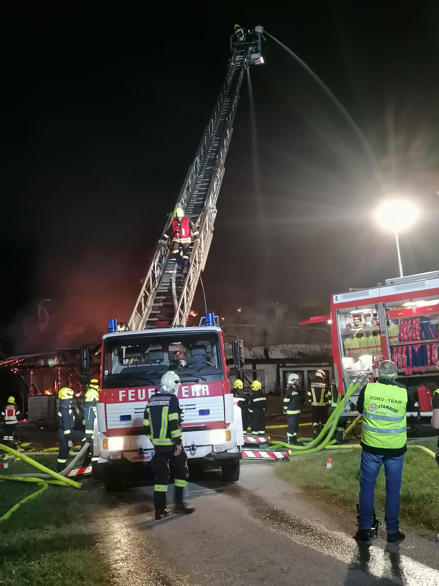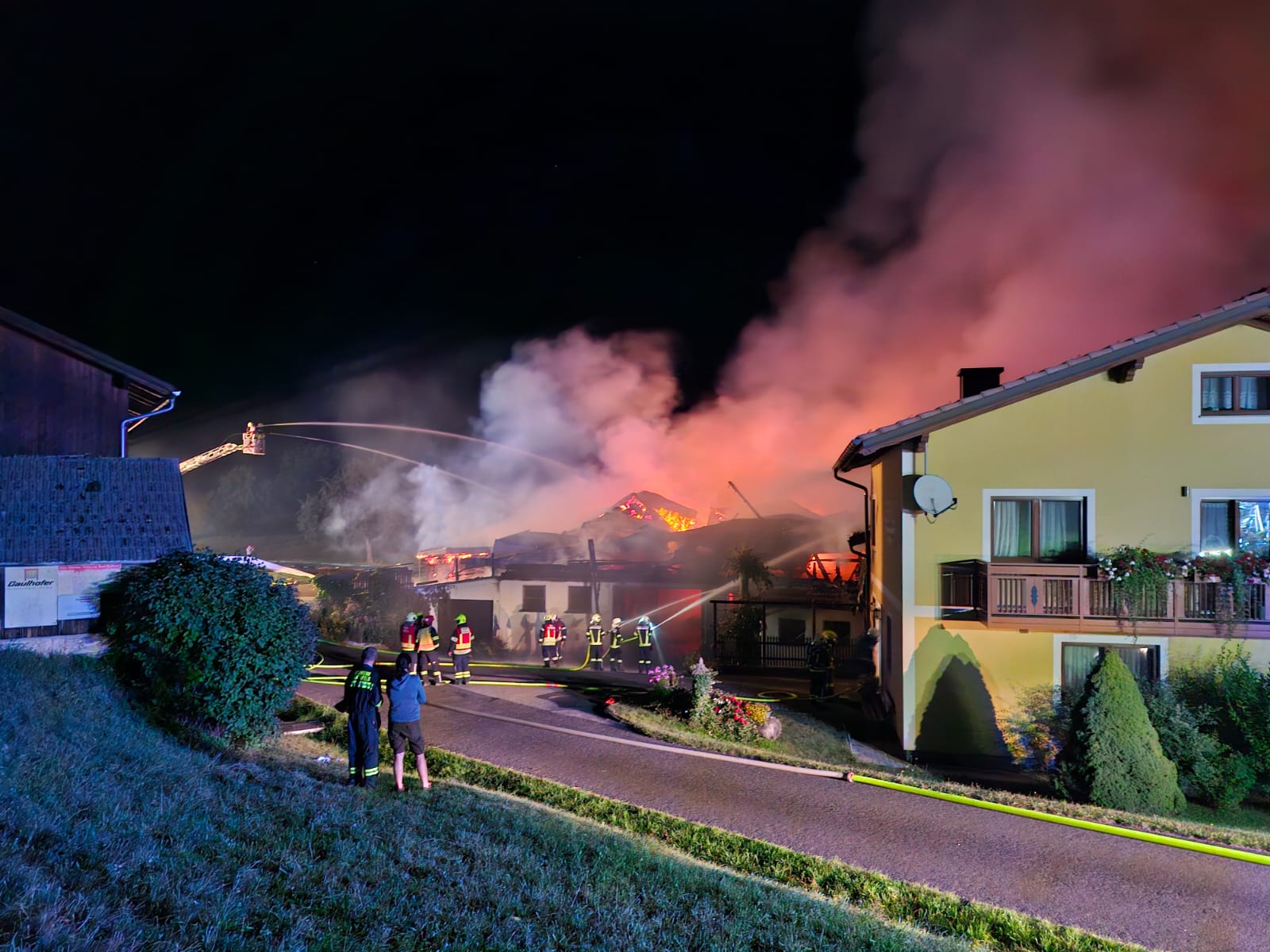 Beim Eintreffen der Einsatzkräfte stand das Stallgebäude eines landwirtschaftlichen Betriebs bereits im Vollbrand. Es galt mit vereinten Kräften das direkt angrenzende Wohnhaus zu schützen.