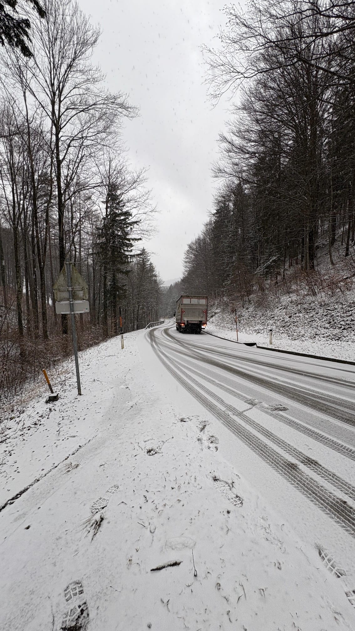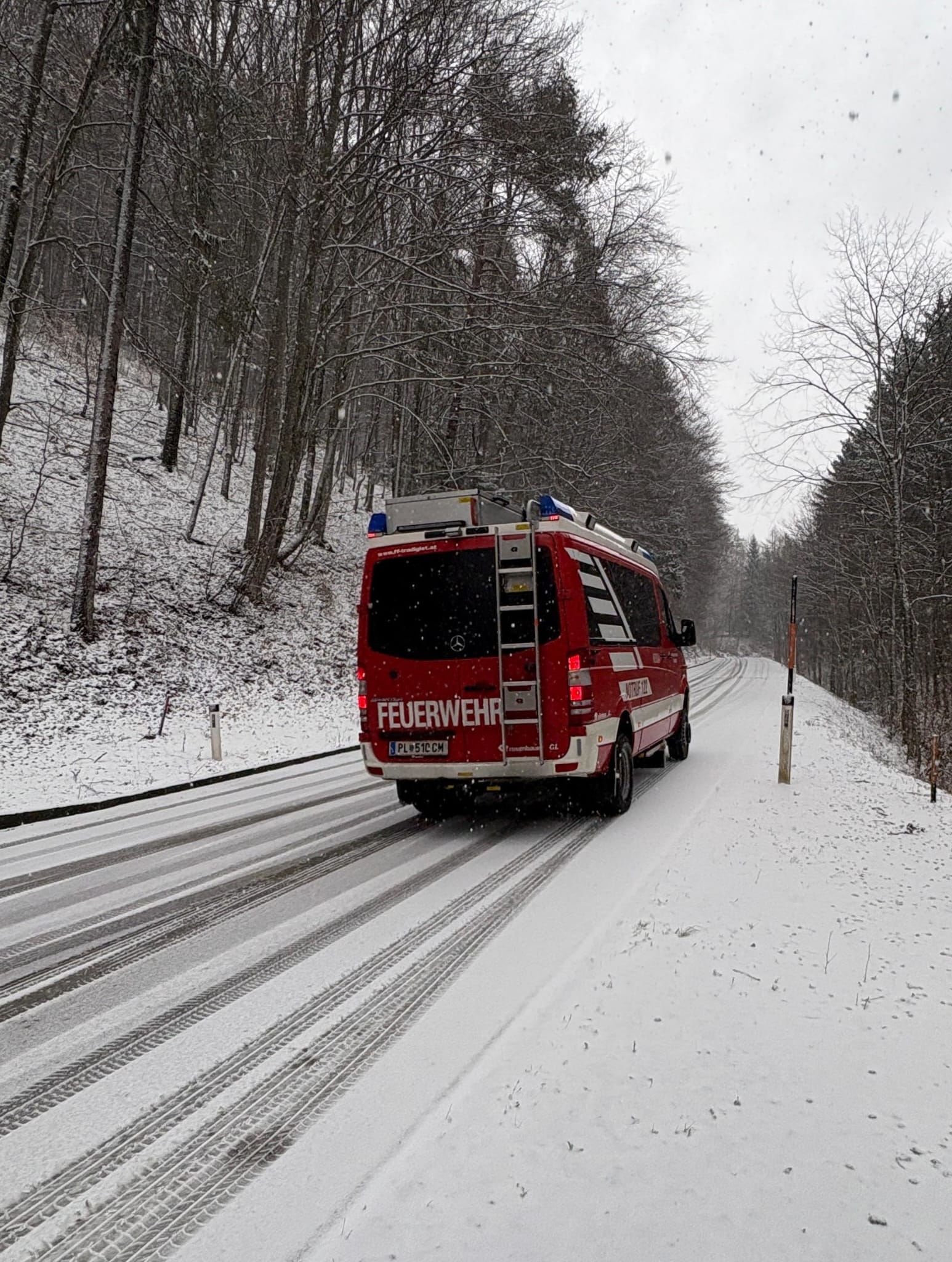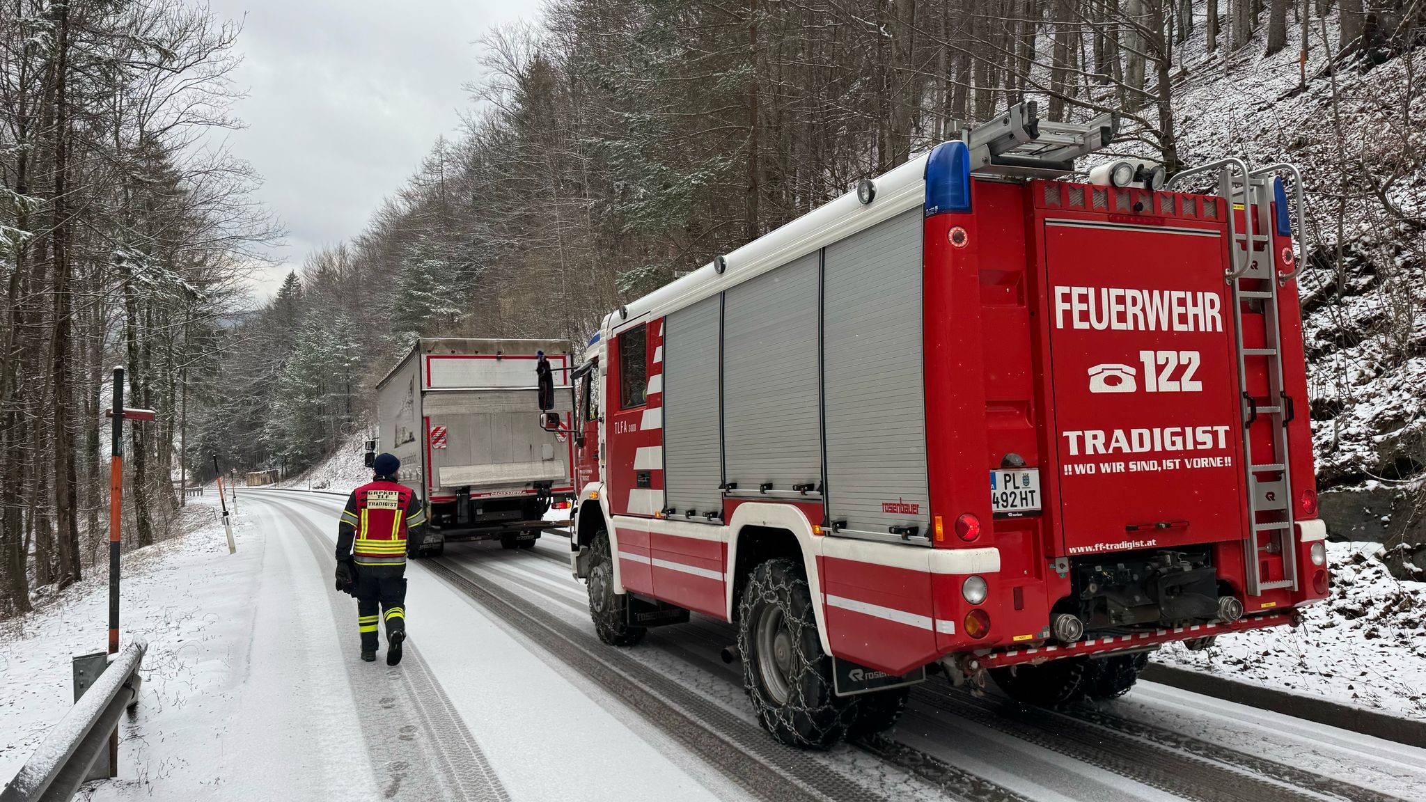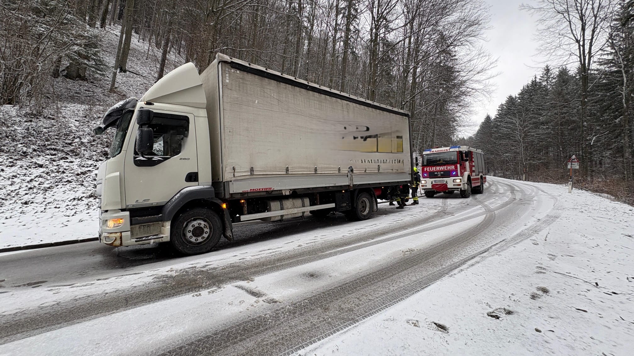 Ein LKW geriet bergab ins Rutschen. Der Fahrer setzte seine Fahrt zur Sicherheit ohne Unterstützung nicht weiter fort und alarmierte die Feuerwehr.