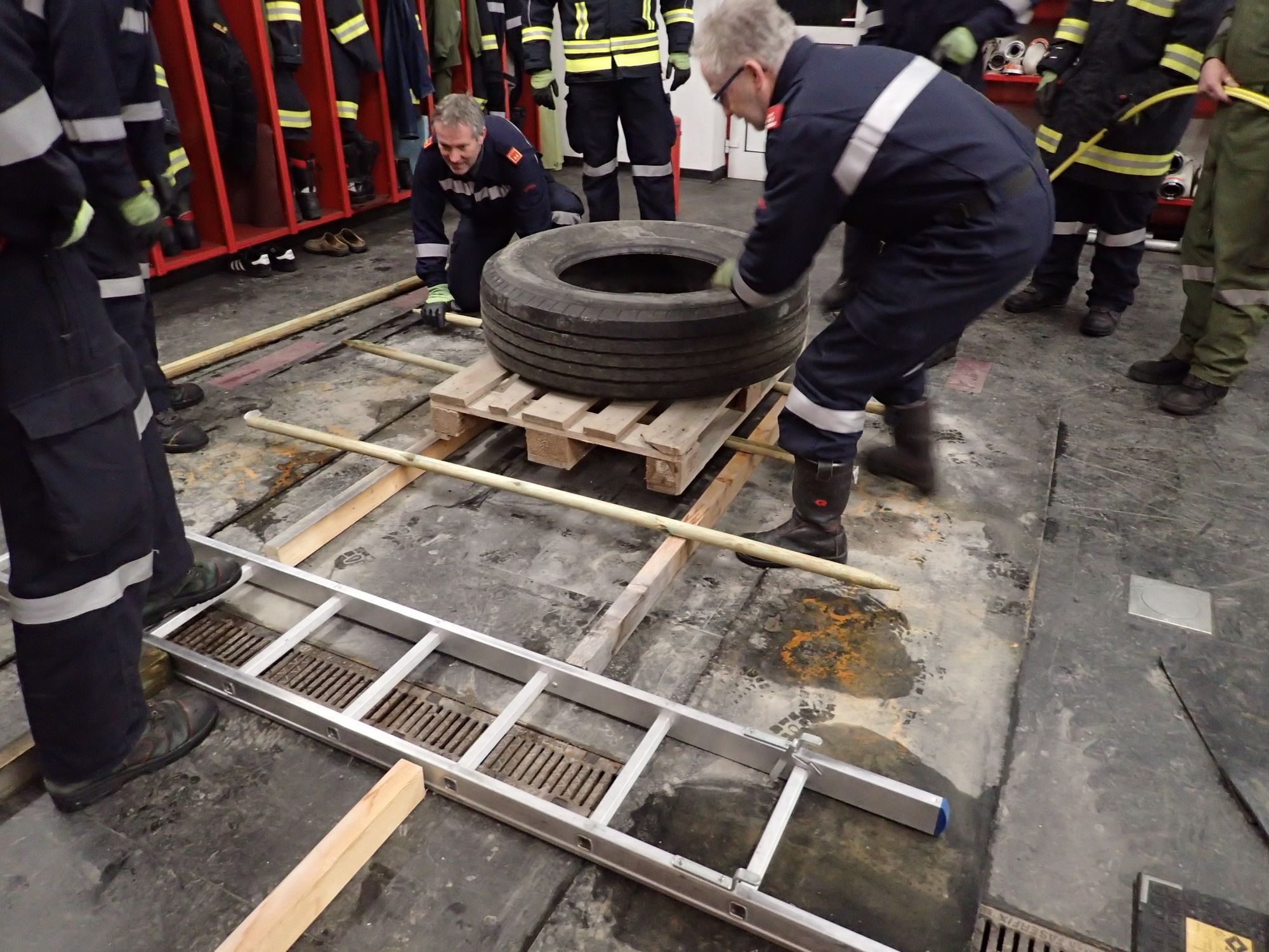 Eine Holzpalette, auf der ein LKW Reifen liegt, muss ohne Kraftaufwand durch die Mannschaft über den durch die Steckleiter simulierten Bach transportiert werden.