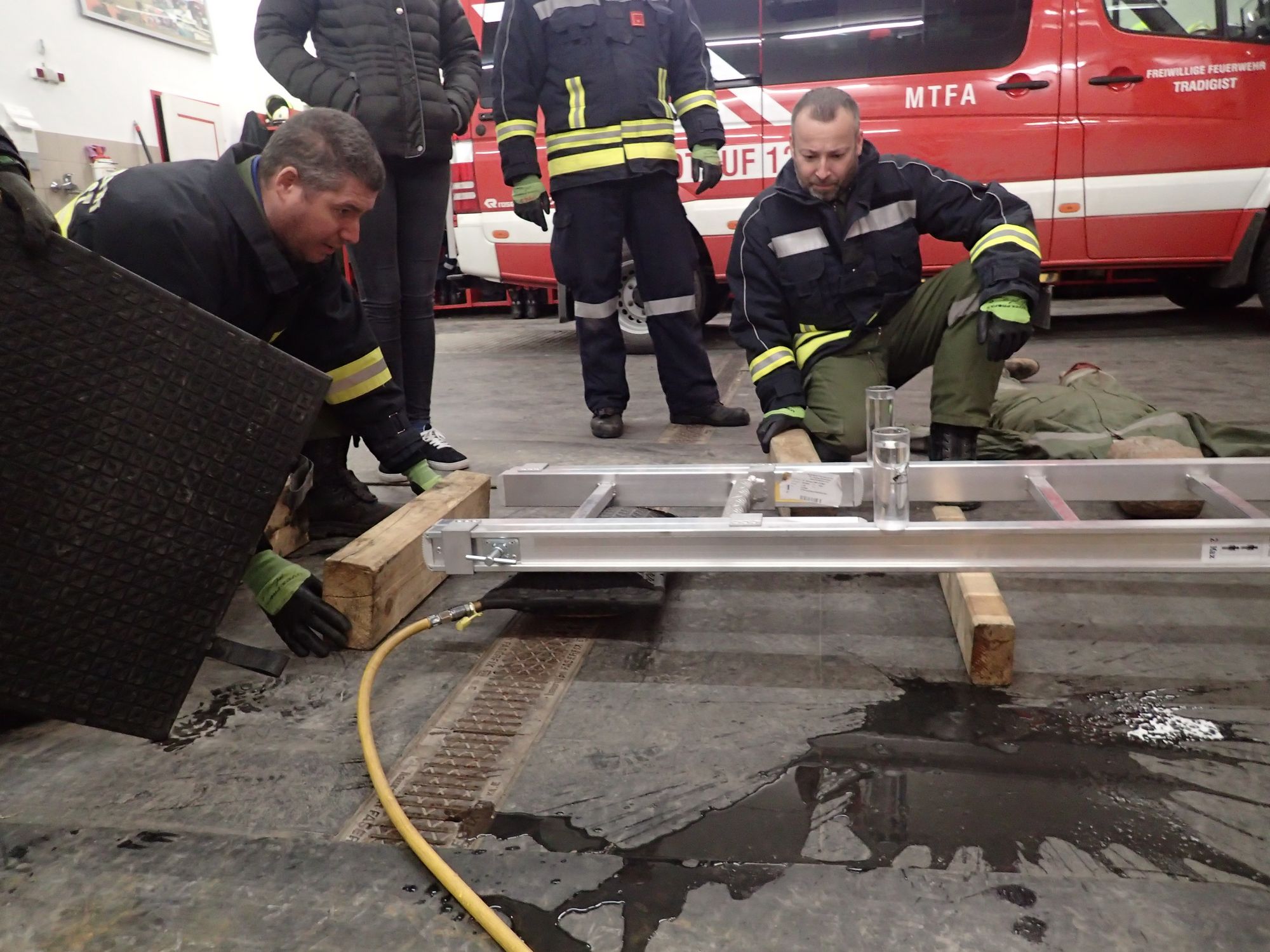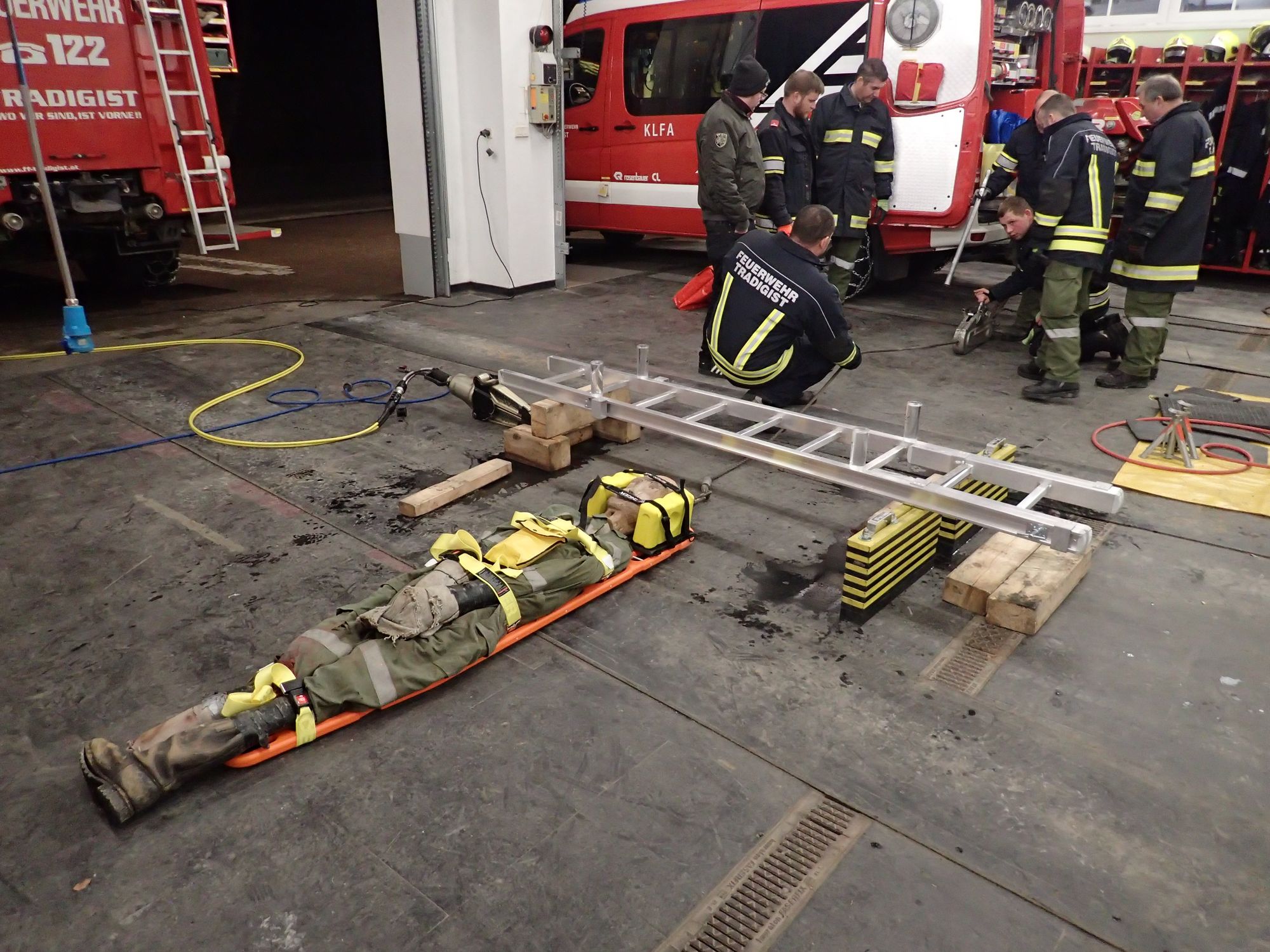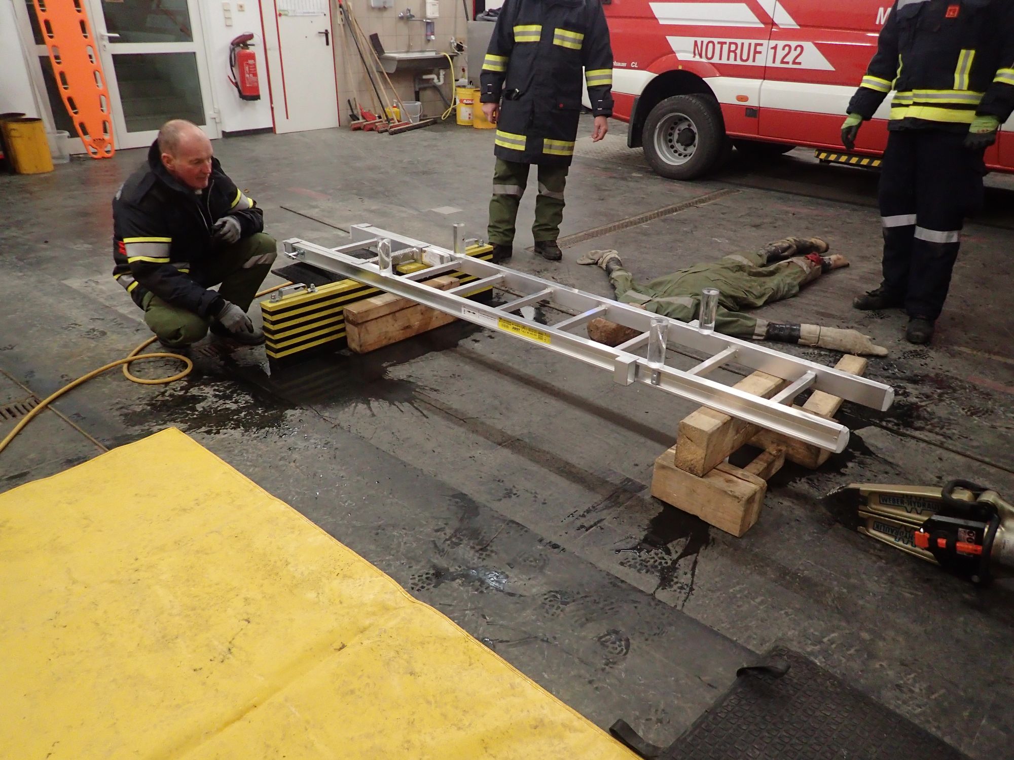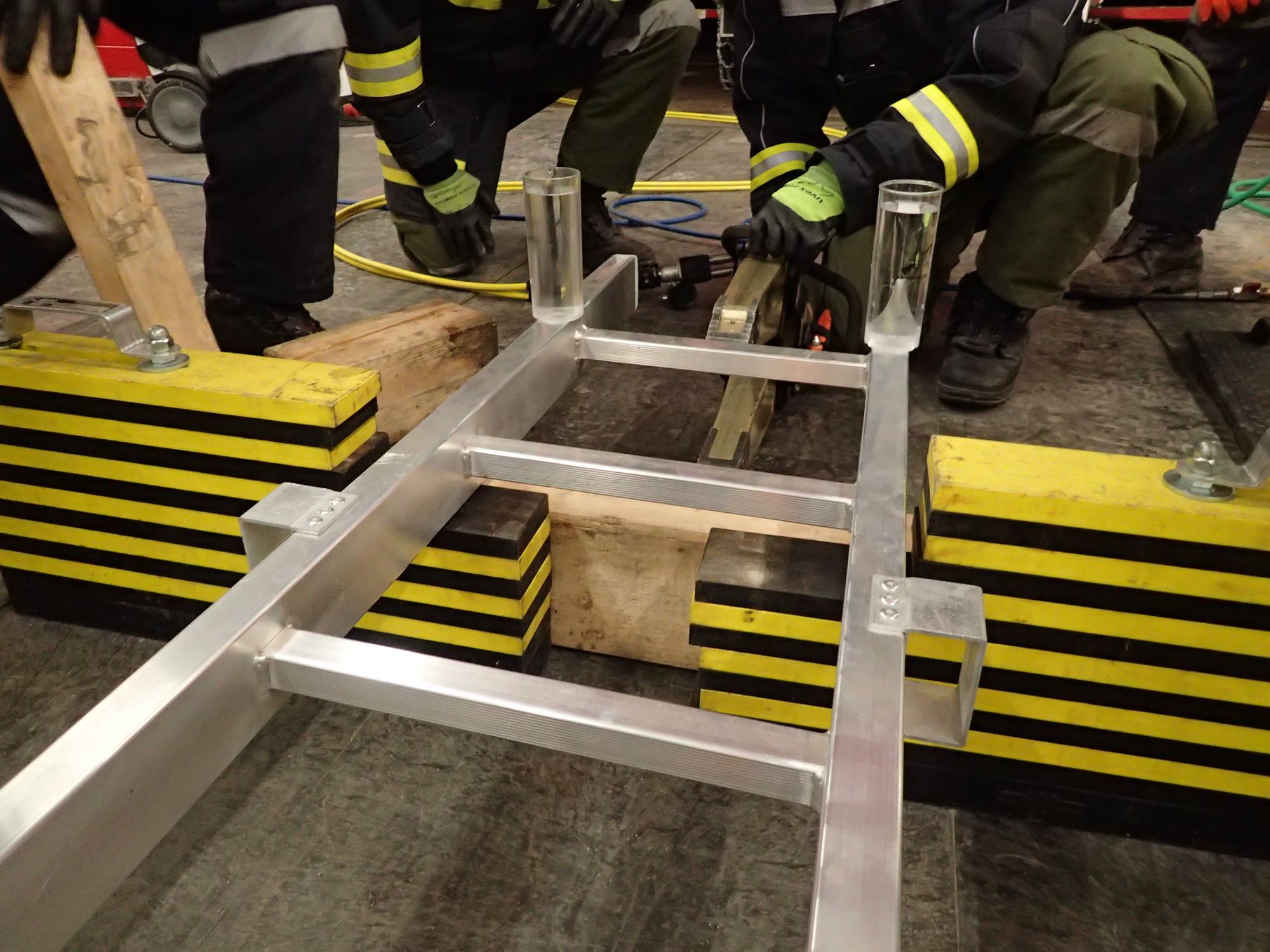 Es galt eine verunfallte Person sicher und möglichst schonend durch eine schmale Öffnung zu retten. Dazu musste ein Hindernis vorsichtig angehoben und fixiert werden. Mit Wasser gefüllte Becher zeigten jede Erschütterung und ruckartige Bewegung an, sodass konzentriertes und genaues Arbeiten gefordert war. Anschließend konnte die Person, an einem Spineboard gesichert, unter dem Hindernis durchgezogen werden.