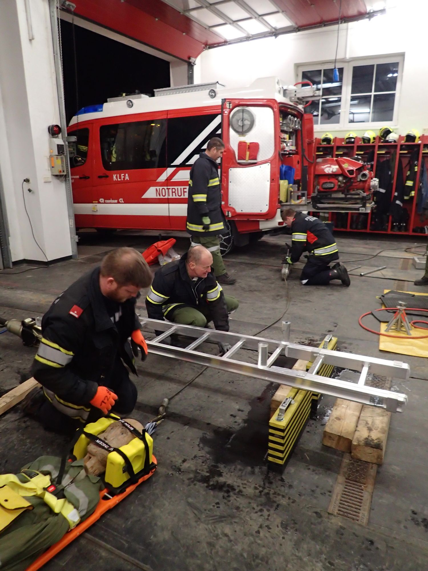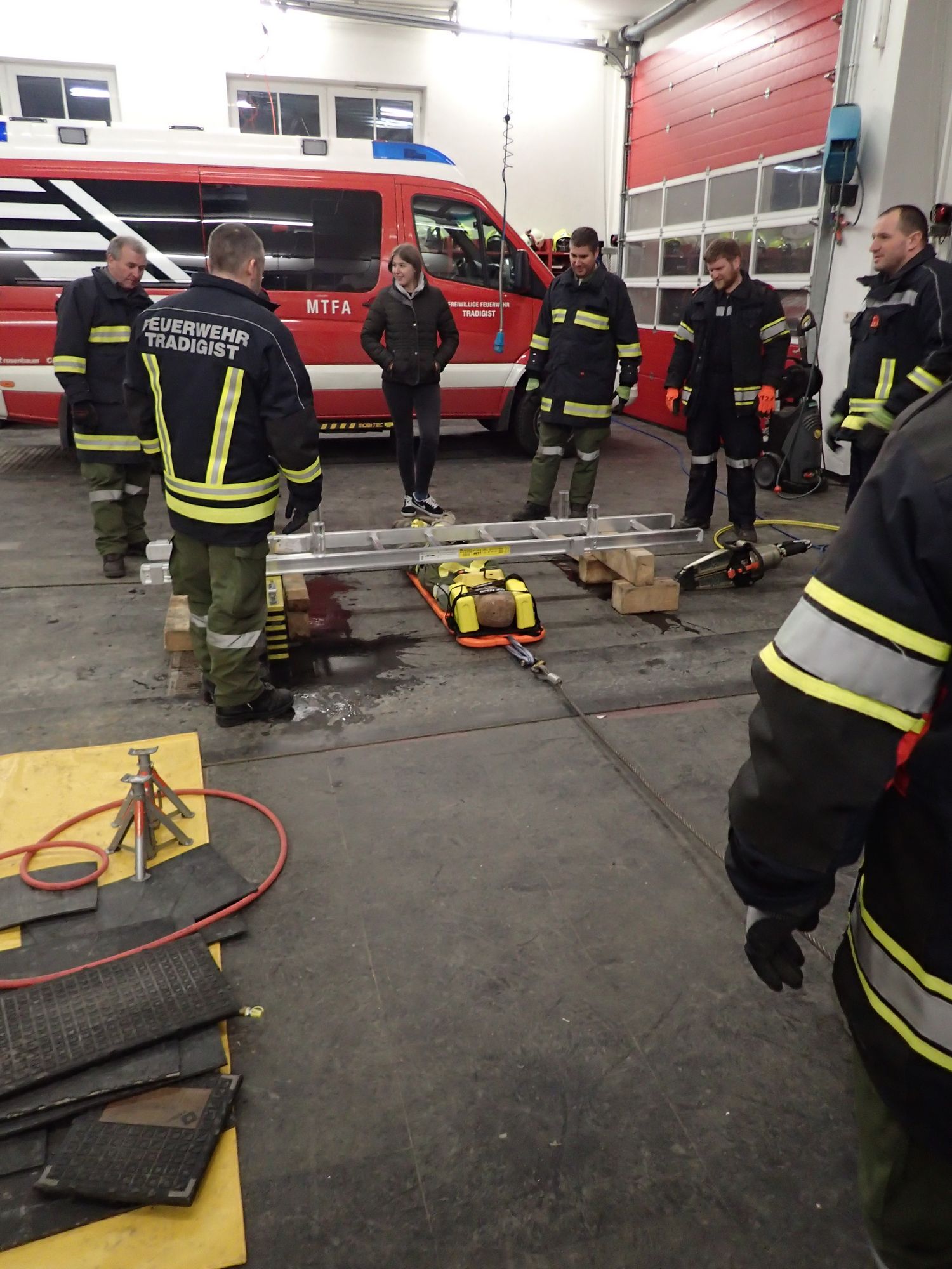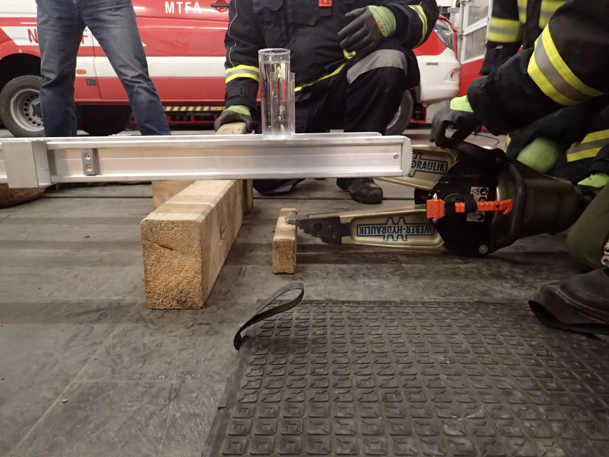 Es galt eine verunfallte Person sicher und möglichst schonend durch eine schmale Öffnung zu retten. Dazu musste ein Hindernis vorsichtig angehoben und fixiert werden. Mit Wasser gefüllte Becher zeigten jede Erschütterung und ruckartige Bewegung an, sodass konzentriertes und genaues Arbeiten gefordert war. Anschließend konnte die Person, an einem Spineboard gesichert, unter dem Hindernis durchgezogen werden.