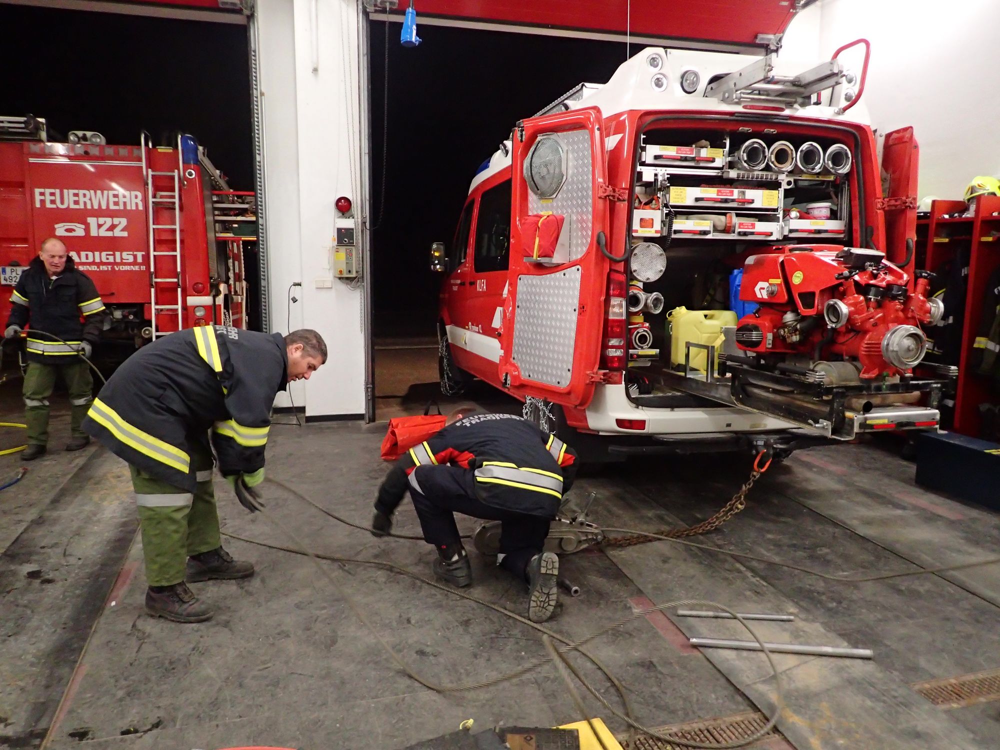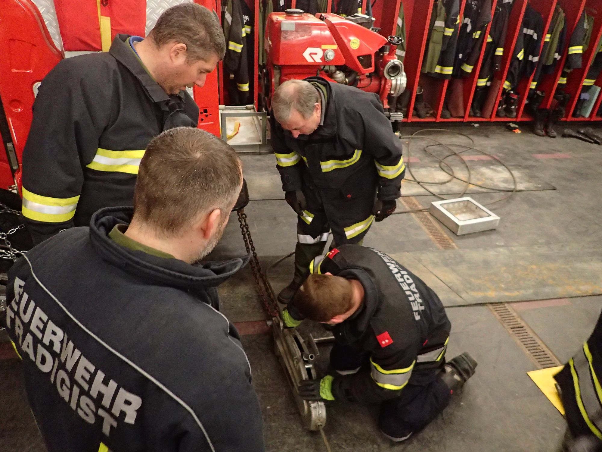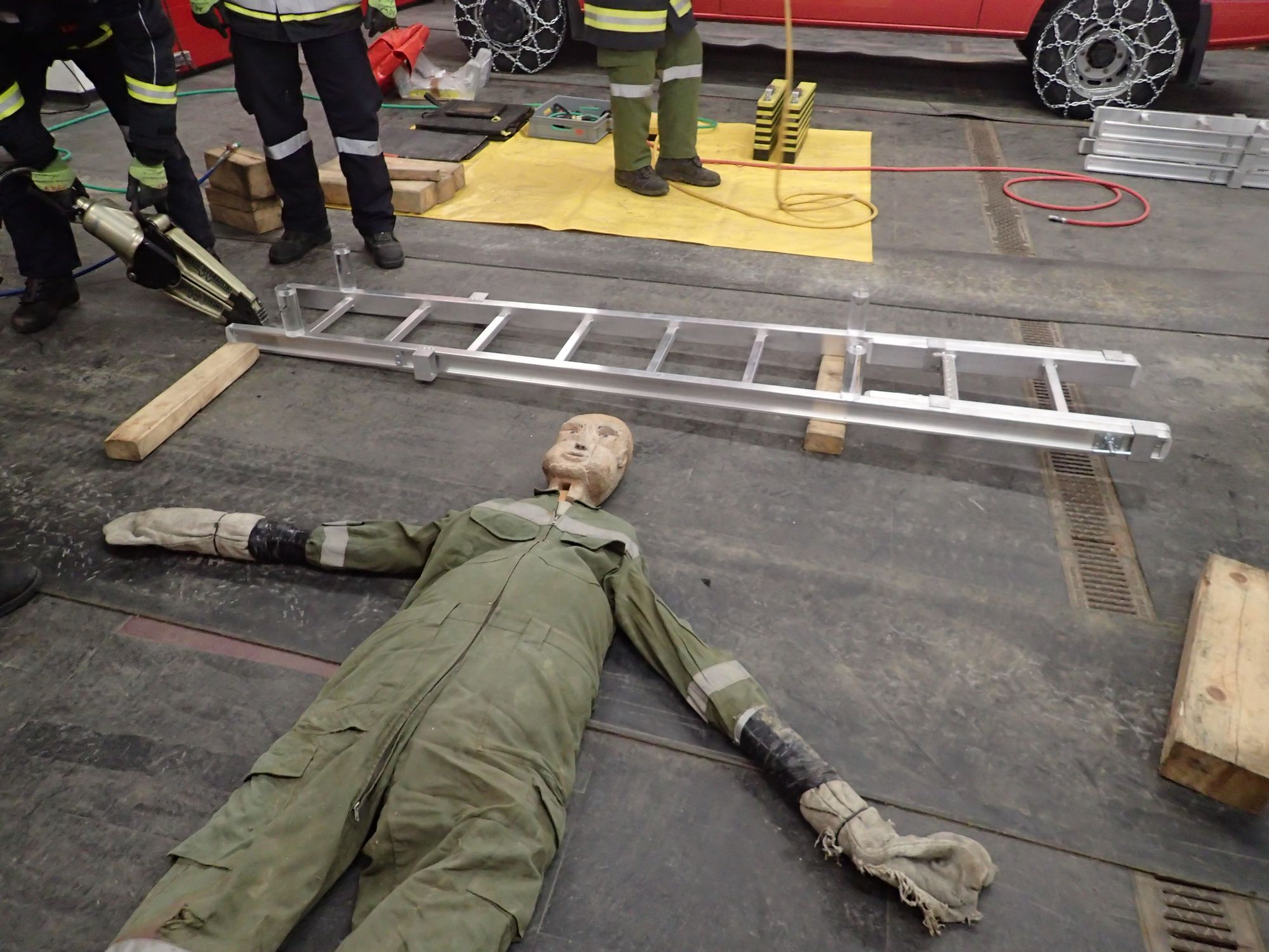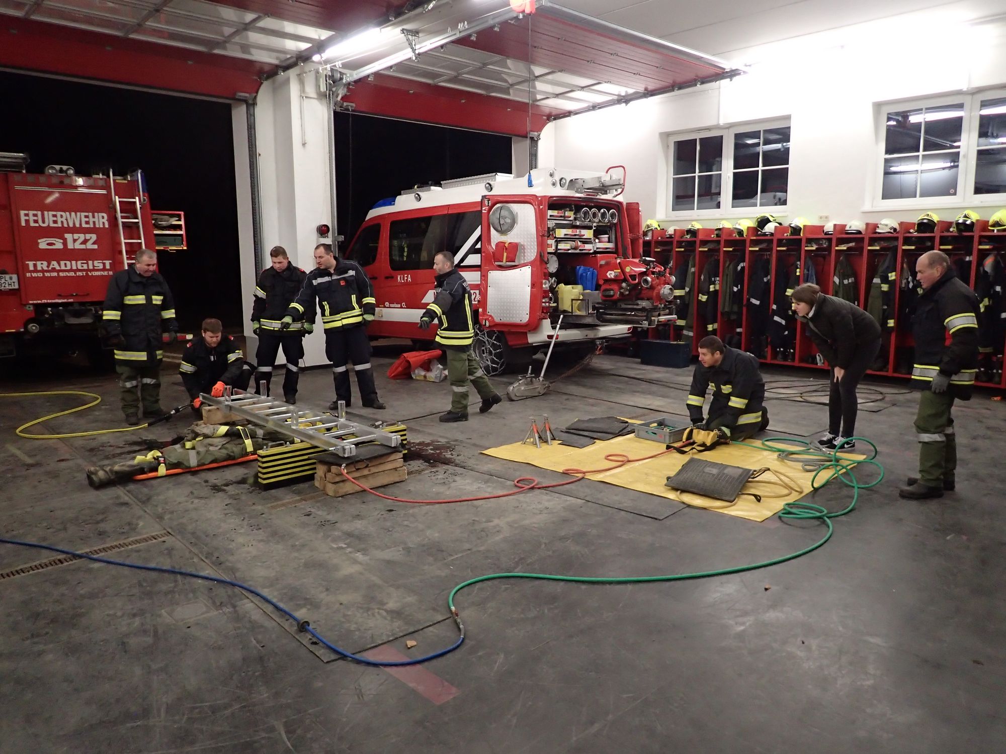 Es galt eine verunfallte Person sicher und möglichst schonend durch eine schmale Öffnung zu retten. Dazu musste ein Hindernis vorsichtig angehoben und fixiert werden. Mit Wasser gefüllte Becher zeigten jede Erschütterung und ruckartige Bewegung an, sodass konzentriertes und genaues Arbeiten gefordert war. Anschließend konnte die Person, an einem Spineboard gesichert, unter dem Hindernis durchgezogen werden.