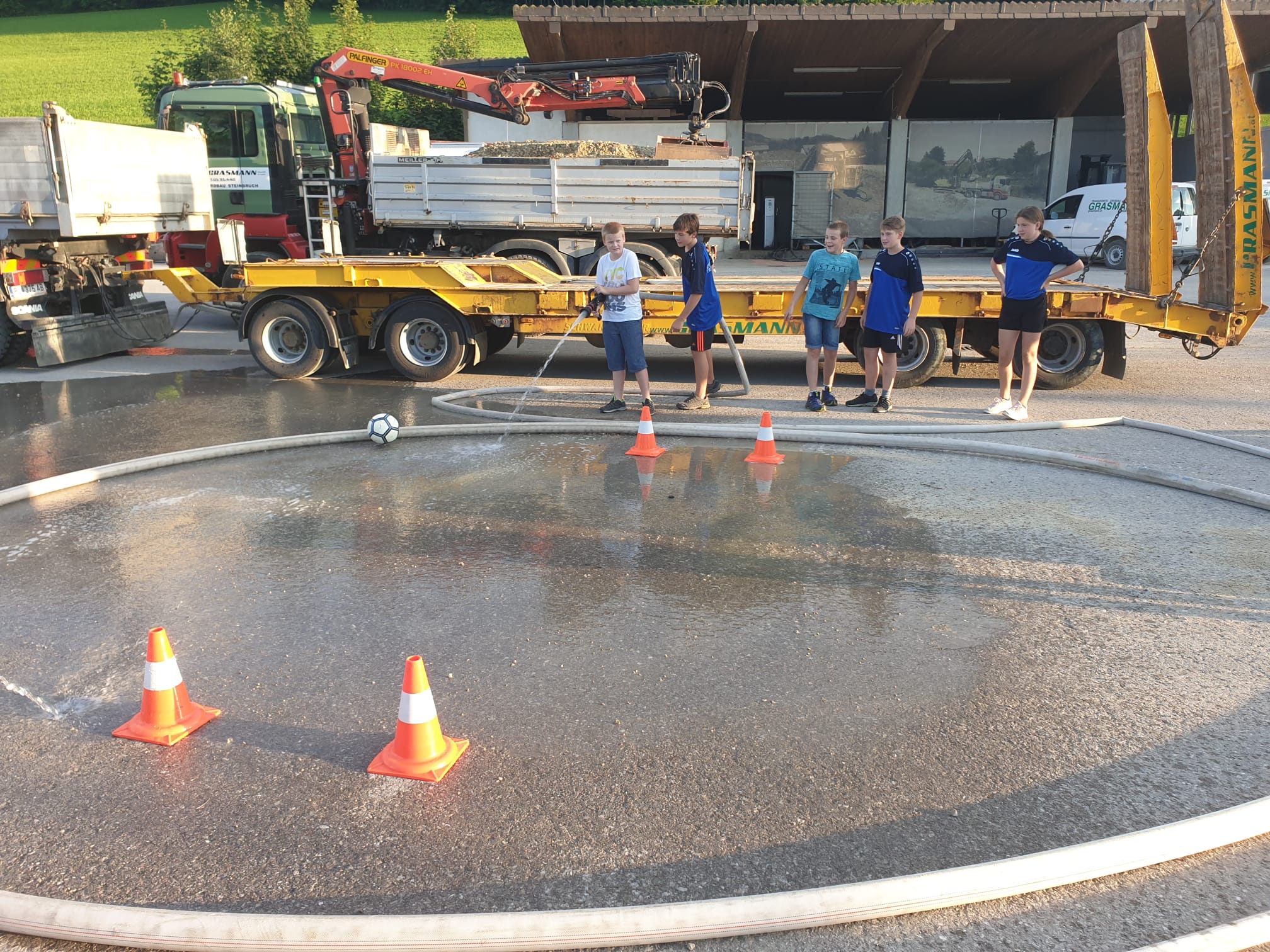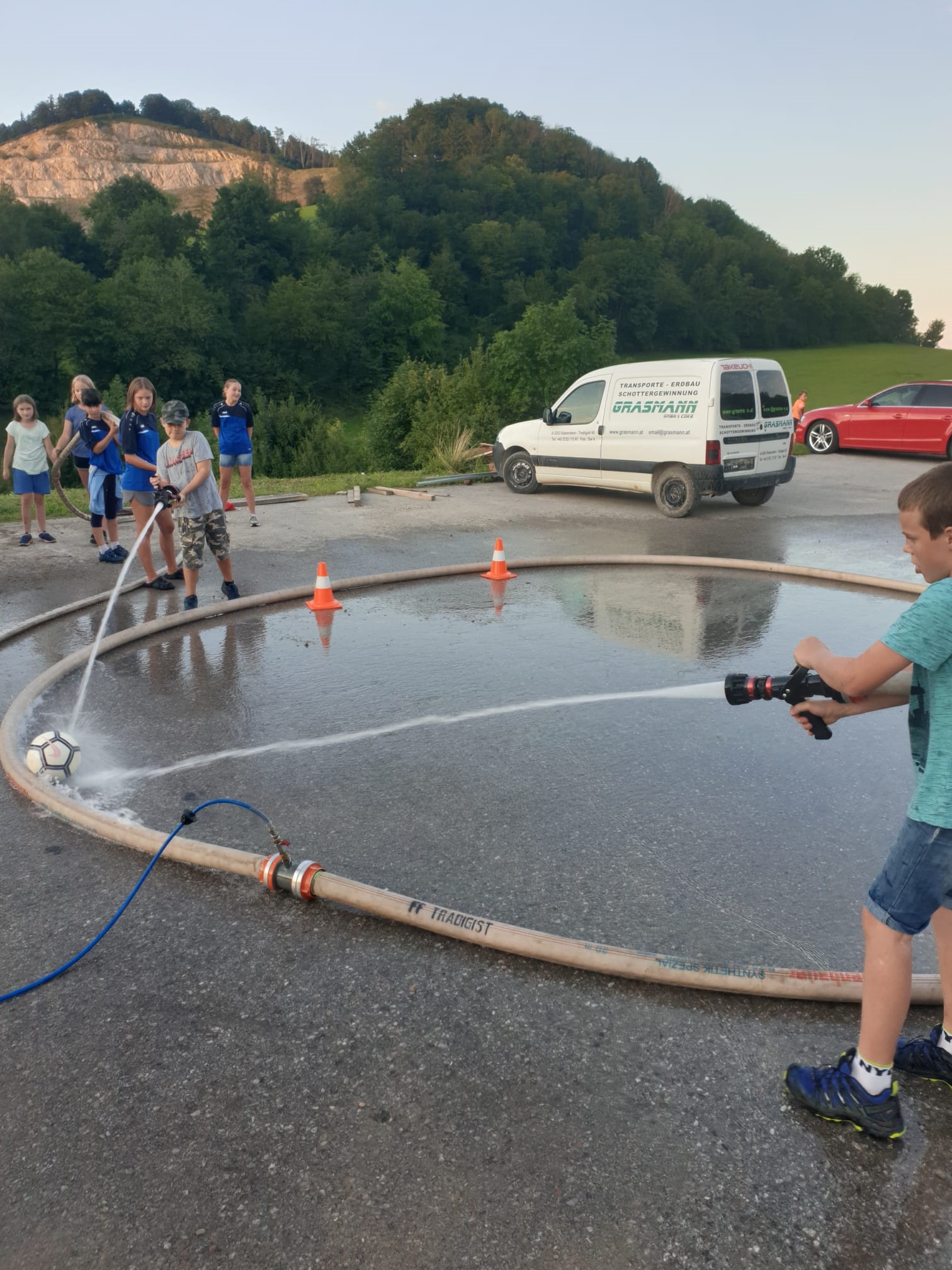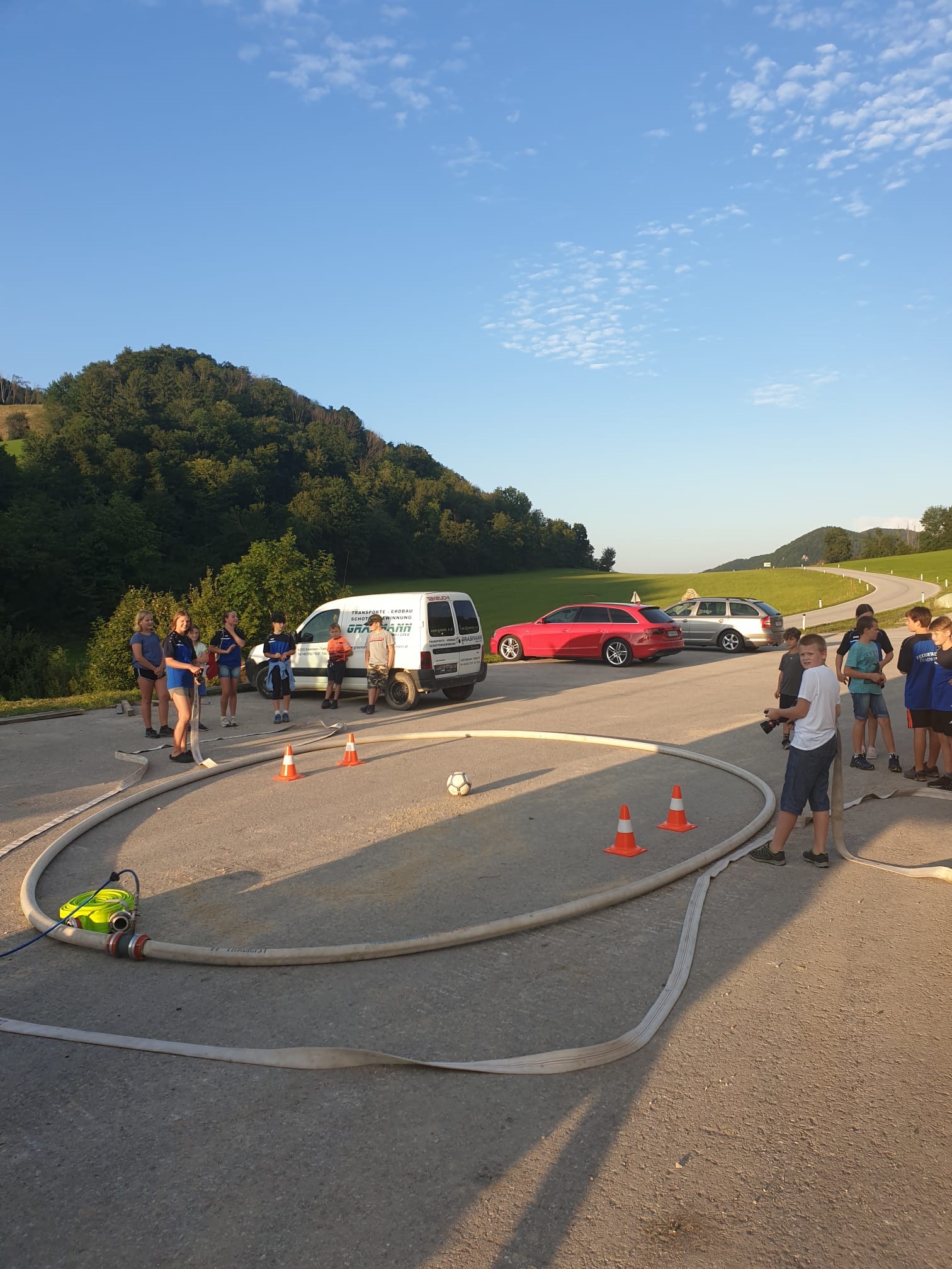 2 Verkehrsleitkegeln bilden das Tor. Mittels Hohlstrahlrohr versuchen den Ball ins gegnerische Tor zu spritzen. - "Feuerwehrschlauch richtig wickeln"