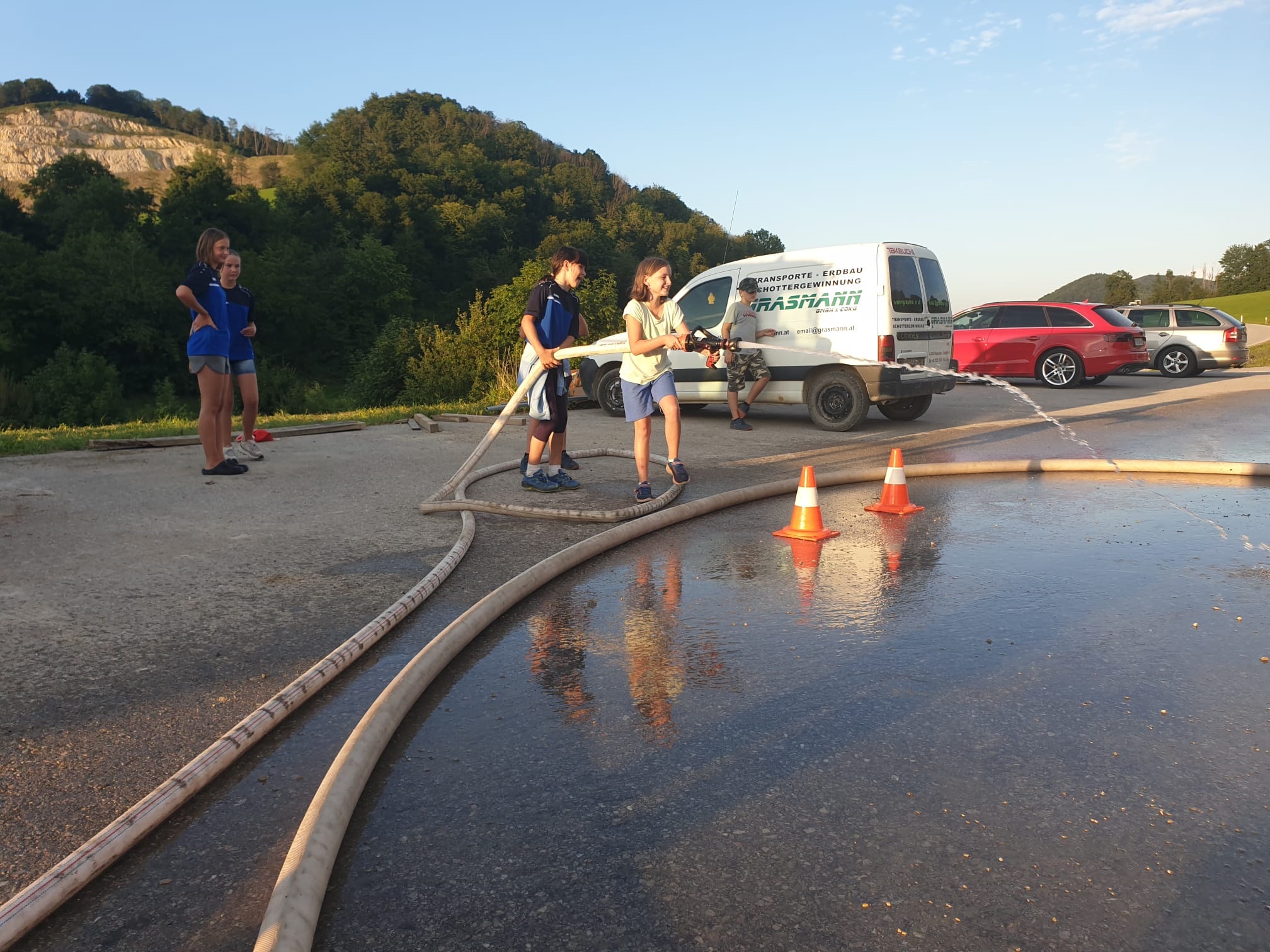 Anschließend Schlauchkegeln - Wasserflaschen umschmeißen mit C-Schlauch - Wettkampf zweier Gruppen, wer als Schnellster einen Golfball durch einen B-Schlauch durchbringt.