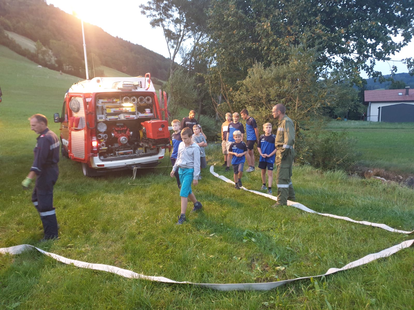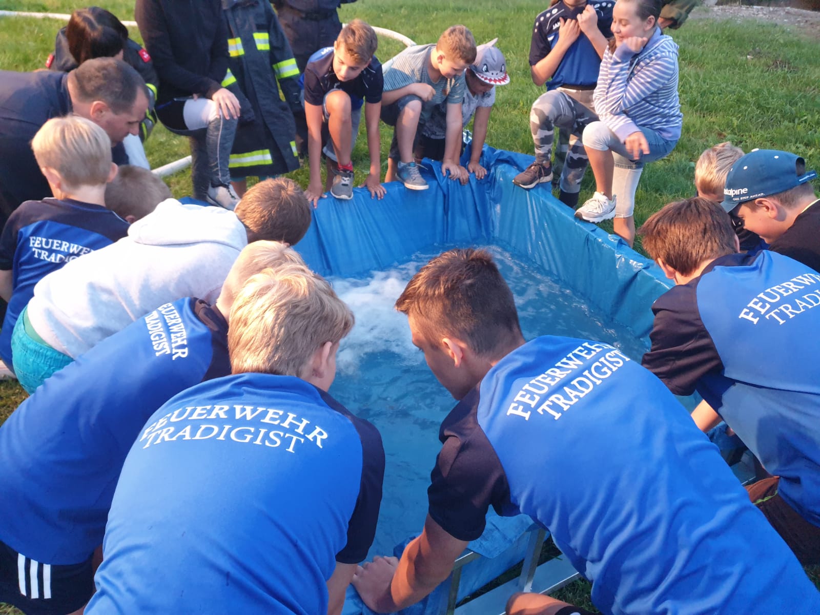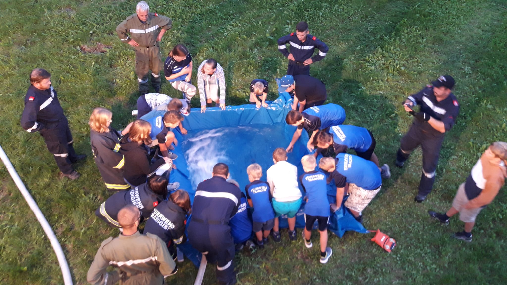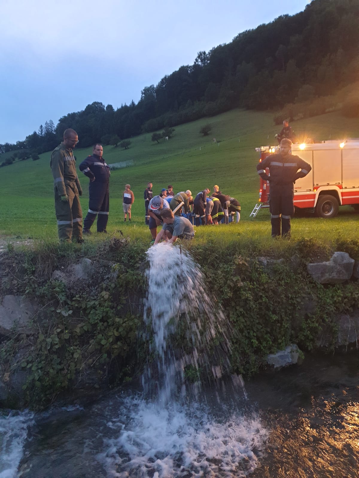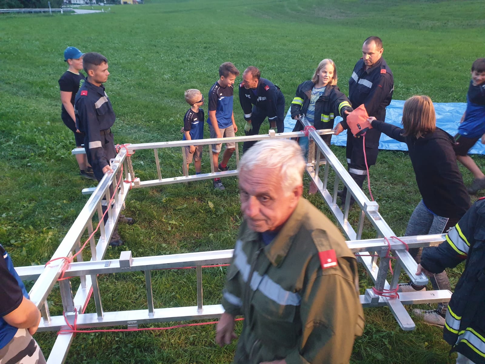 Danach wurde aus Steckleitern und einer Plane ein Auffangbecken (z.B. für austretende Schadstoffe) errichtet. Zur Demonstration wurde das Becken mit Wasser gefüllt und wieder ausgepumpt.