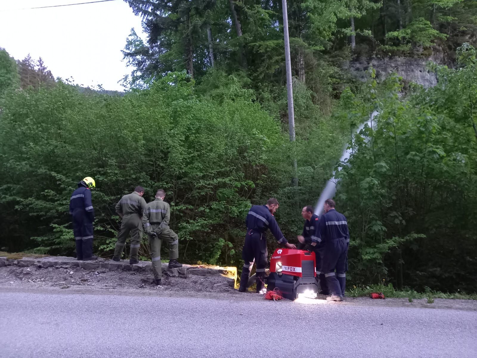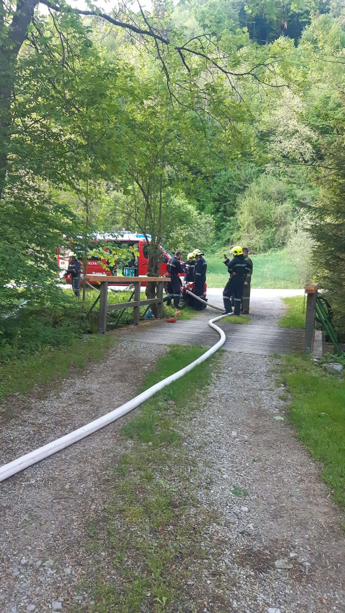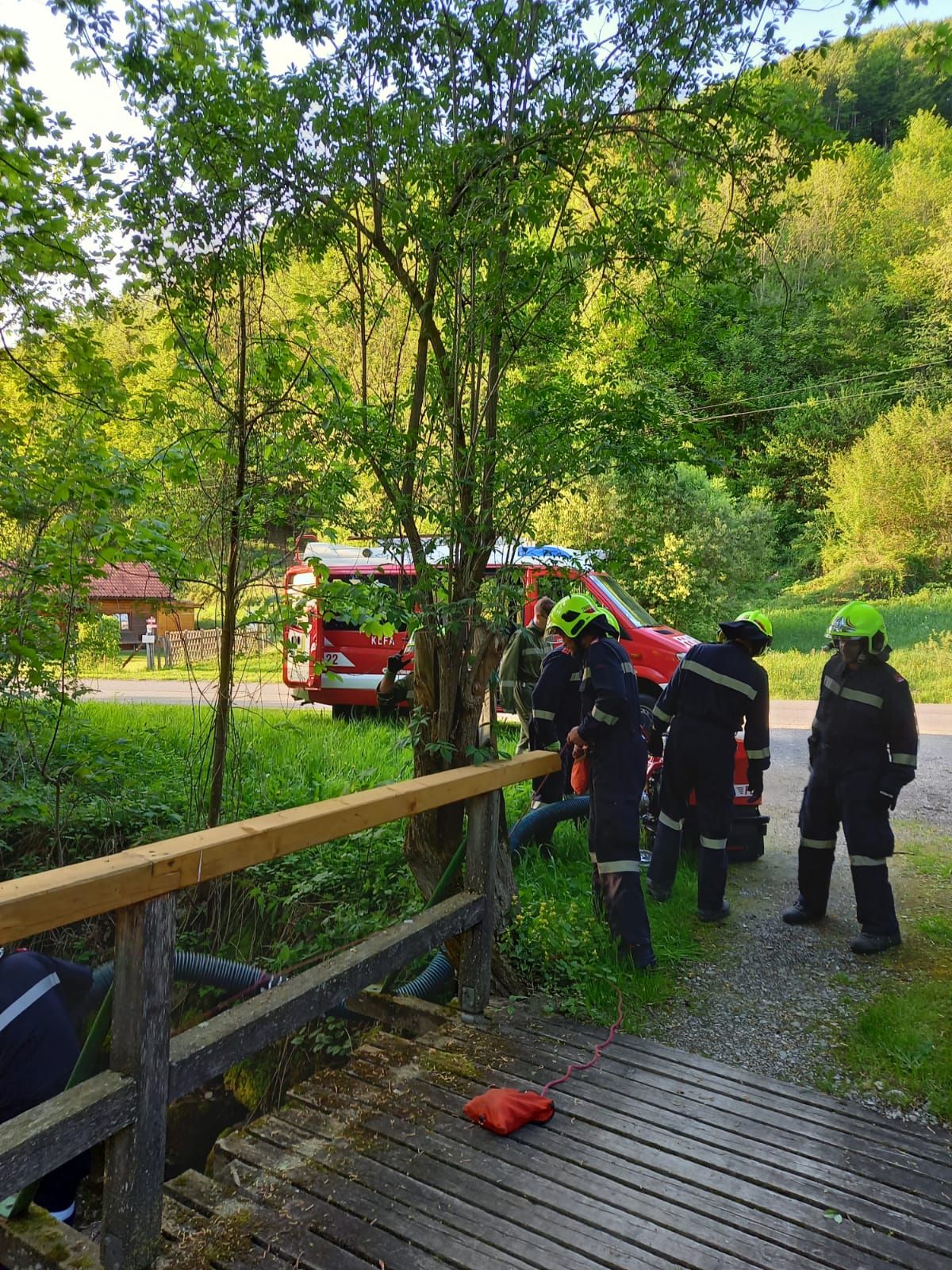 Am Abend desselben Tages wurde noch eine Übung mit der neuen Tragkraftspritze durchgeführt. Es wurde aus dem Bach angesaugt und eine Löschleitung aufgebaut.