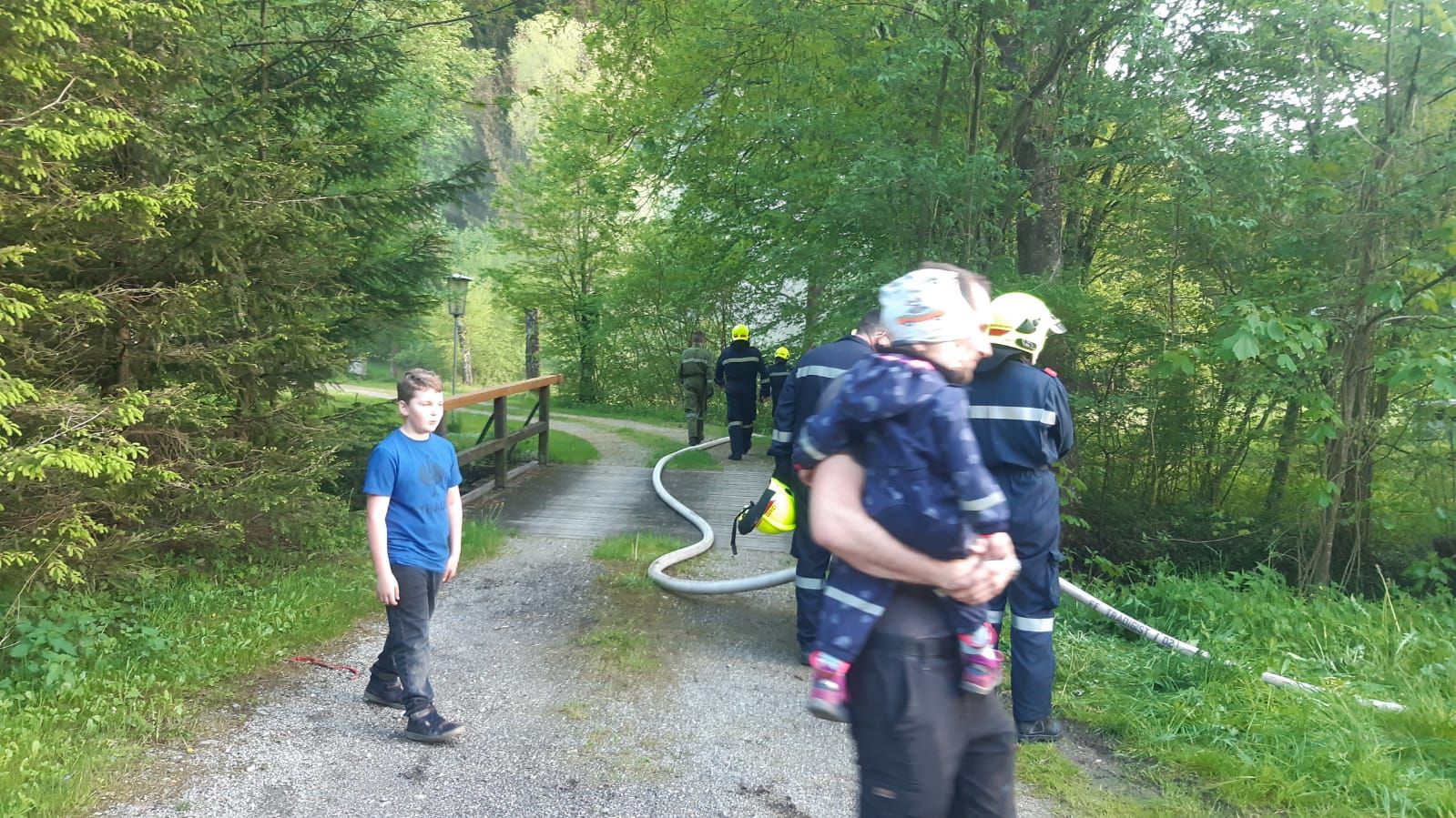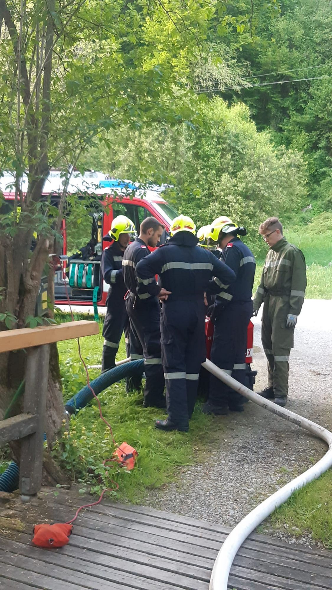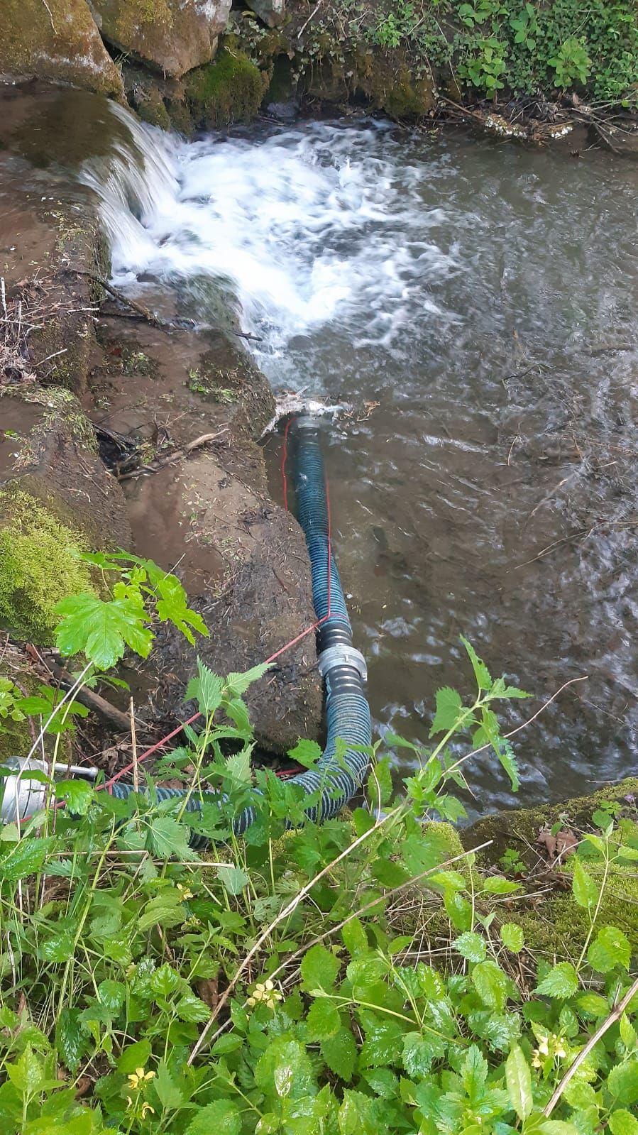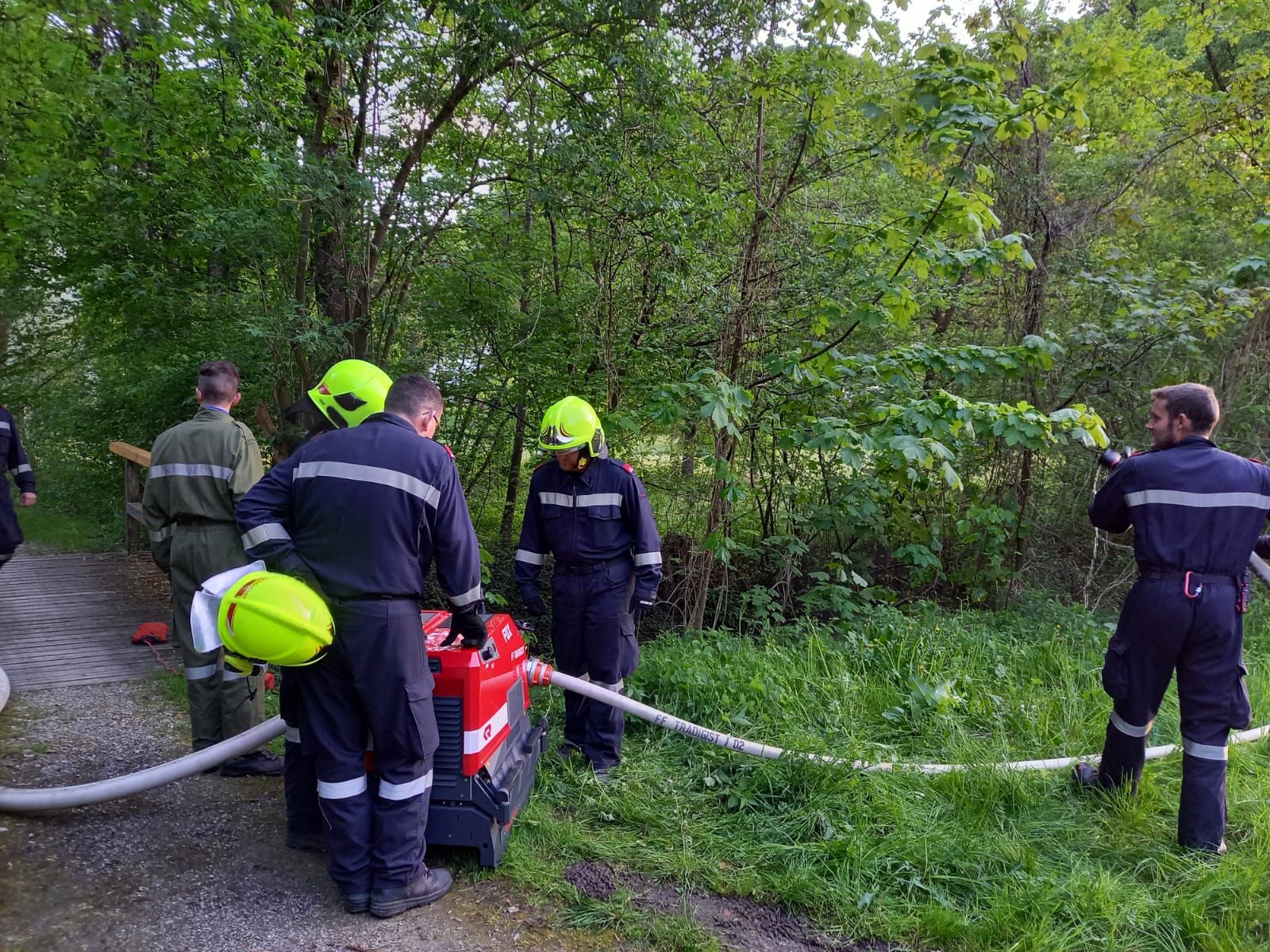 Am Abend desselben Tages wurde noch eine Übung mit der neuen Tragkraftspritze durchgeführt. Es wurde aus dem Bach angesaugt und eine Löschleitung aufgebaut.
