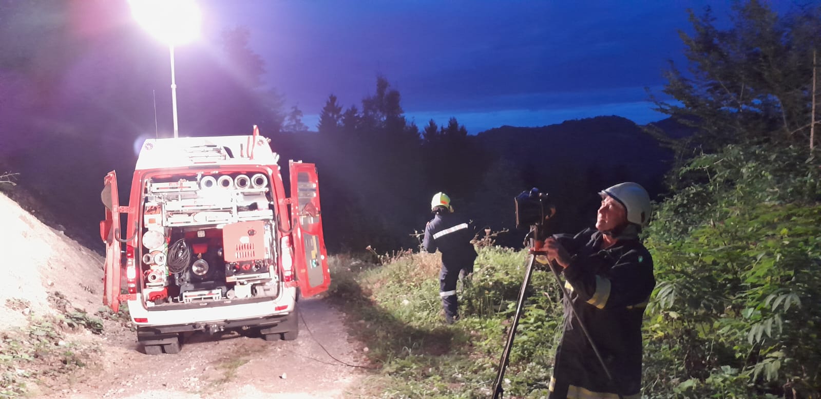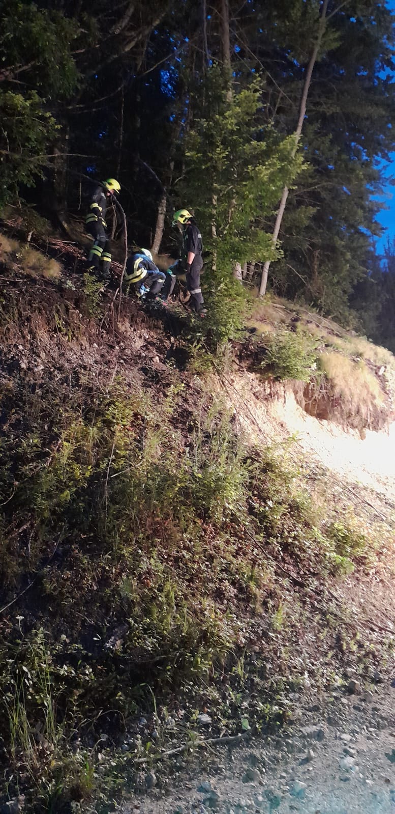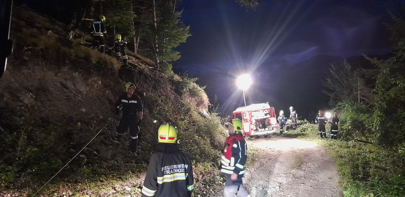 Übungsannahme war, daß ein PKW von einem Forstweg abgekommen sei und wieder zurück auf den Weg gezogen werden sollte. Zum Vergleich wurde auch die Bergung mit der Seilwinde des TLFA 3000 und einer Umlenkrolle durchgeführt.