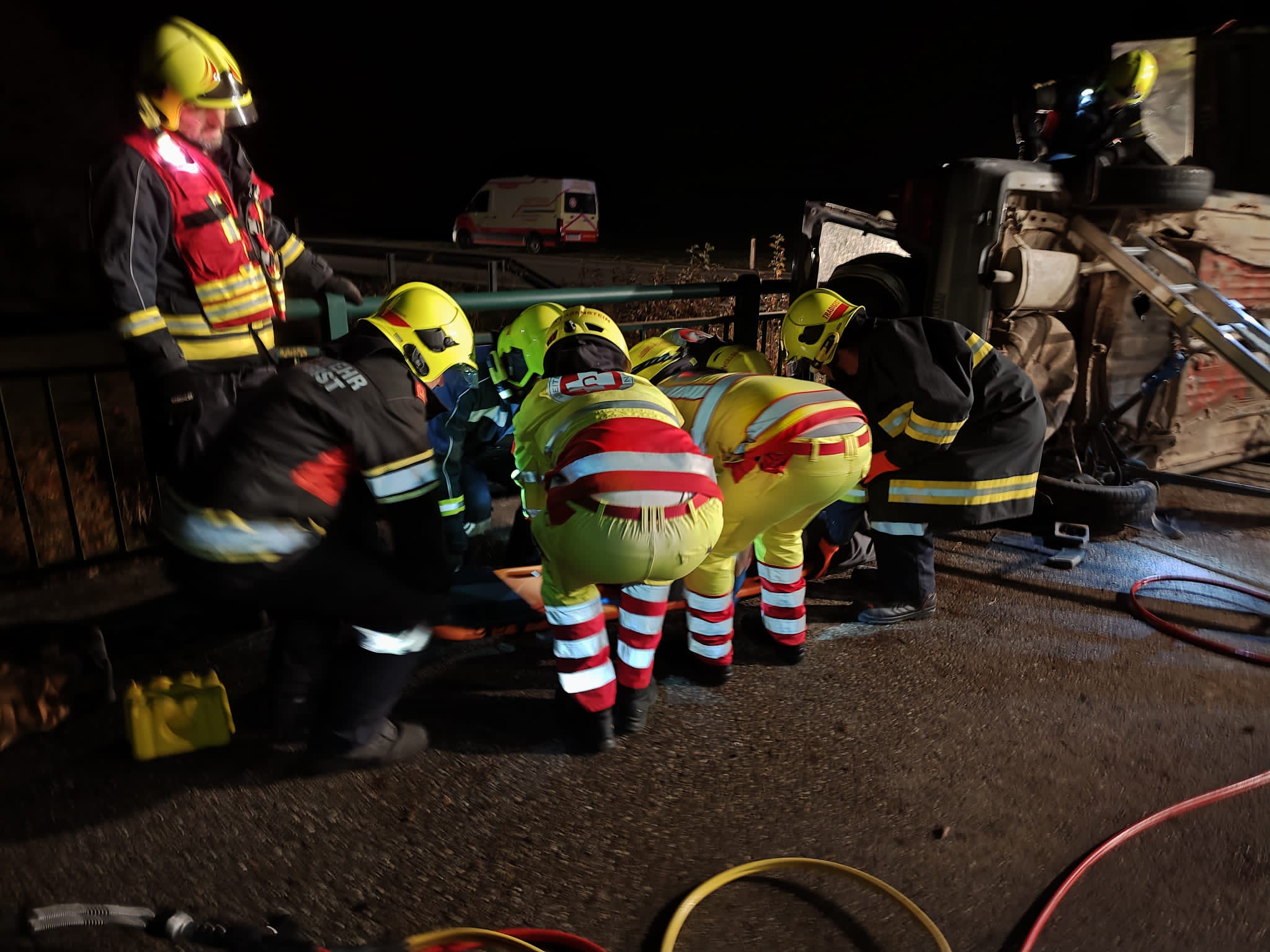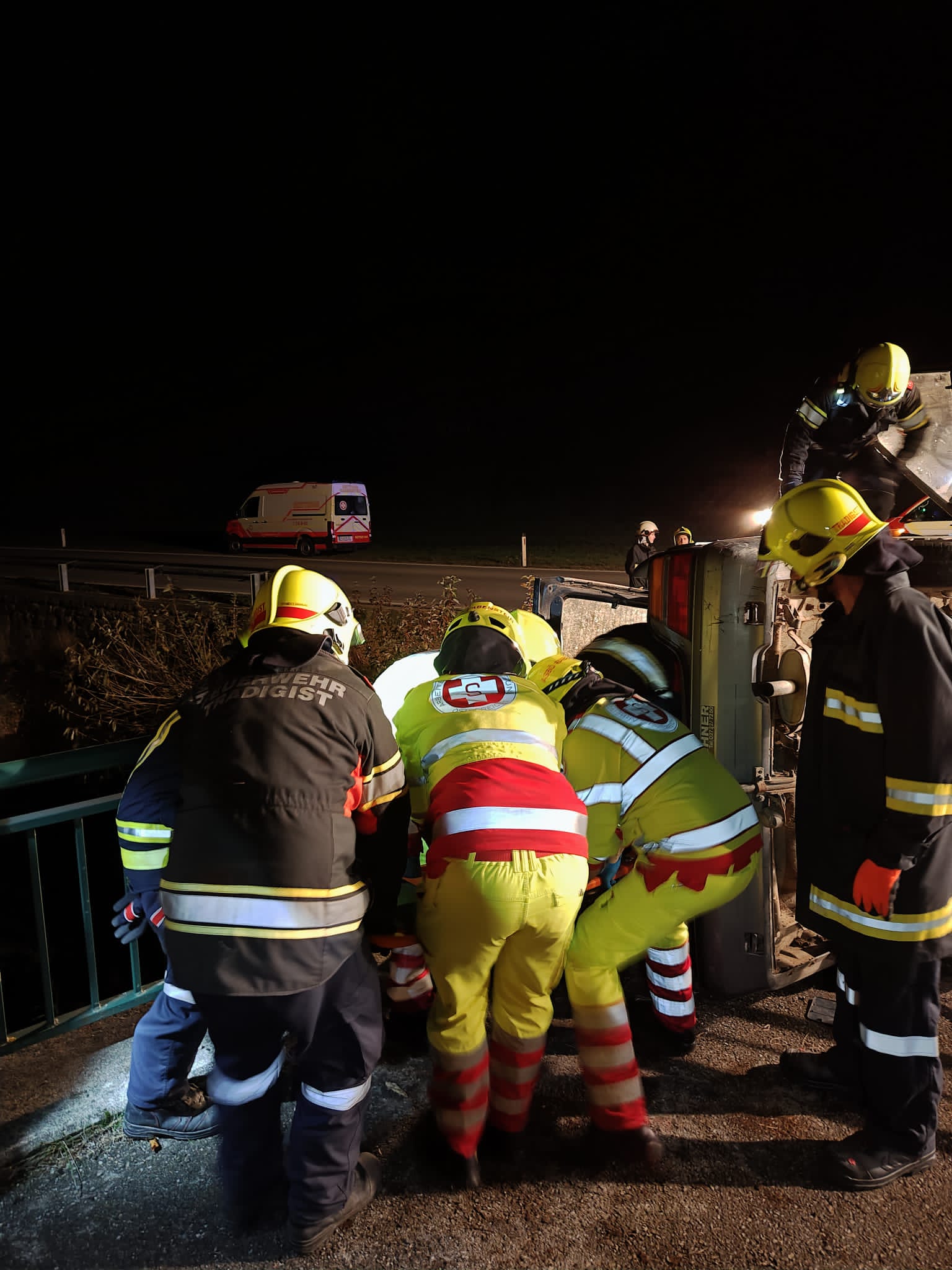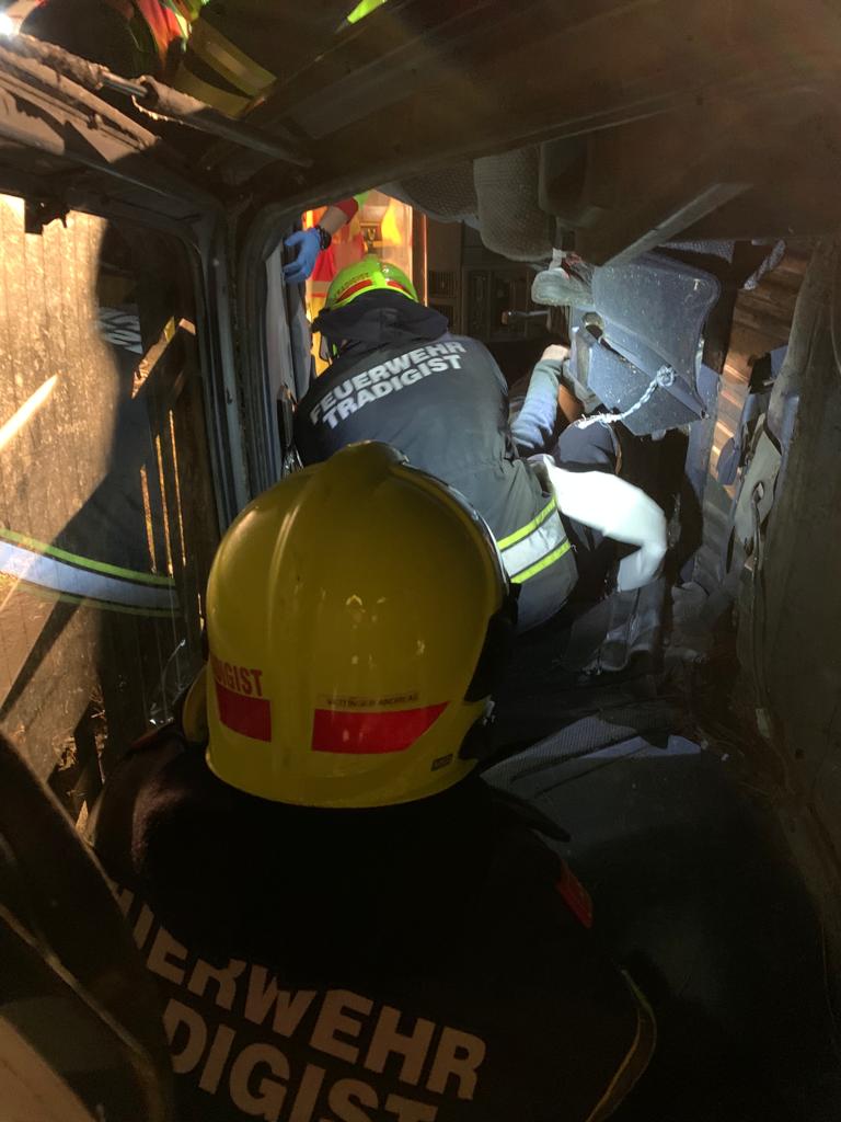 Das Fahrzeug musste als Erstes mittels Steckleitern stabilisiert werden, um ein Umkippen zu verhindern. Weiters wurde mittels hydraulischem Rettungsgerät sowohl über den Kofferraum als auch über die Beifahrerseite ein Zugang zum Patienten geschaffen. Gemeinsam mit den Rettungskräften des ASBÖ wurde die verletze Person mittels Spineboard über den Kofferraum aus dem Auto gerettet.