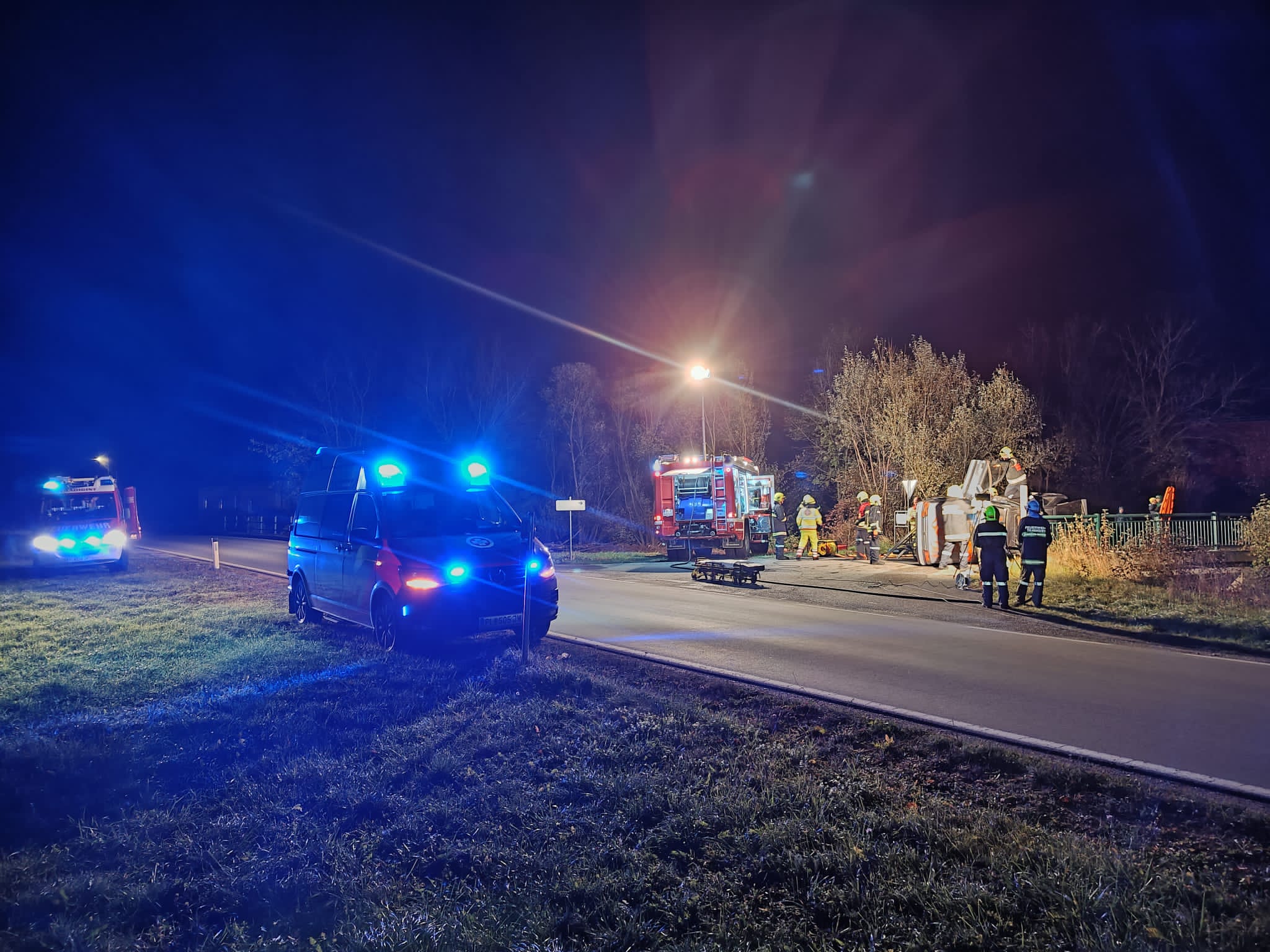 Übungsszenario war ein Verkehrsunfall mit einem PKW, welcher seitlich auf der Straße an einem Brückengeländer lag.