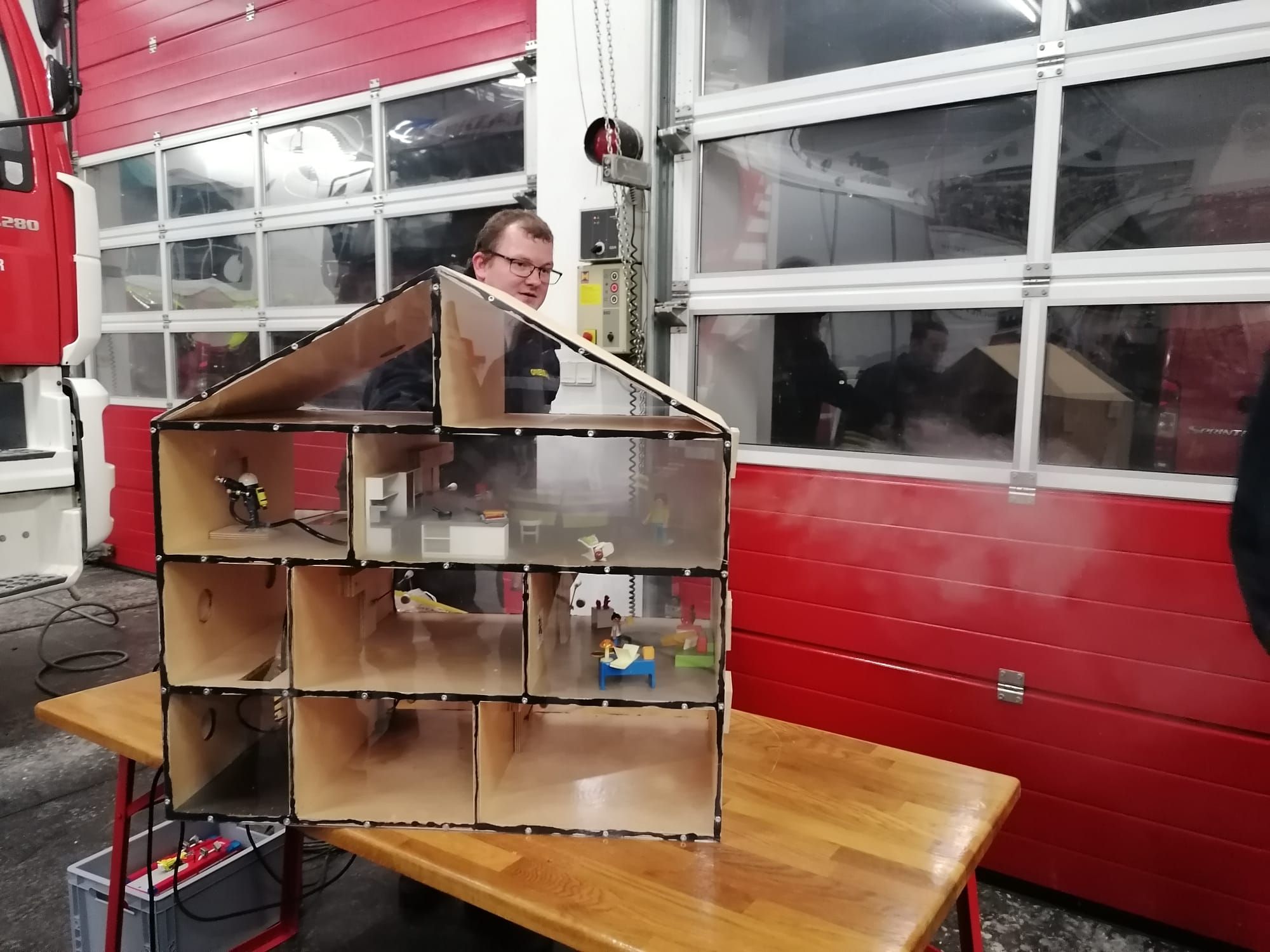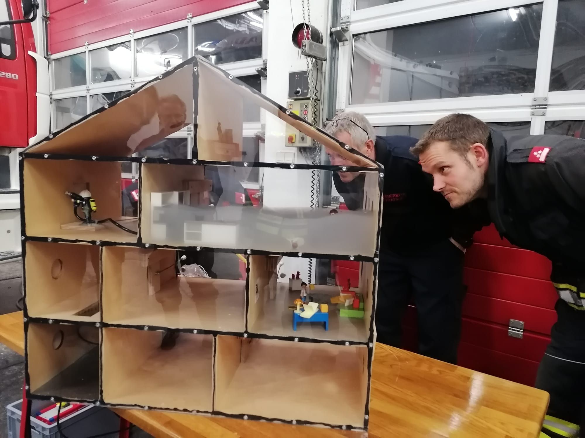 - Anhand eines selbstgebauten Modells zeigte uns unser Feuerwehrkollege aus Rabenstein, Michael Griessler, den Einsatz von einem Überdruckbelüfter in einem verrauchten Gebäude.