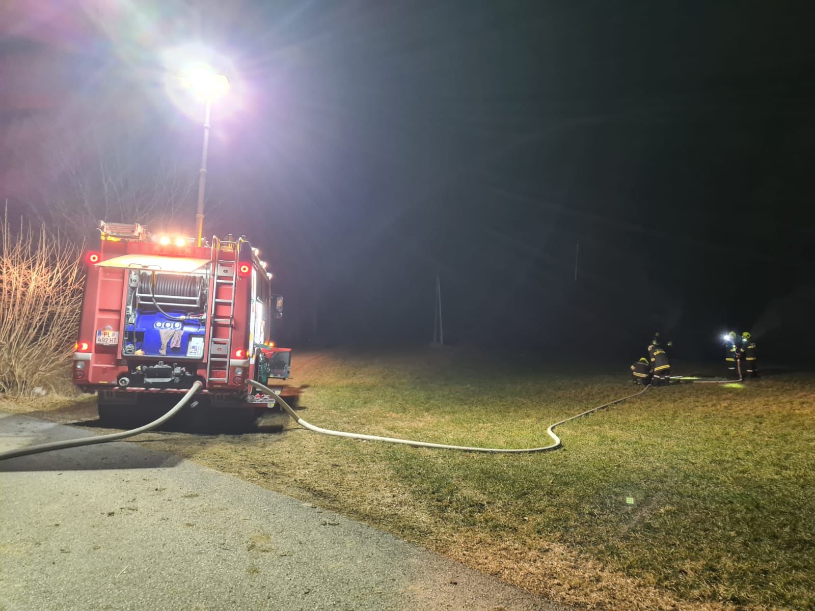 Übungsannahme bei der Gesamtübung im März war ein Flur- und Waldbrand. Zur Sicherstellung der Wasserversorgung wurde eine Tragkraftspritze (TS) beim Gehöft Suppan in Stellung gebracht.
