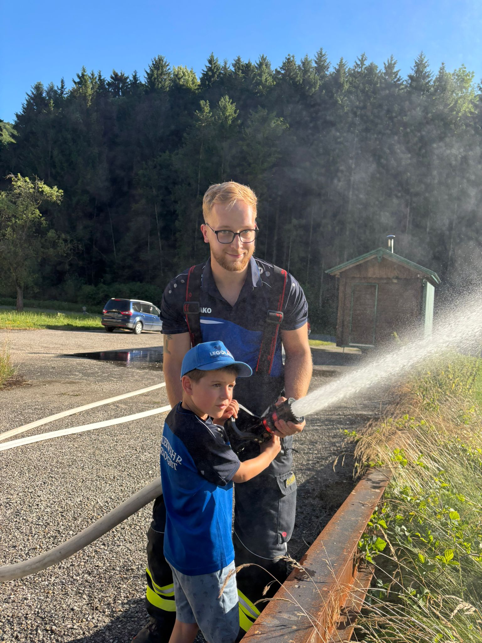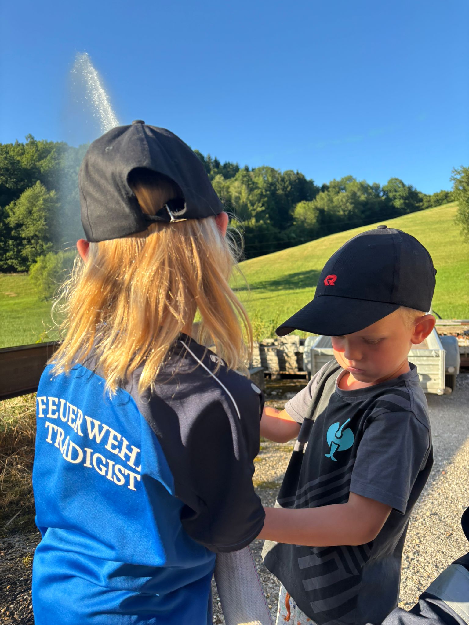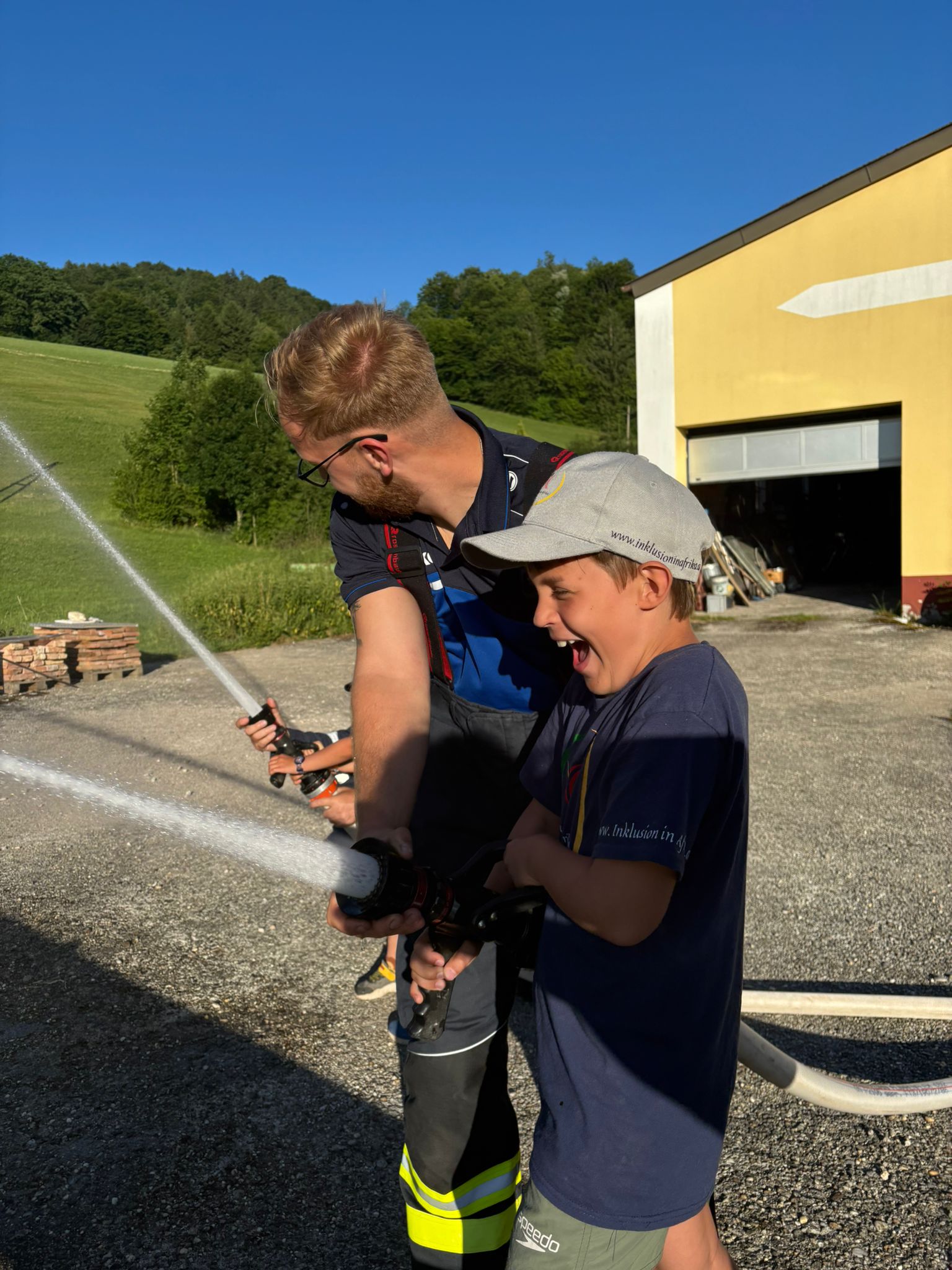Zum Abschluss versammelten wir uns im Feuerwehrhaus. Dort stellten wir das Hydroschild auf, welches für große Begeisterung sorgte – die Kinder konnten sich damit ordentlich abkühlen und hatten sichtlich Spaß dabei.